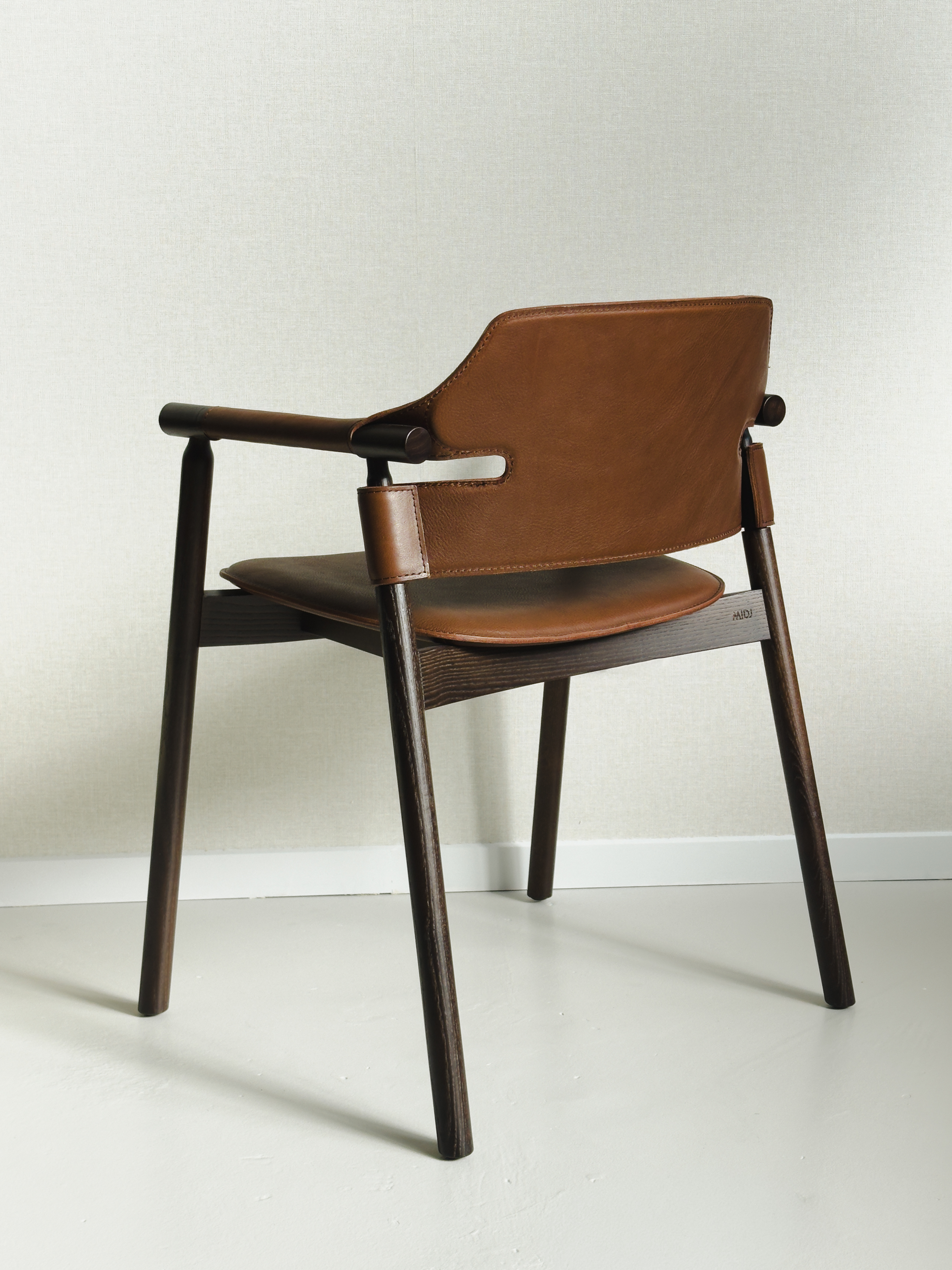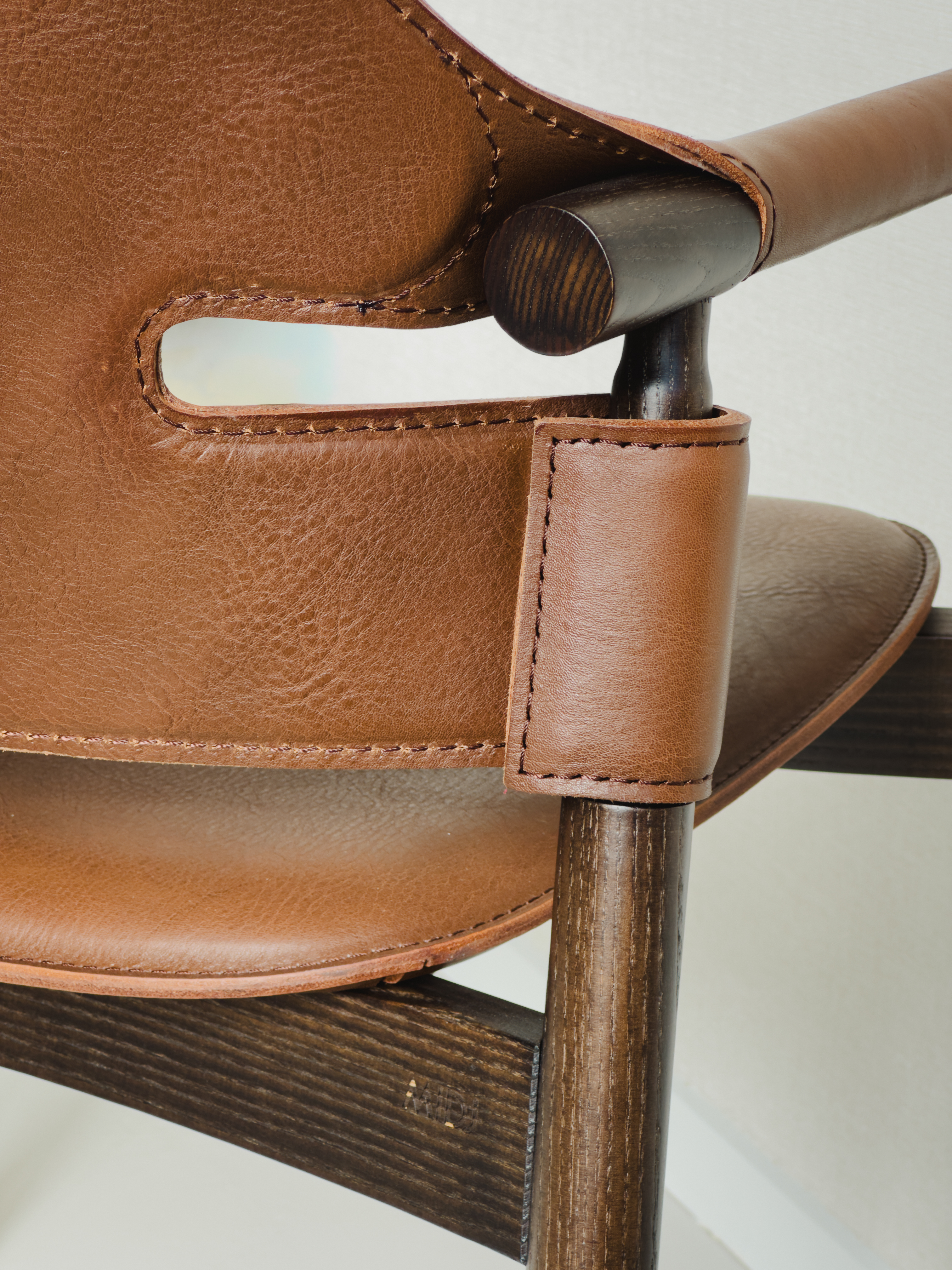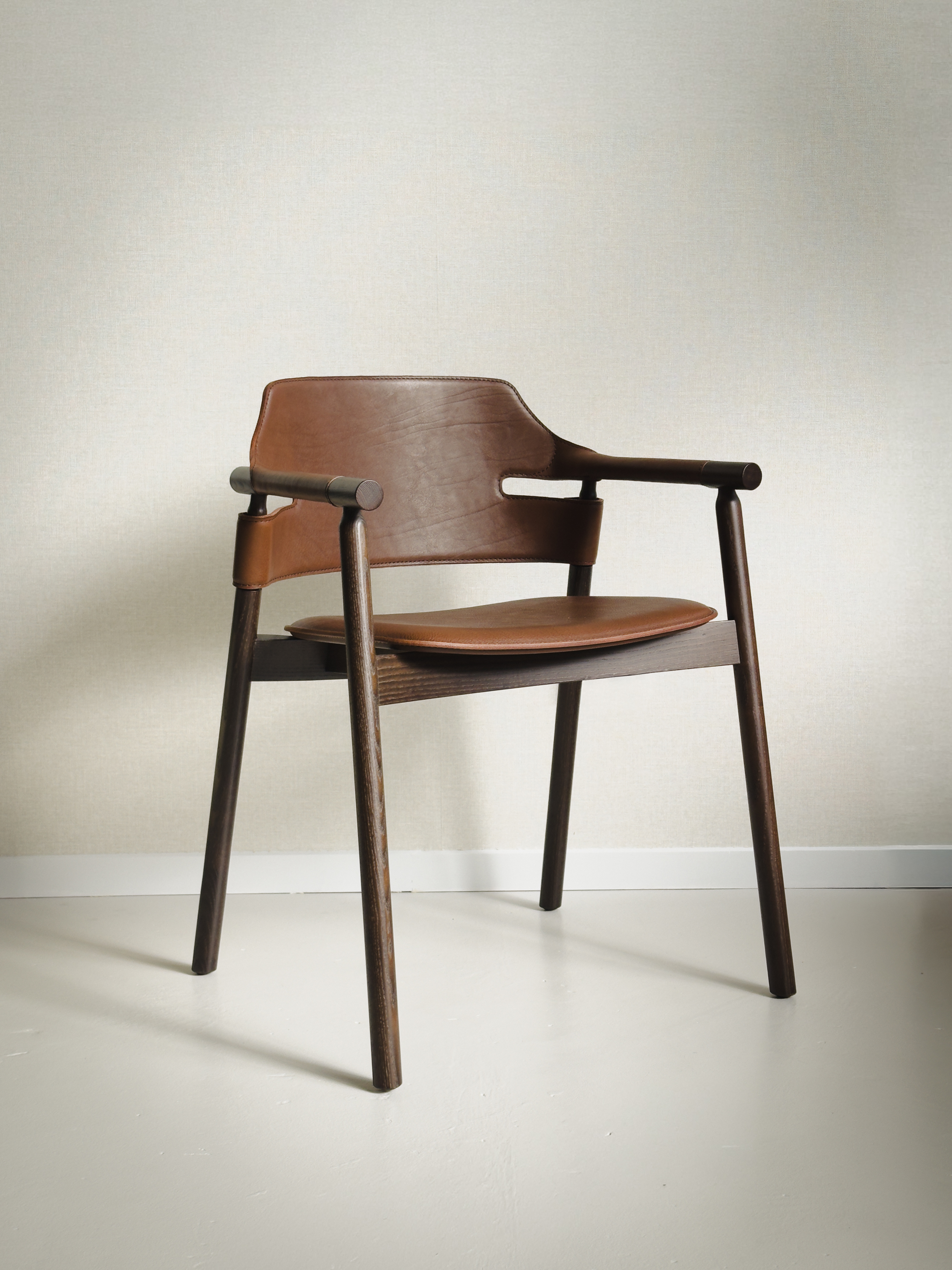 Armchair with wooden frame, available in a range of wood finishes. Seat and backrest upholstered in hide or tuscan hide.