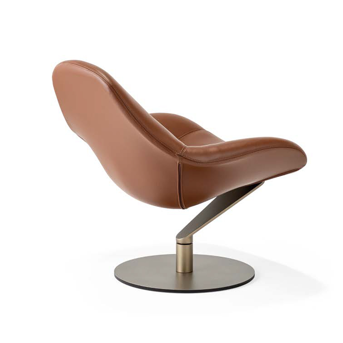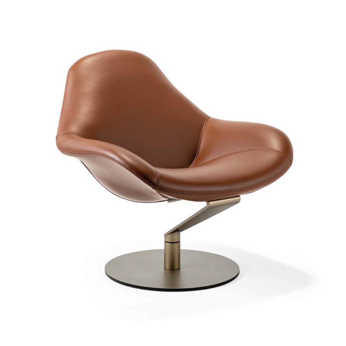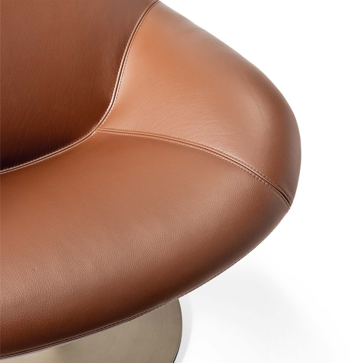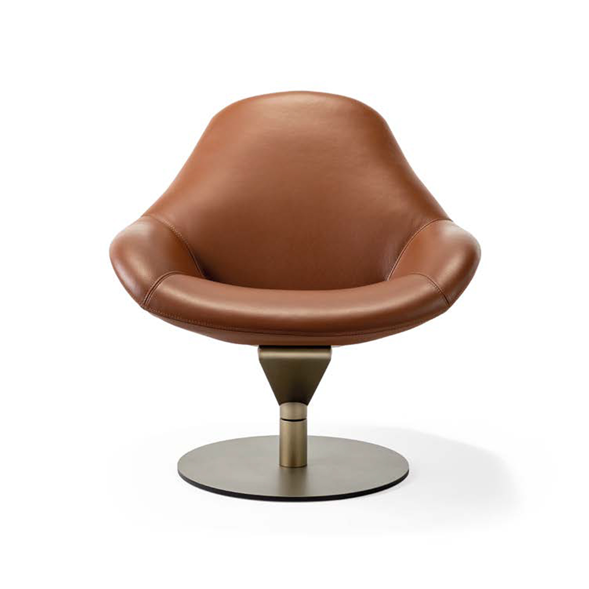 Swivel armchair upholstered in a wide range of leather or fabric options. Round metal base available in the finishes satin finish brass, dark brass, titanium or titanium dark finish.