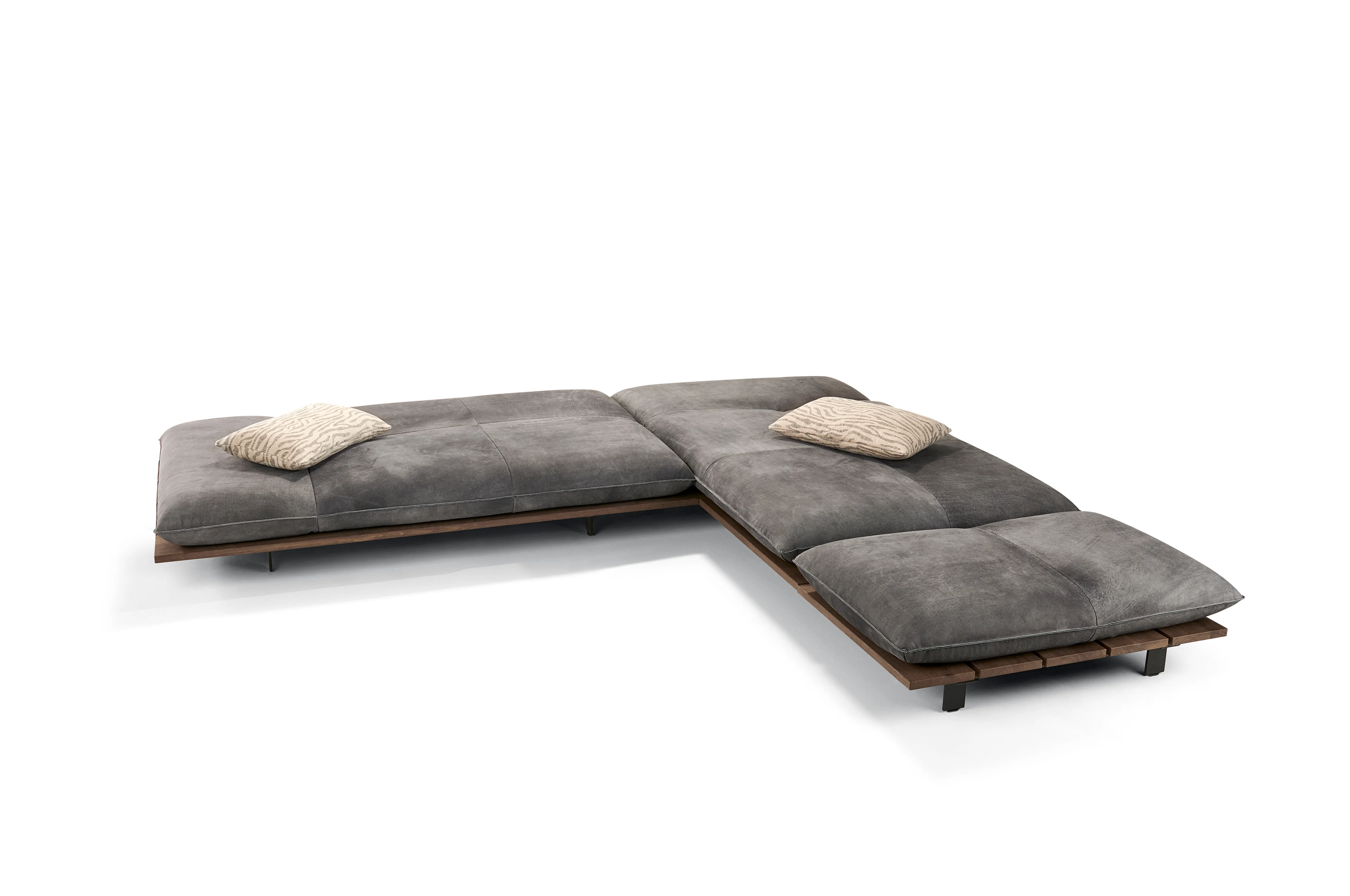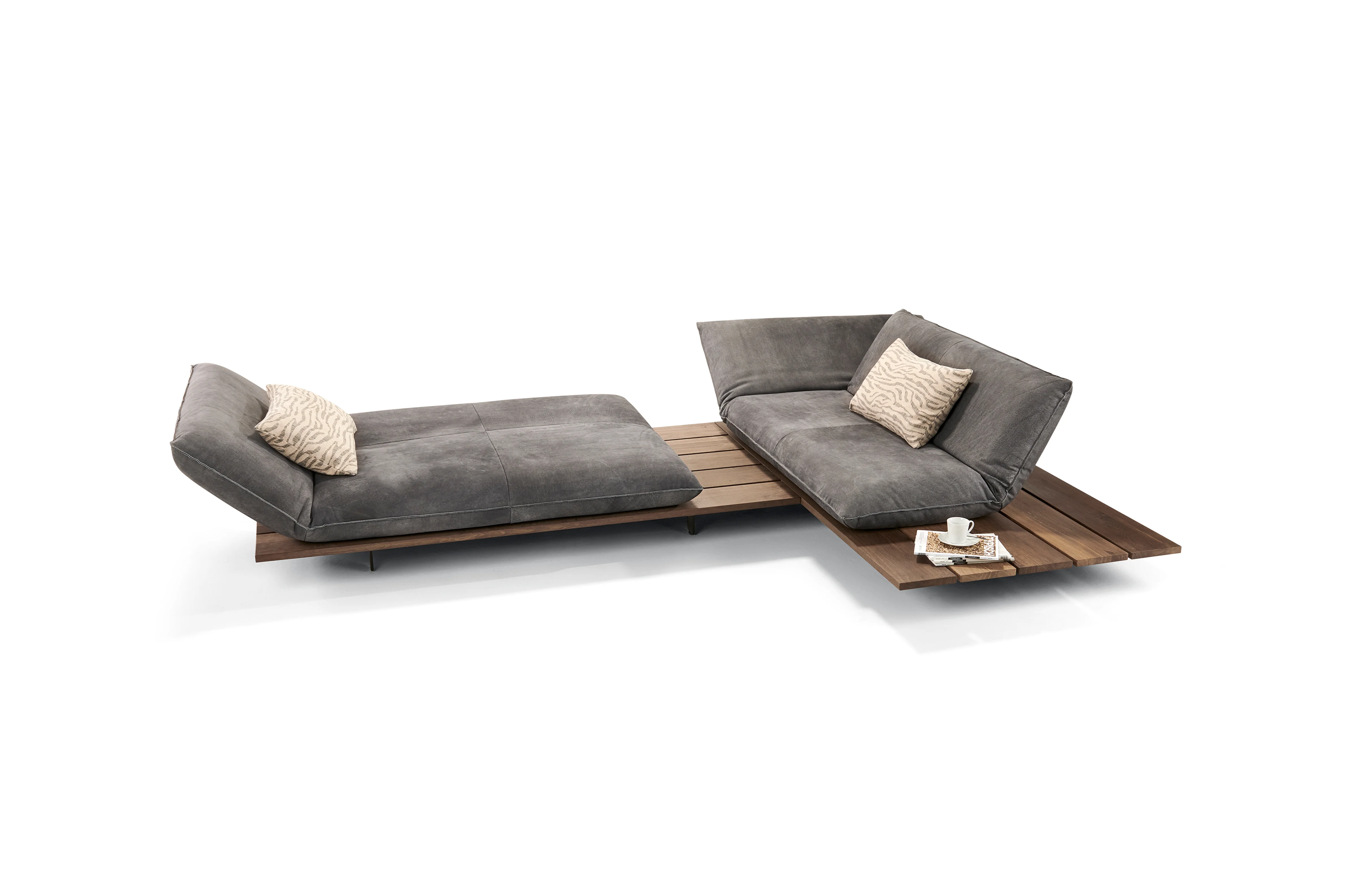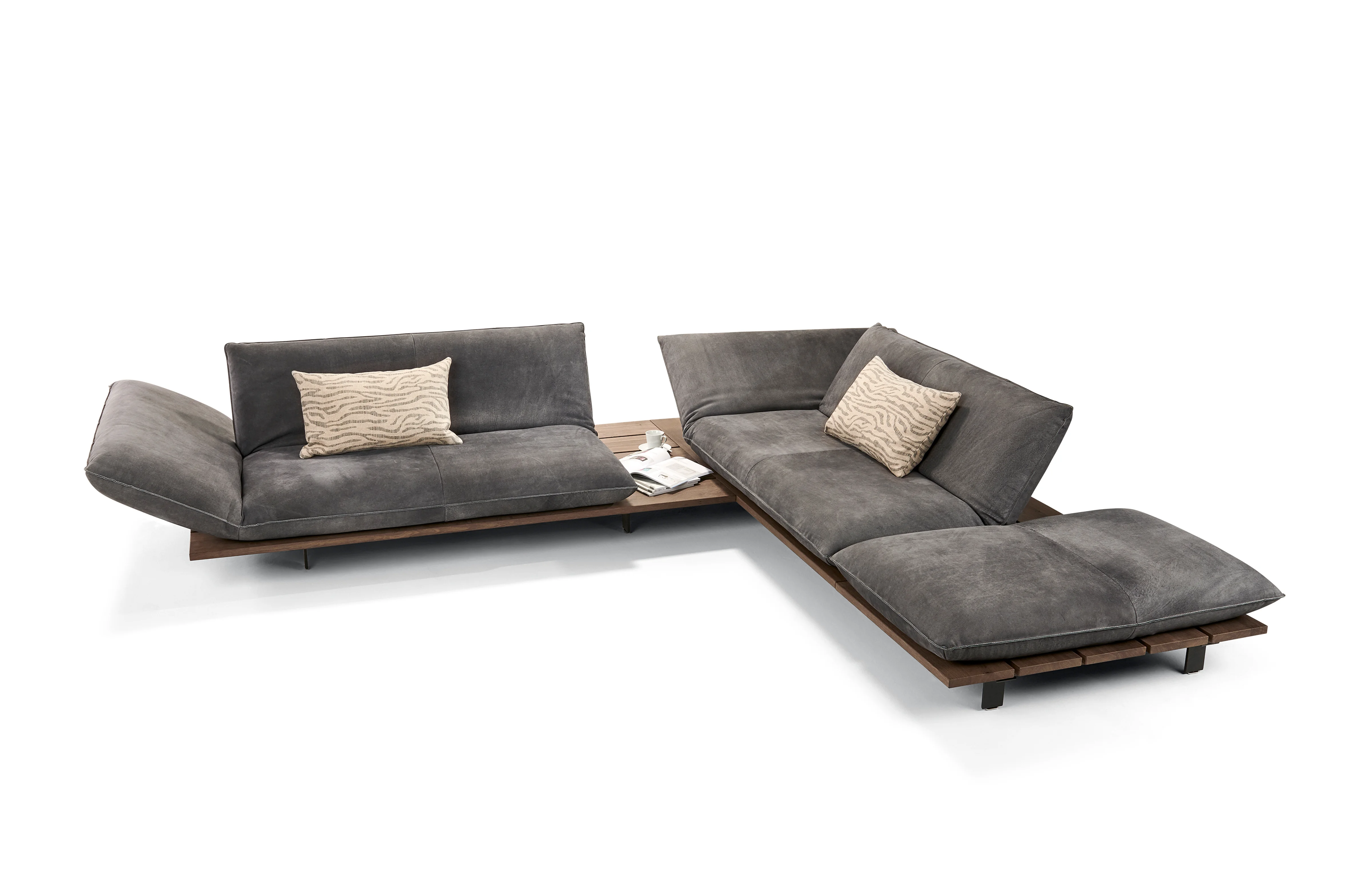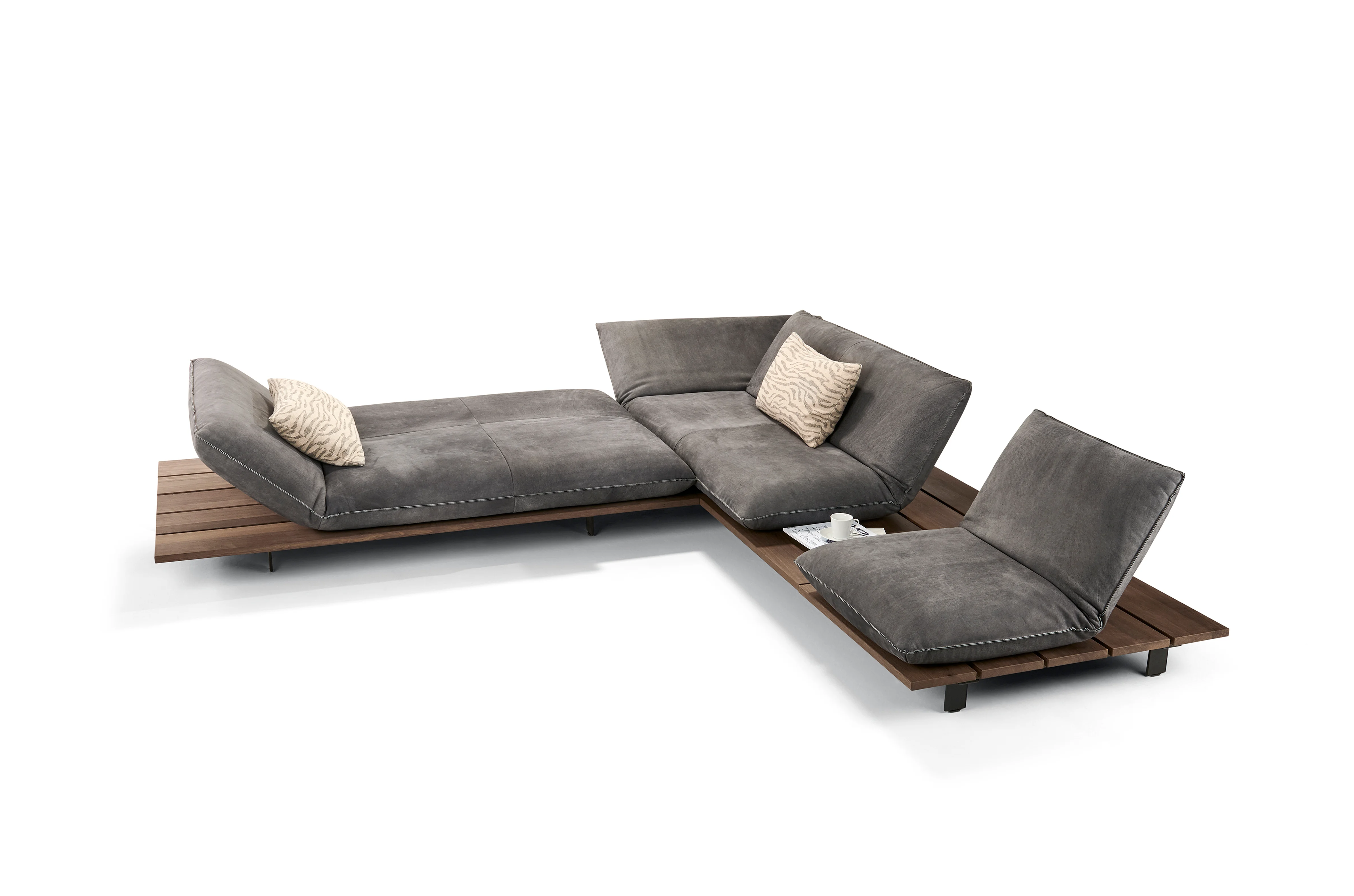 A stylish and functional sofa fixed to a high quality solid wood plateau upholstered for a modern look. With two sofa units it is possible to form a cosy corner setting. Due to the manual or motorized lateral seat adjustment a practical storage area arises besides the sofa.