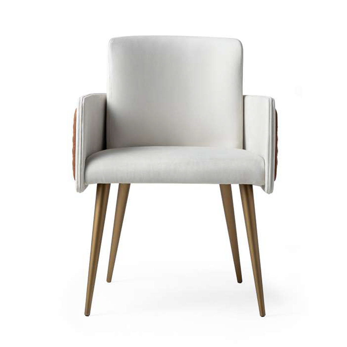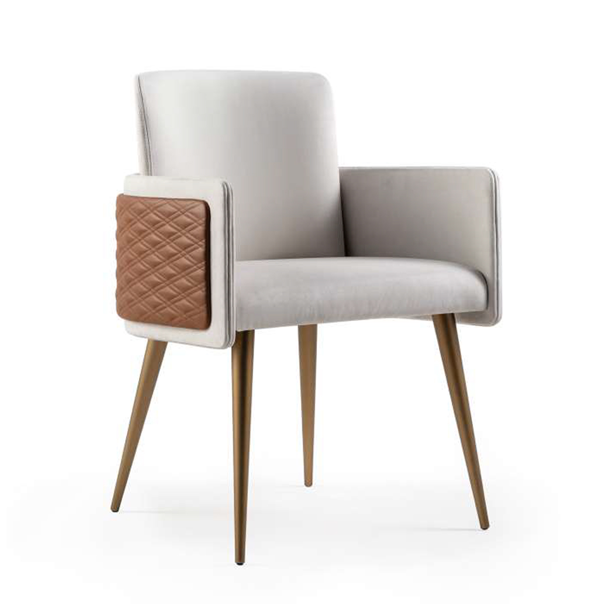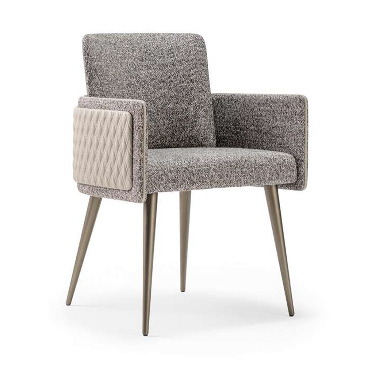 Dining arm chair with wooden structure and padded seat available in a range of fabric or leather options. Quilted external cover available in 5 different quilting designs. Wooden legs available in oakwood beluga finish, satin brass, dark brass, bronze or titanium finish.