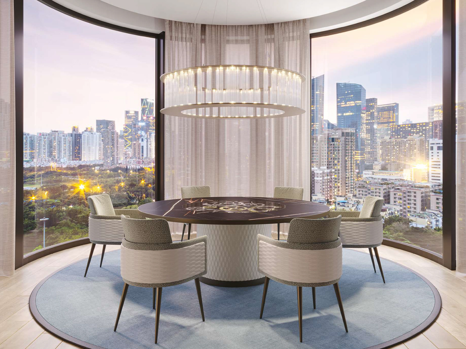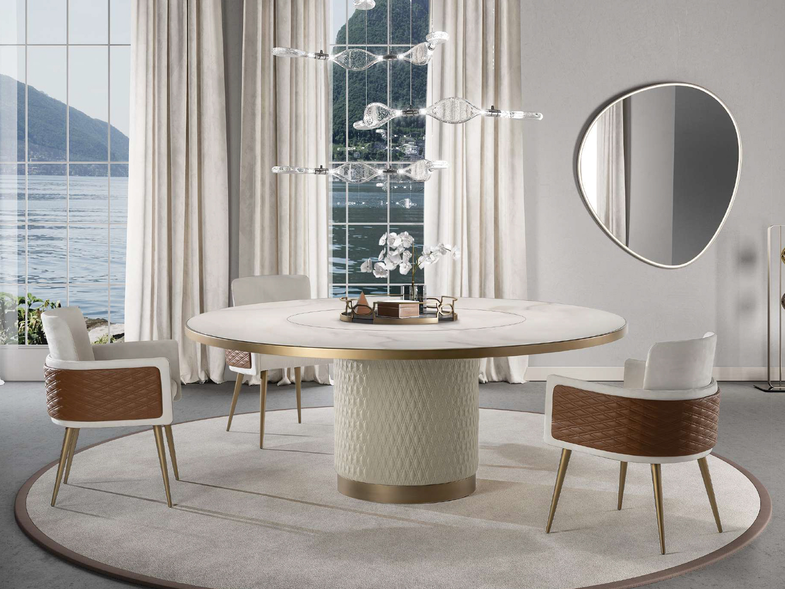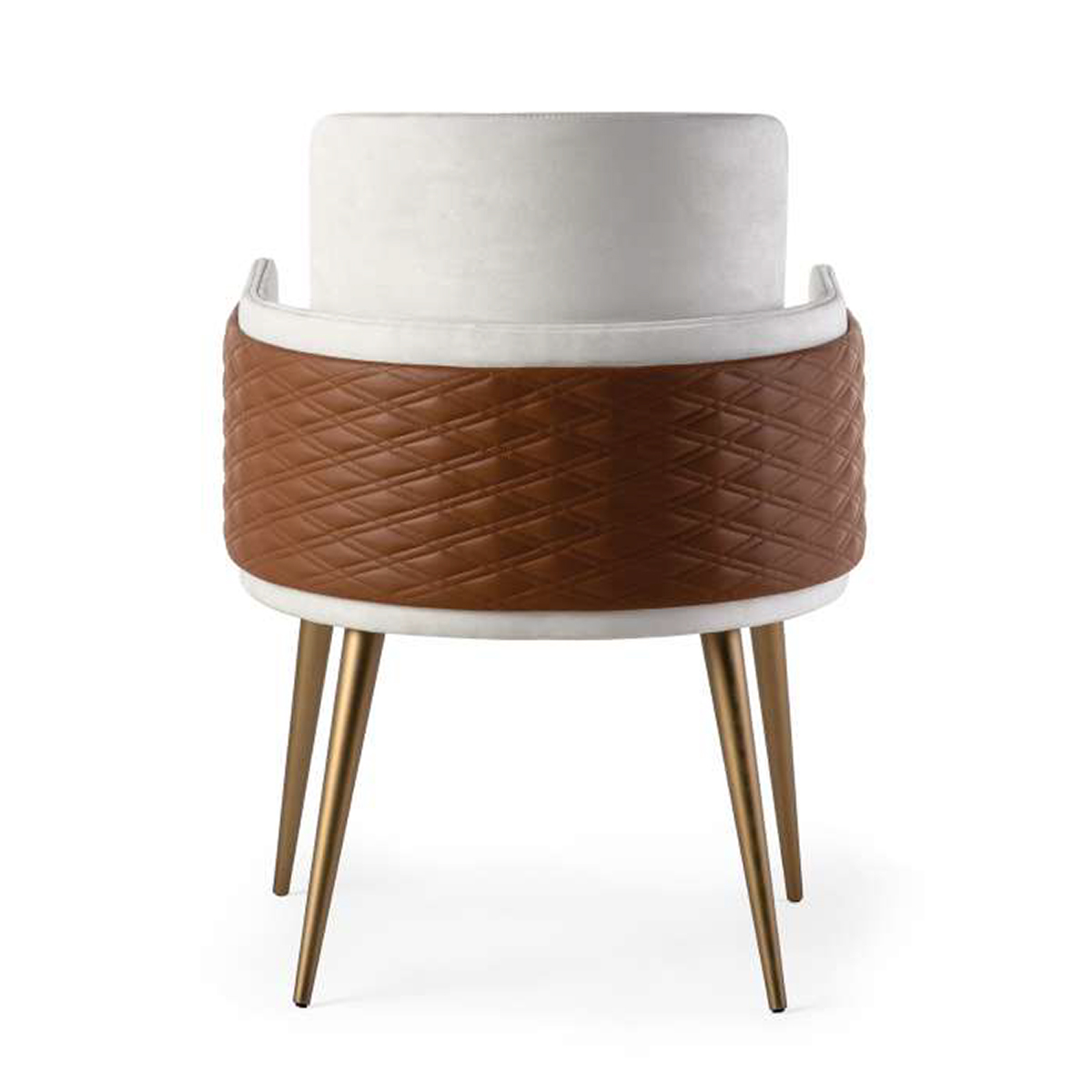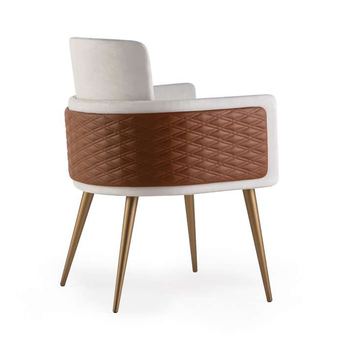 Dining arm chair with wooden structure and padded seat available in a range of fabric or leather options. Quilted external cover available in 5 different quilting designs. Wooden legs available in oakwood beluga finish, satin brass, dark brass, bronze or titanium finish.