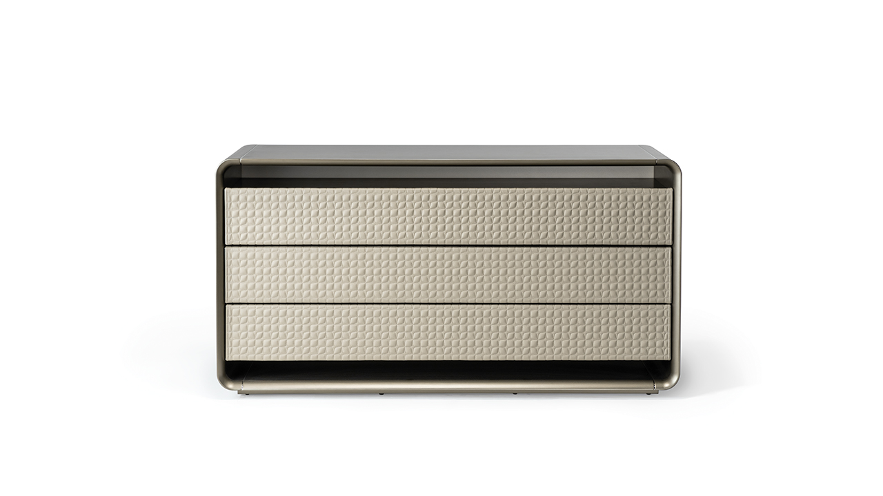Chest of drawers with structure in shaped rounded wood in bronze, brass, dark brass or titanium finishing. Equipped with three drawers with fronts covered in leather with quilting.