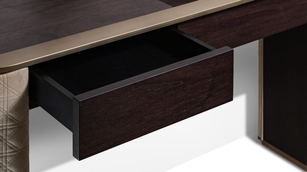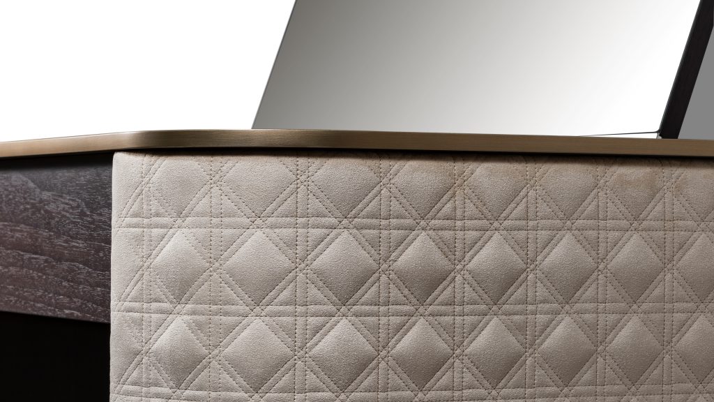 Dressing table with one drawer and a flap with mirror and lighting. Structure in shiny lacquered wood or in shiny ebony wood. Profile on the top in the satin brass finish and sides upholstered in pleated leather or fabric.