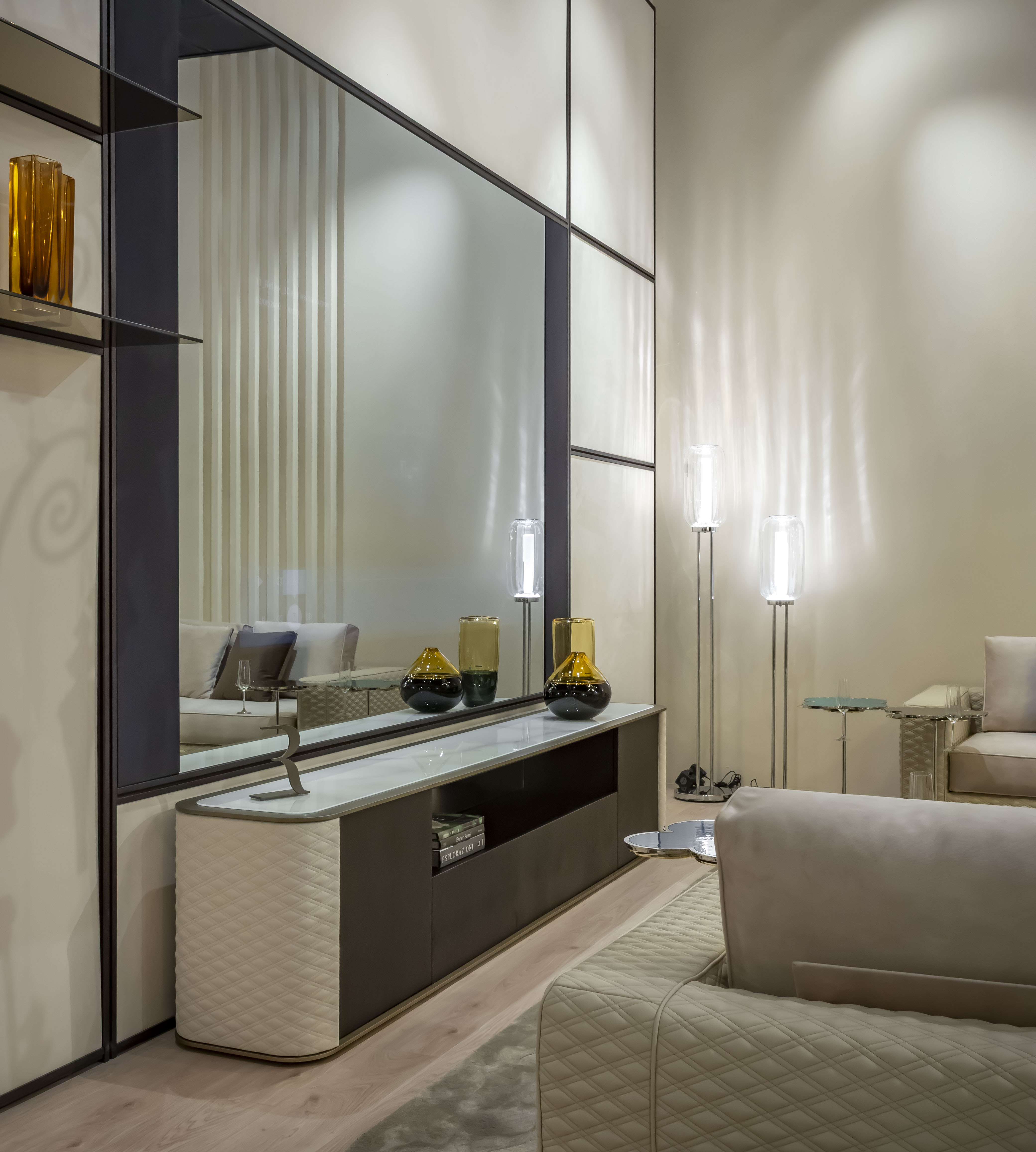 Low sideboard with two doors, one open space & one flap door. Structure available in shiny lacquered wood. Sides upholstered in San Marco quilted leather. Wooden top with a satin brass finish edge & marble glass insert. Doors with push-pull opening to internal transparent glass shelves. Open space with a mirrored glass backing.