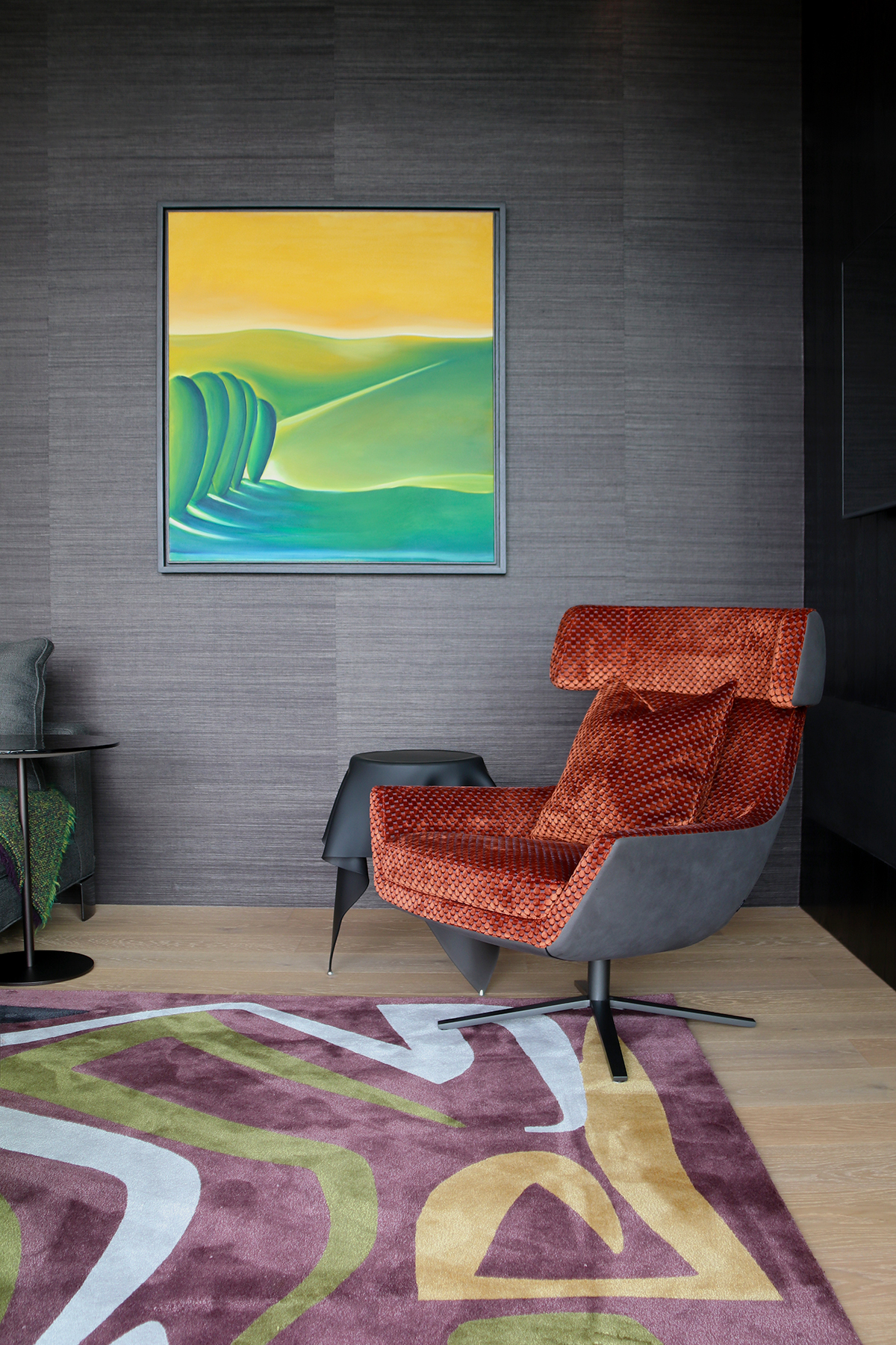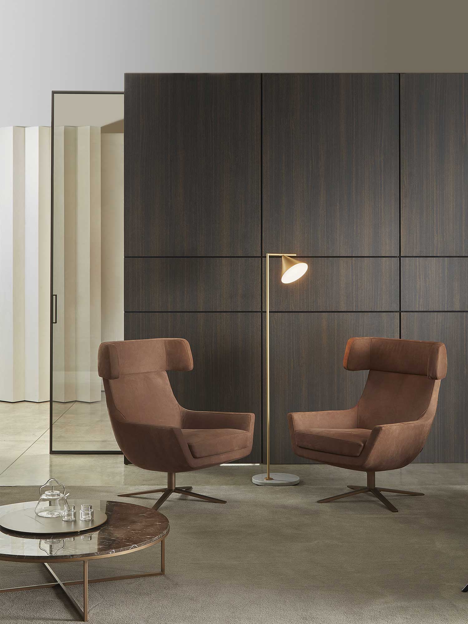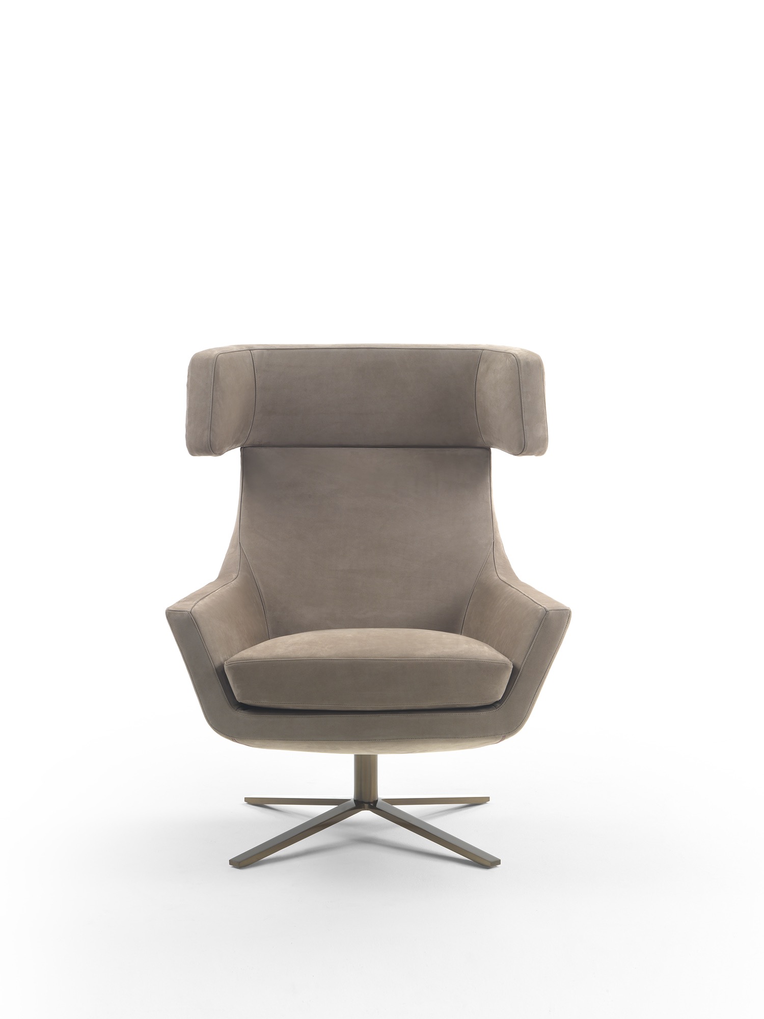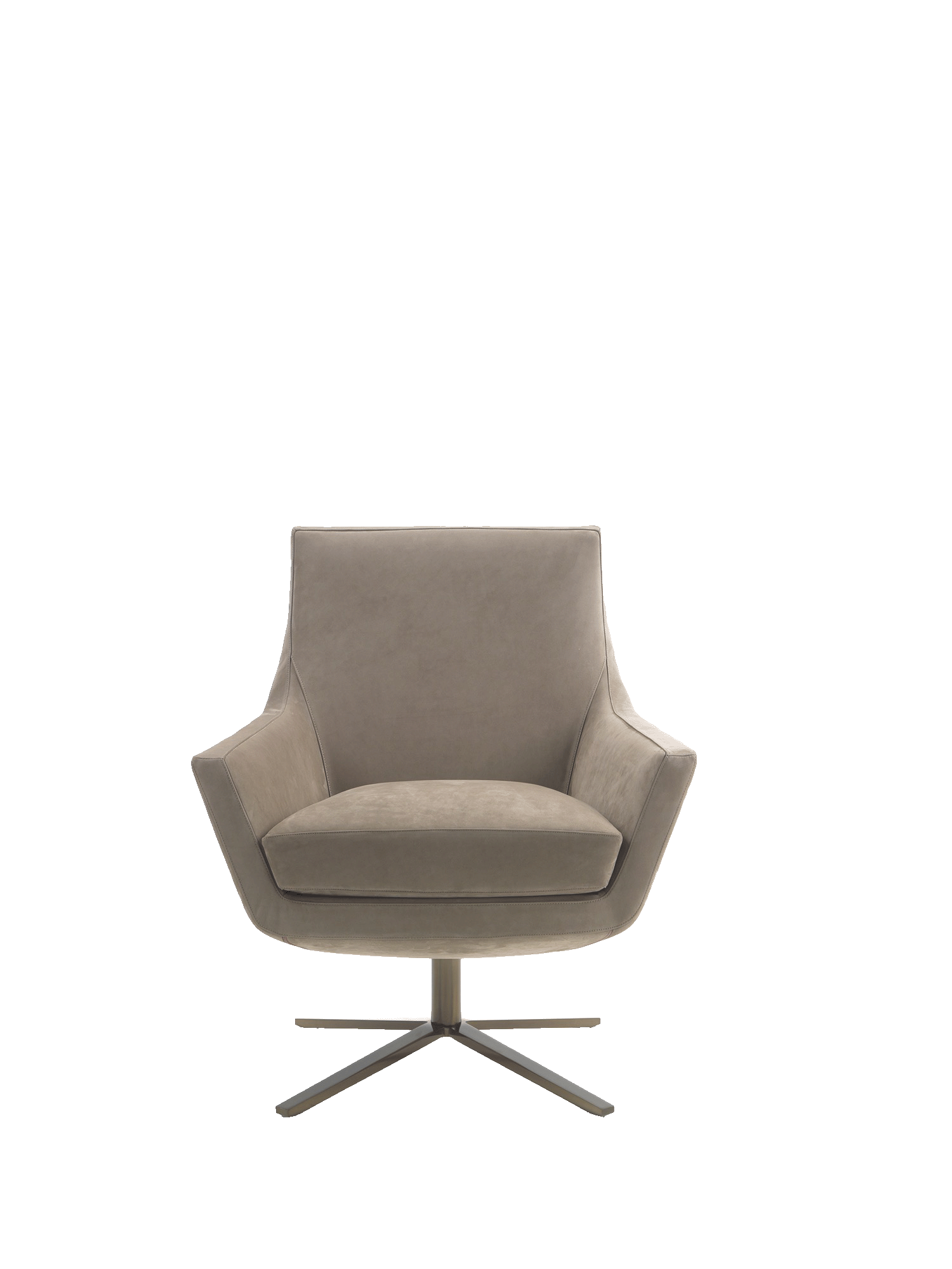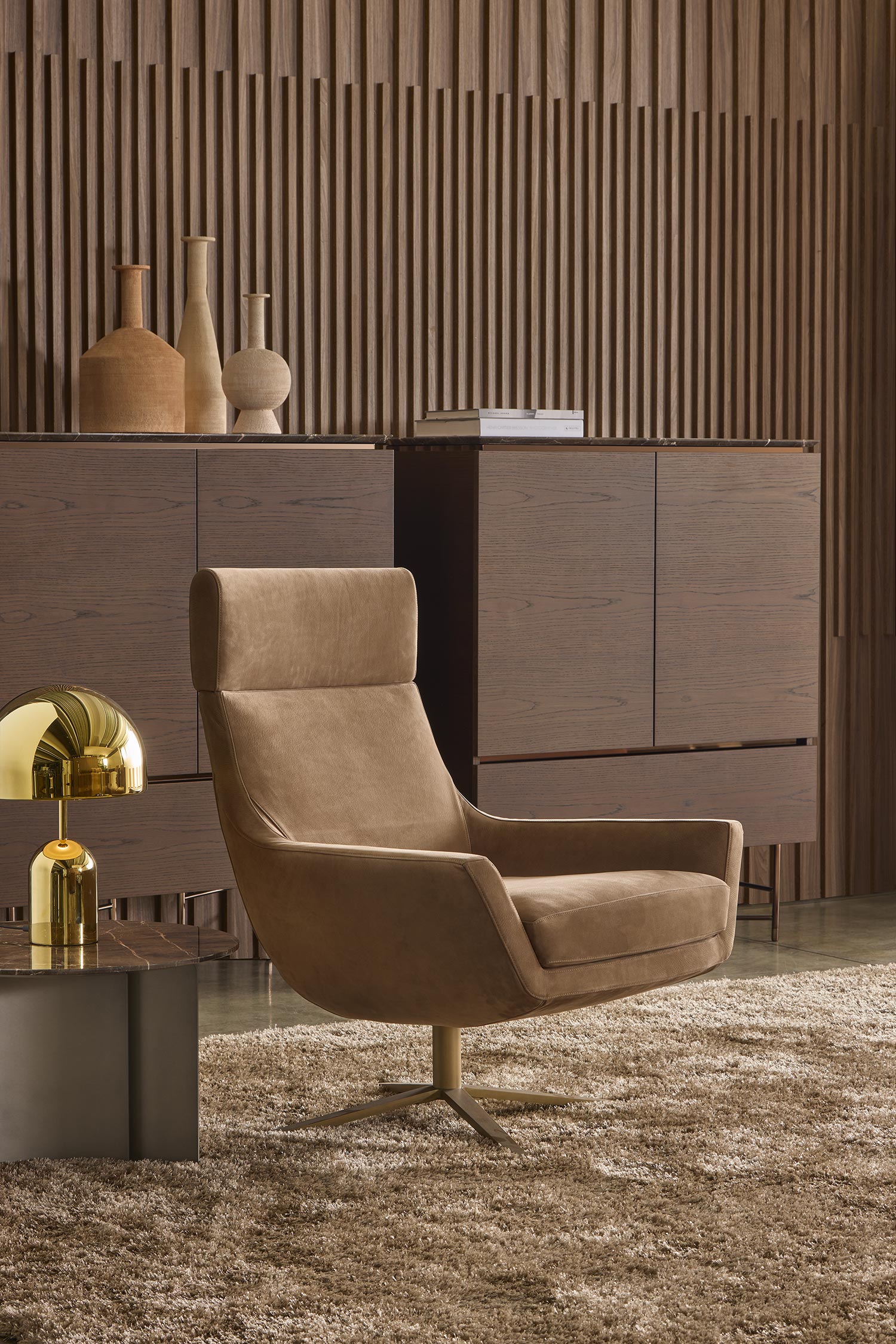 Swivel armchair with fixed upholstery in fabric, leather, or a combination of both from their collection, alternatively you have your own fabric sent to the factory to be upholstered.