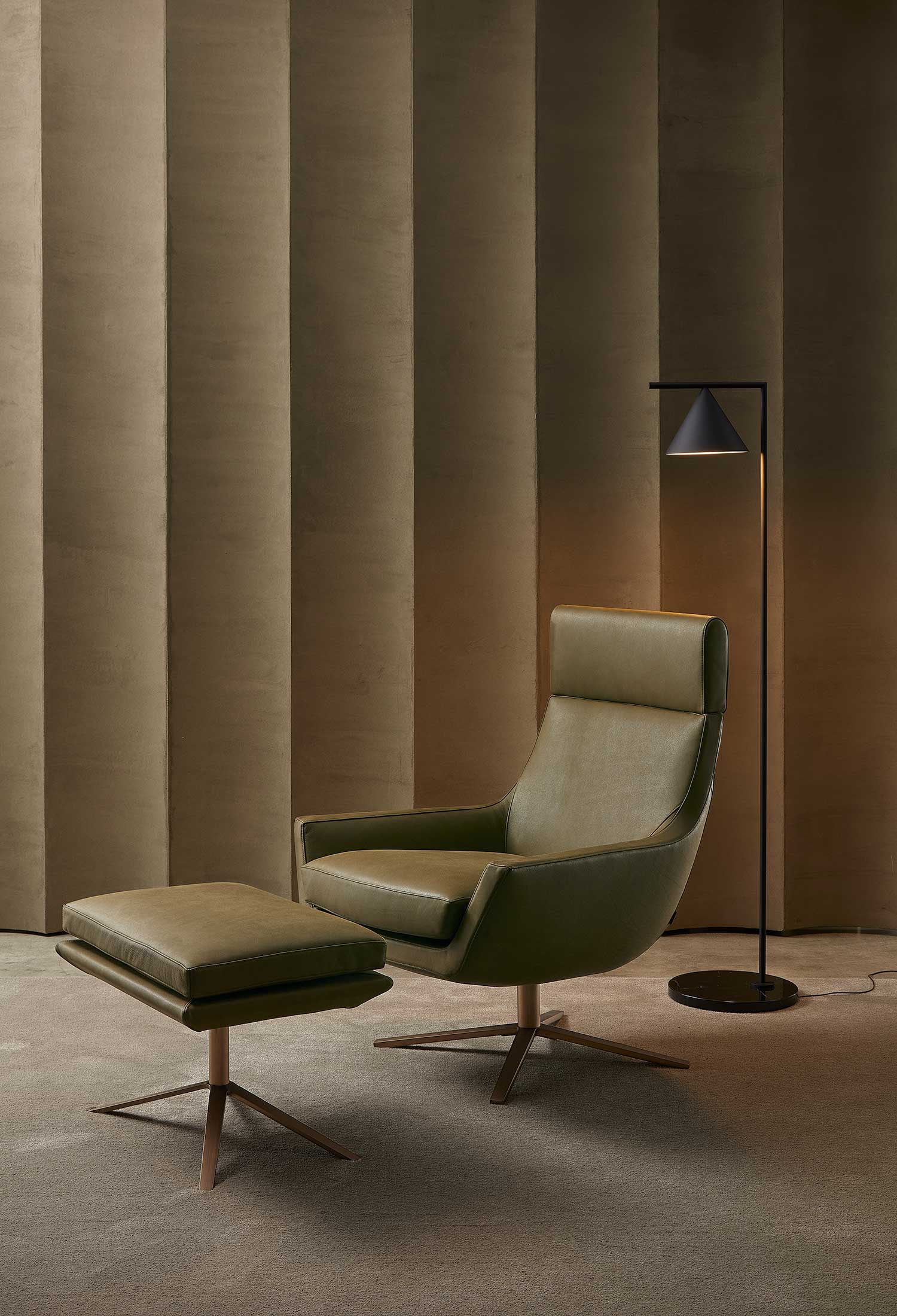 Collection available as a swivel low back, high back, high wing back and fixed or swivel base nest chair, with additional footstool.