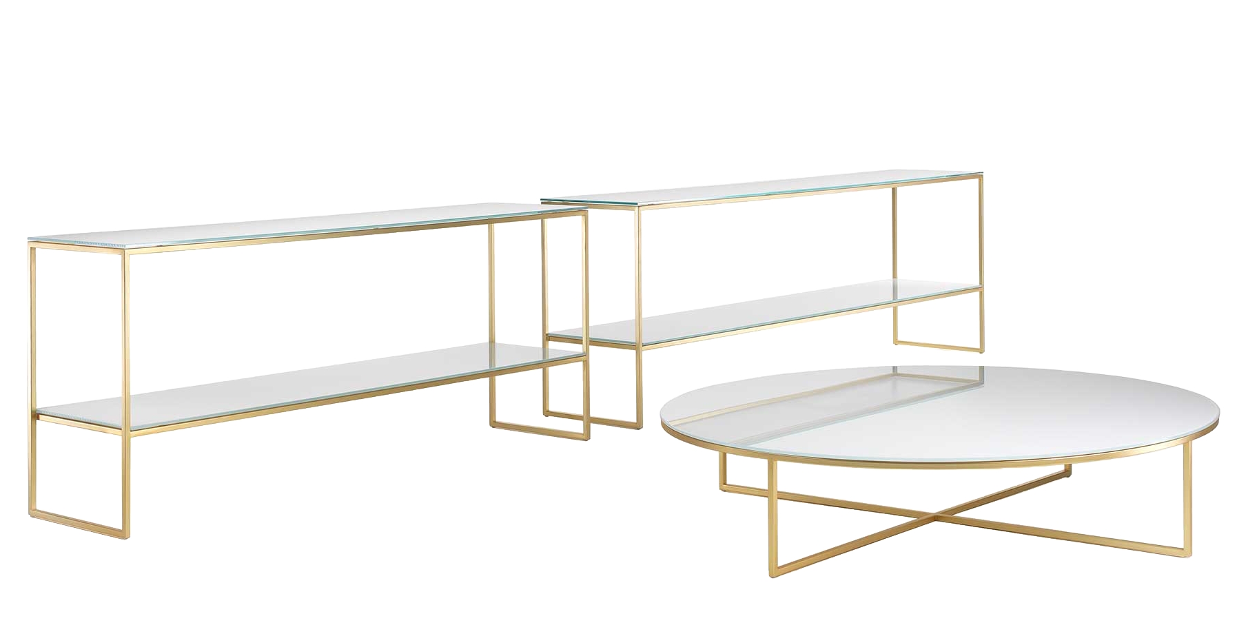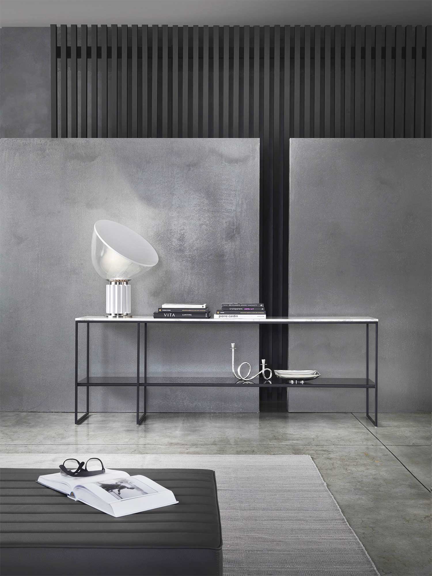 Console with a metal structure available in a range of finishes, option of a glass, wooden, marble or porcelain stoneware top.