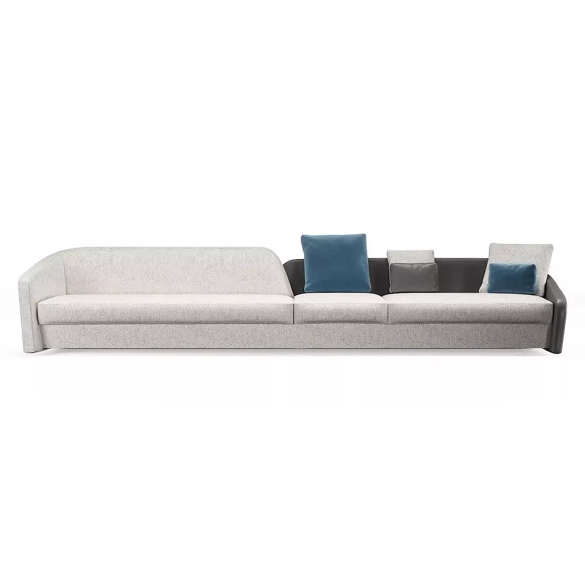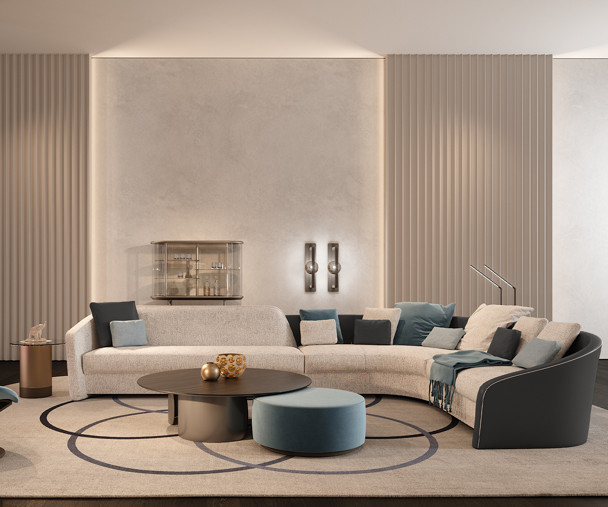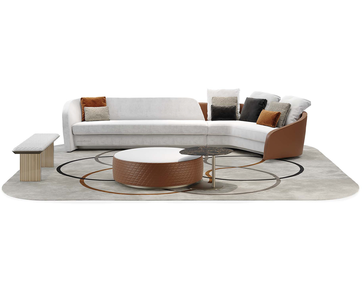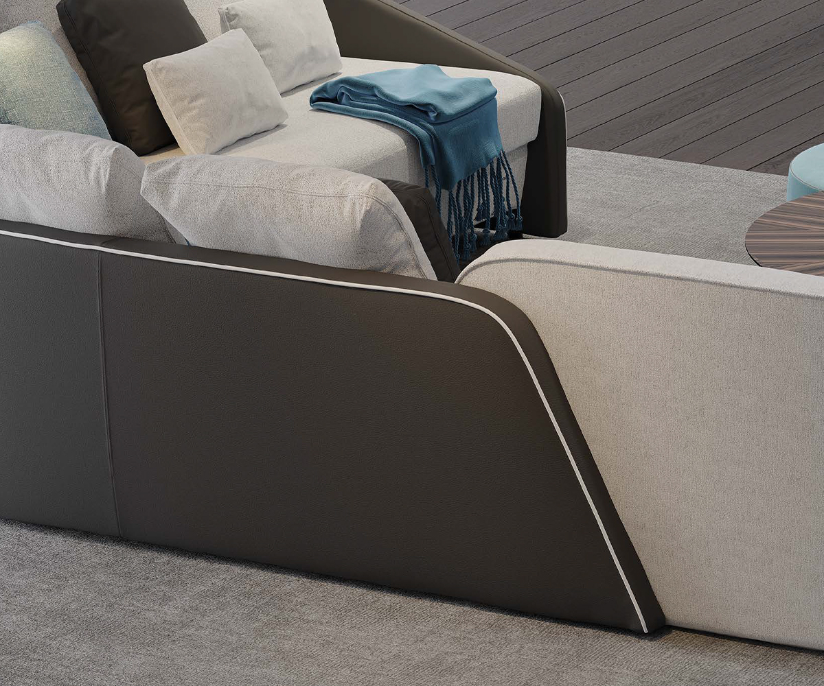Modular sofa with variable seat depths enhanced by the different upholstery available in fabric or leather. Customisable w/ piping and contrast stitching.