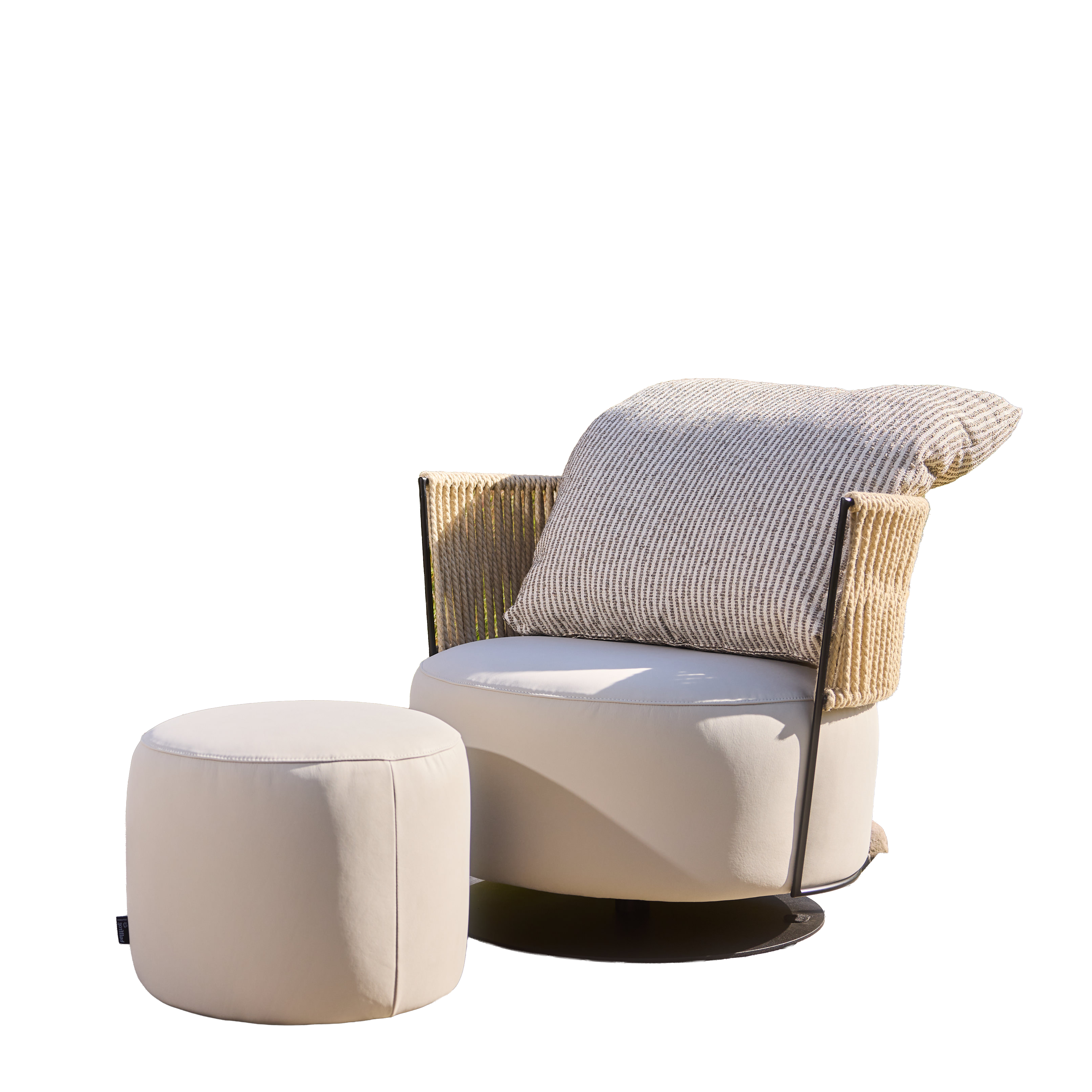 Swivel rocking outdoor armchair with a matt black steel structure & option of natural or black braiding. Mix & match the seat & back cushion upholstery from their wide range of outdoor fabrics.