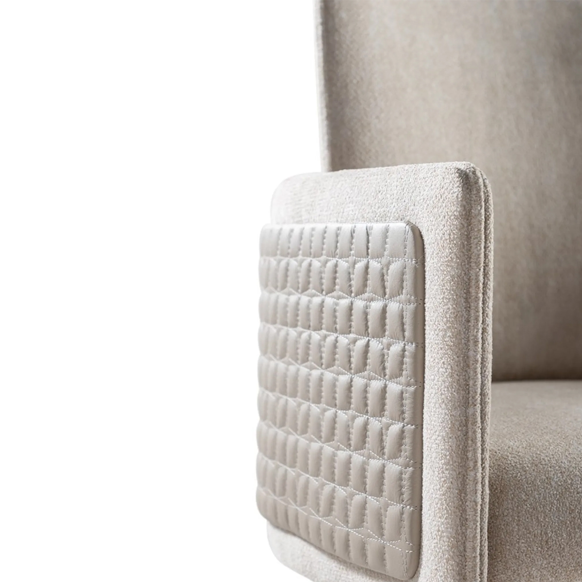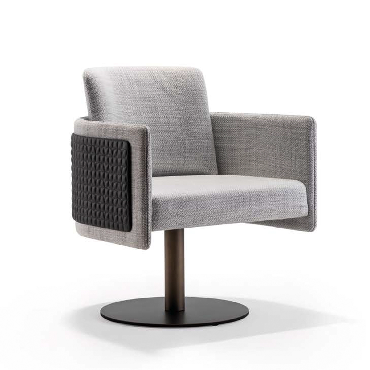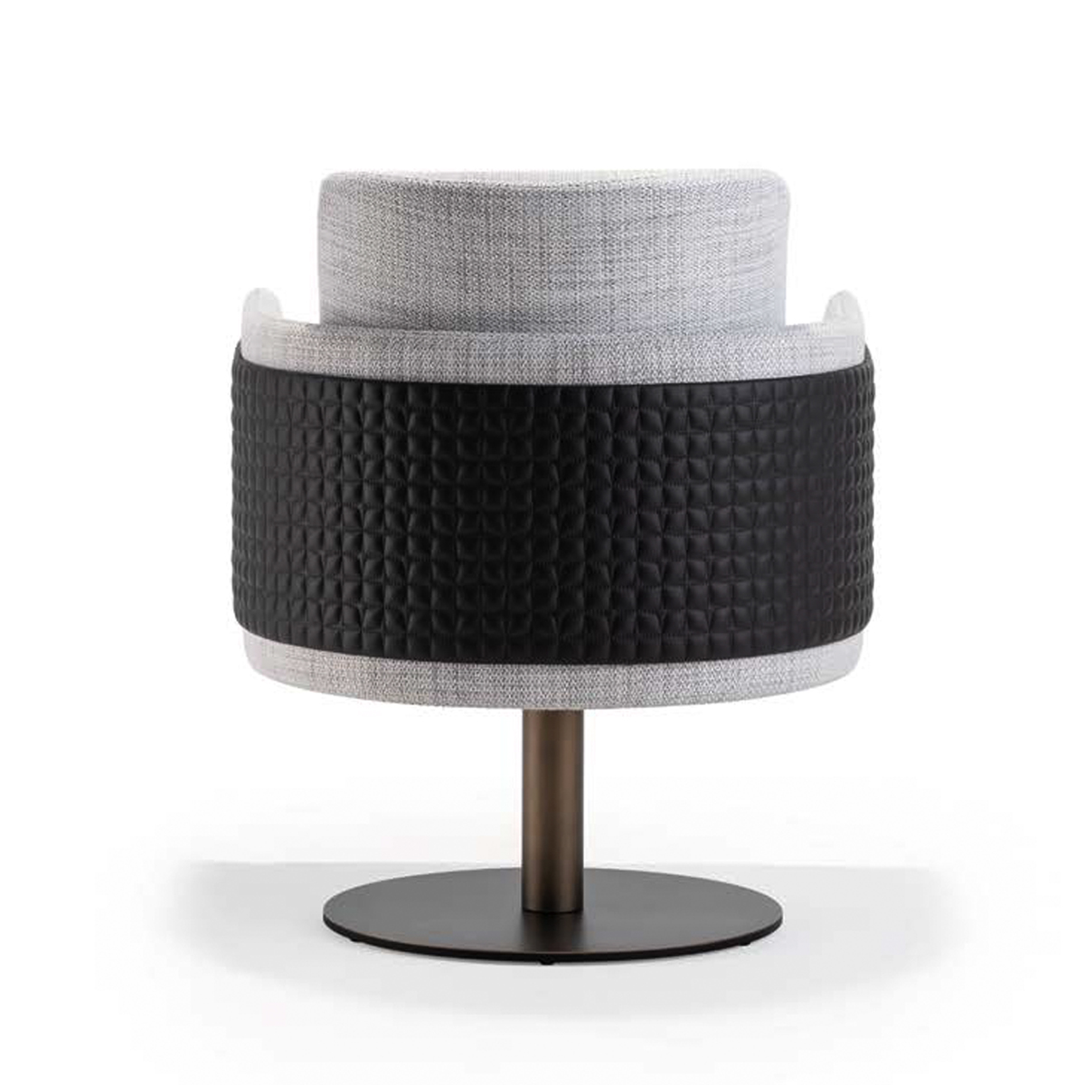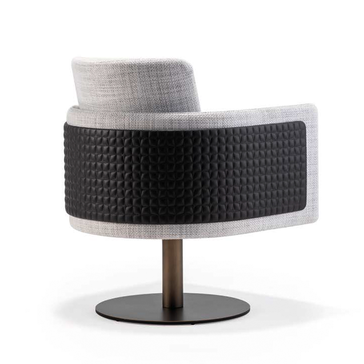 Armchair with fixed wooden legs or a swivel metal base in the finishes bronze, brass, dark brass or titanium. Seat upholstered in fabric or leather, or a mix of both,. Featuring a movable back cushion and optional outer panel in plain or quilted design.