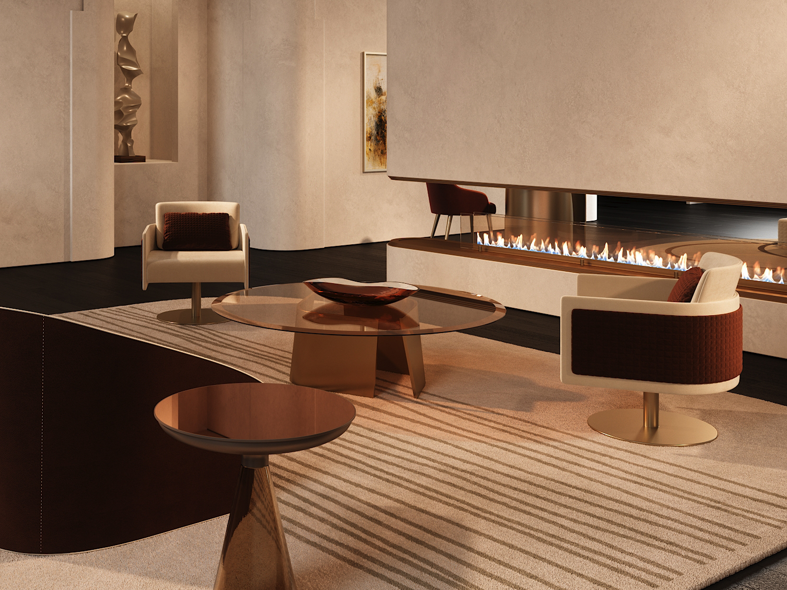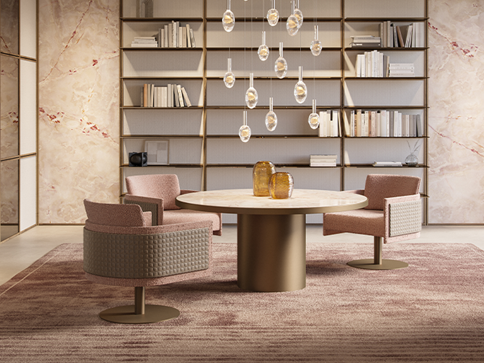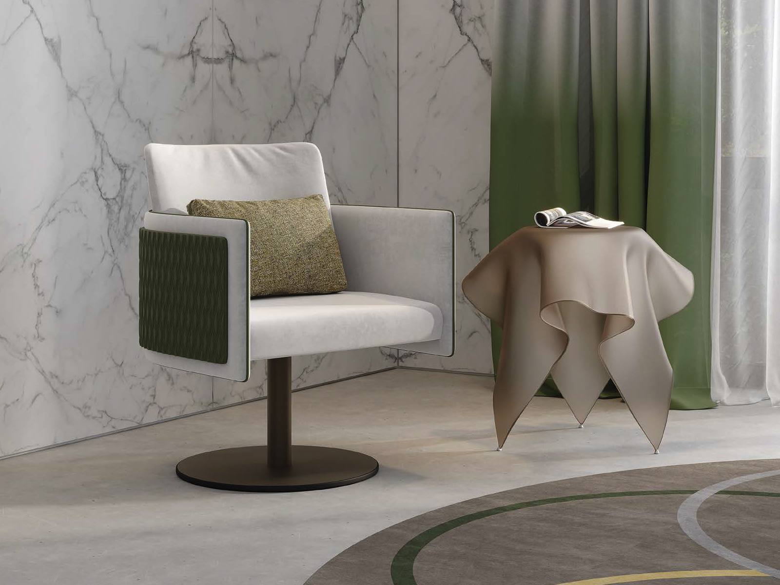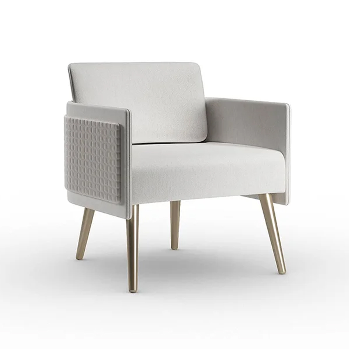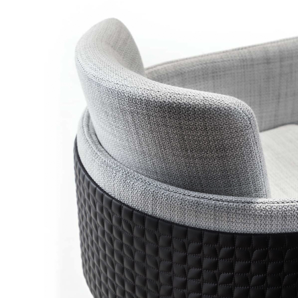 Armchair with fixed wooden legs or a swivel metal base in the finishes bronze, brass, dark brass or titanium. Seat upholstered in fabric or leather, or a mix of both,. Featuring a movable back cushion and optional outer panel in plain or quilted design.