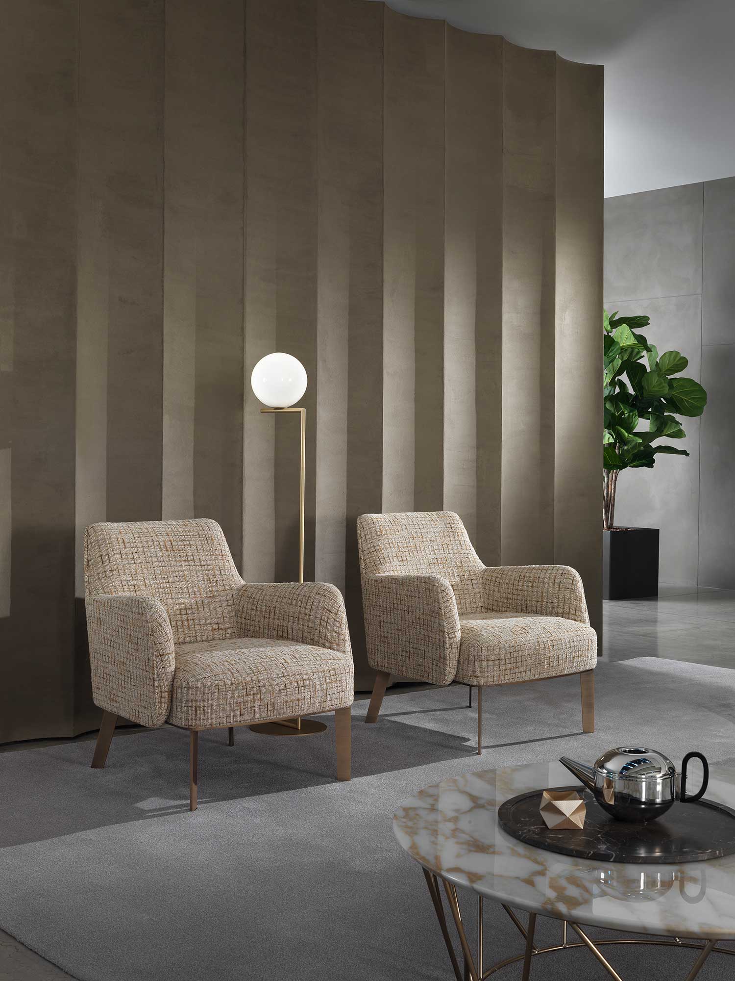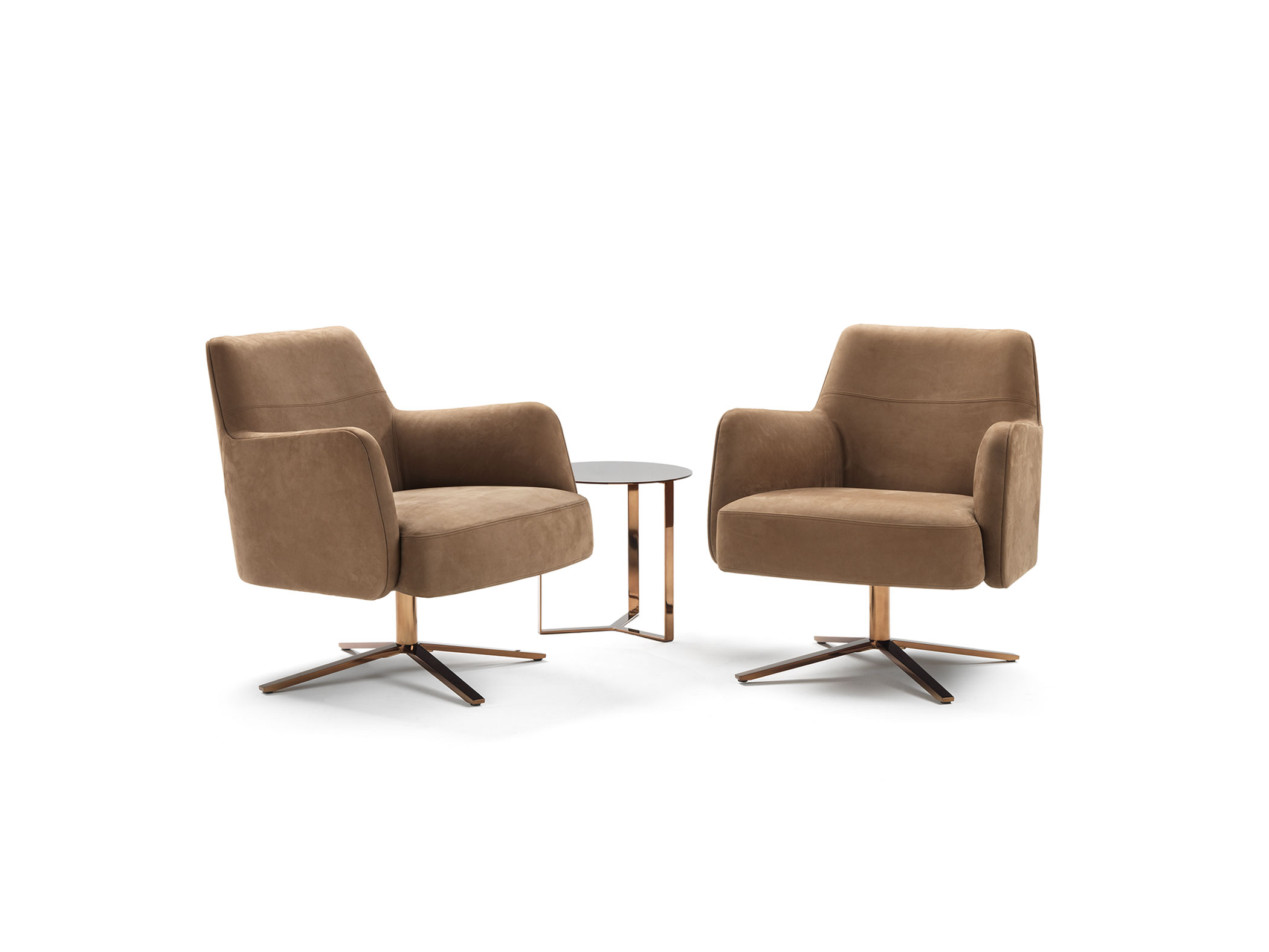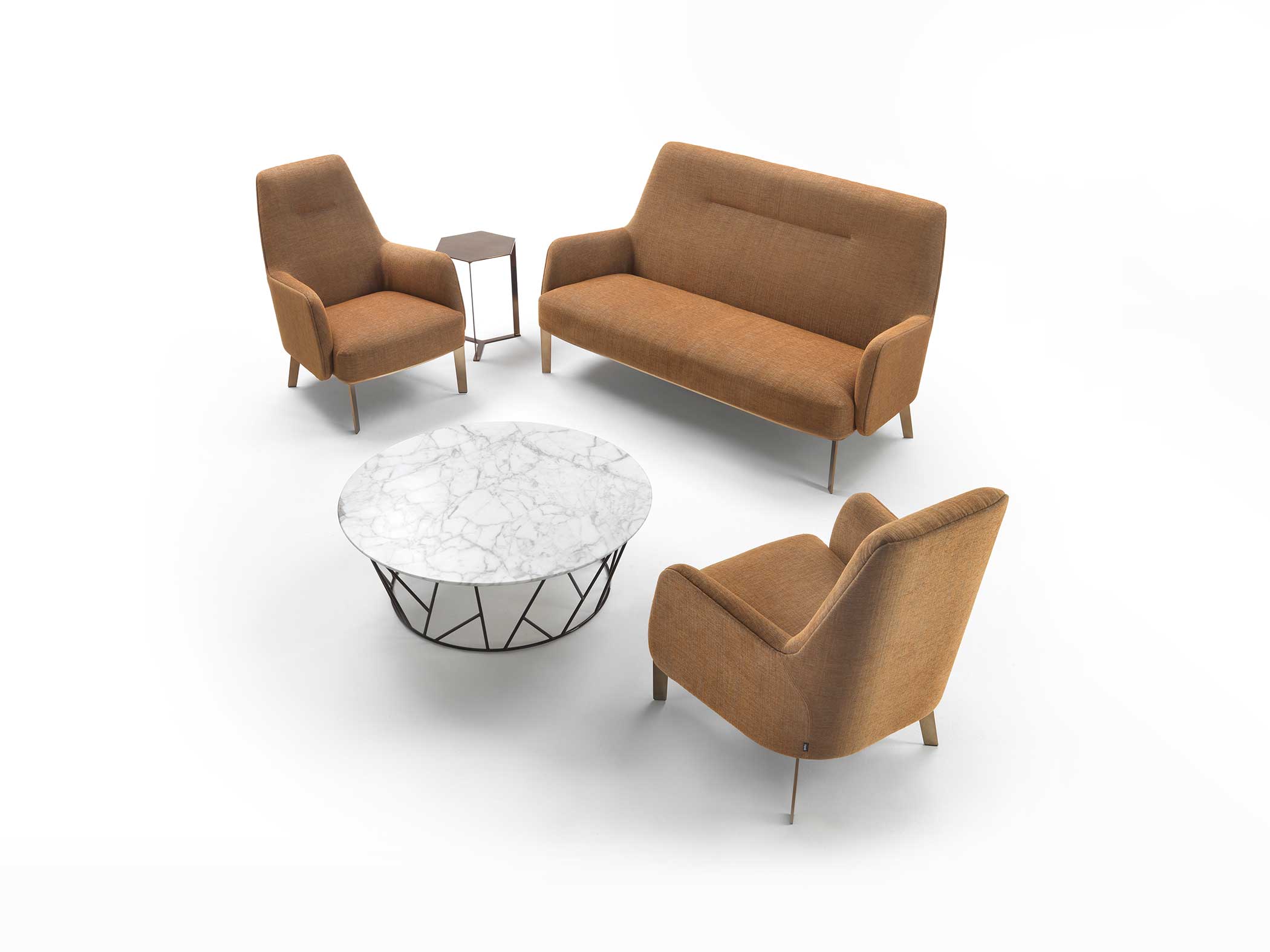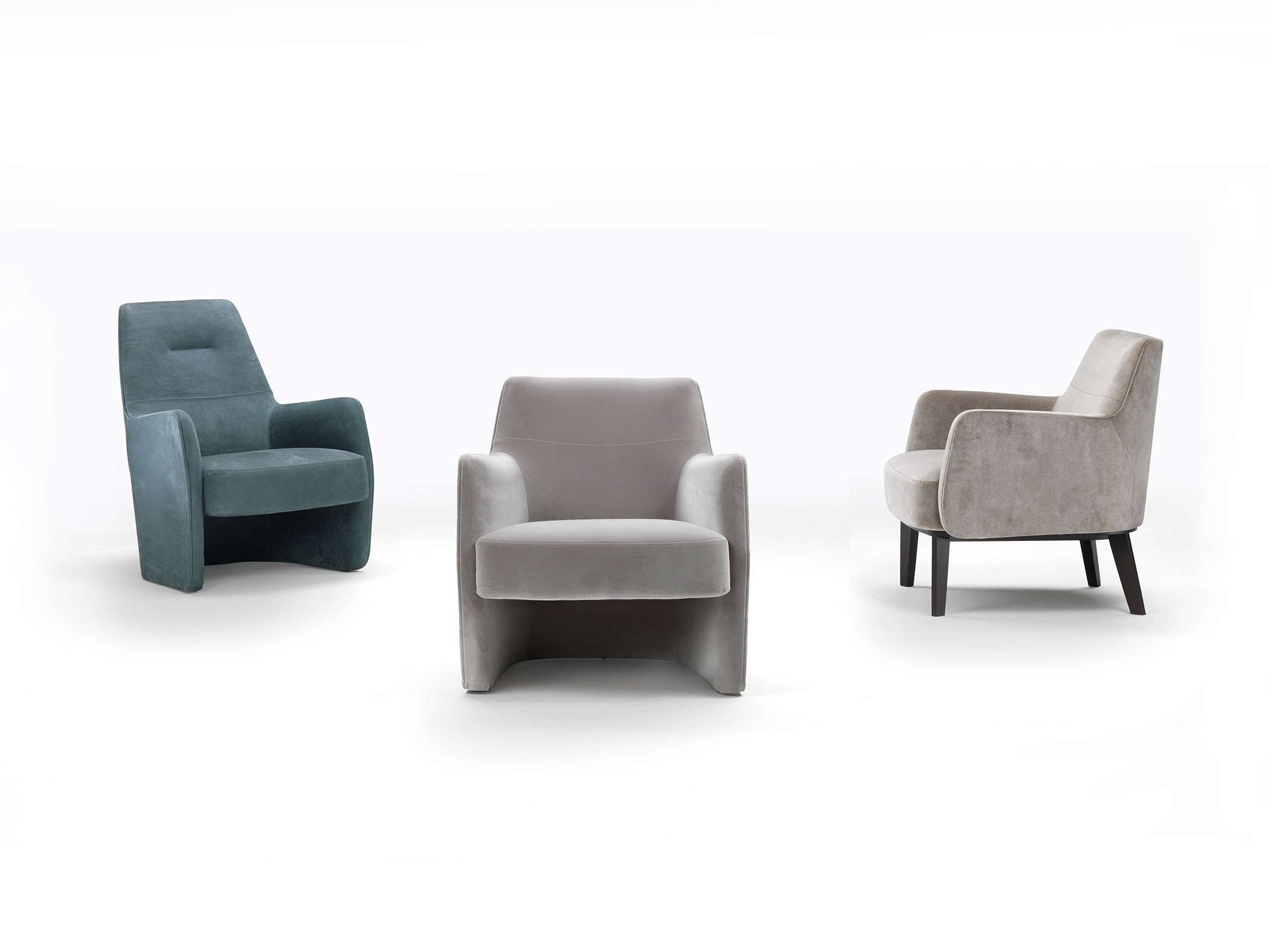 Collection of armchairs and small sofas available in a range of fabrics and base finishes.