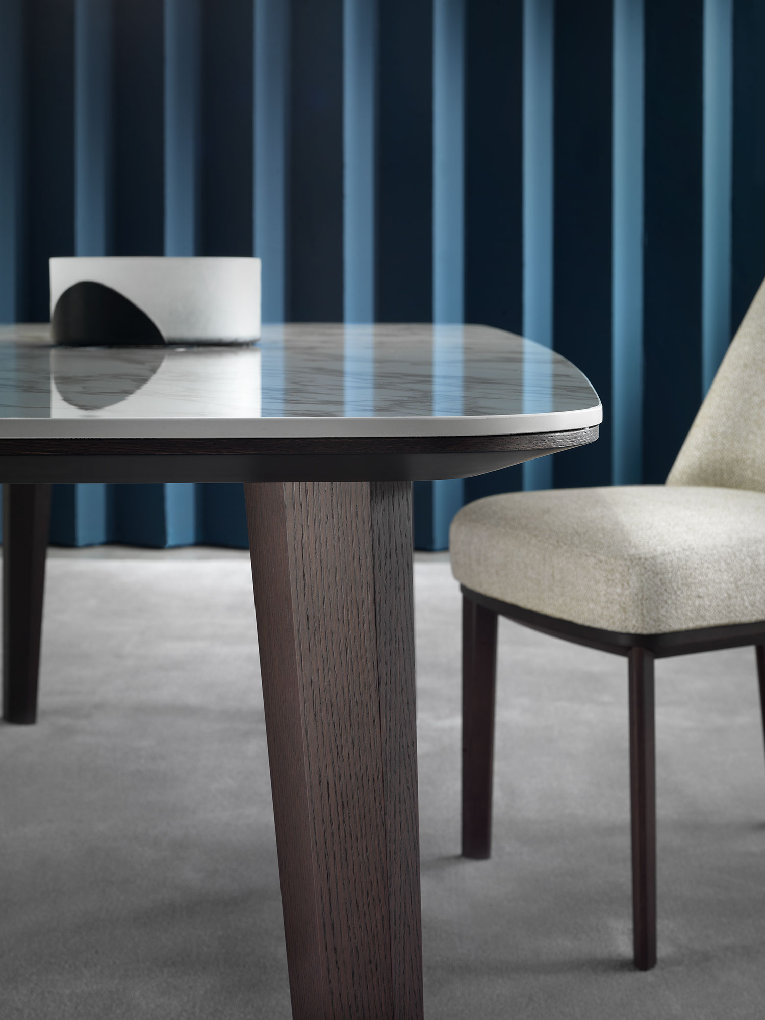 Modern and elegant dining table characterised by a wooden top with porcelain stoneware top available in different finishes.