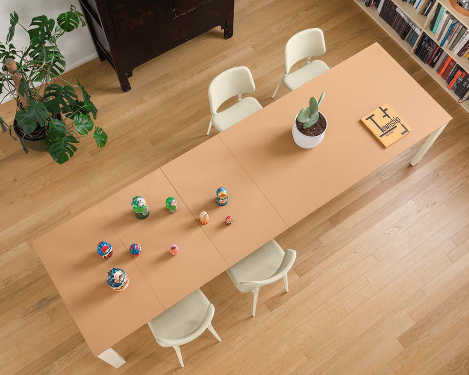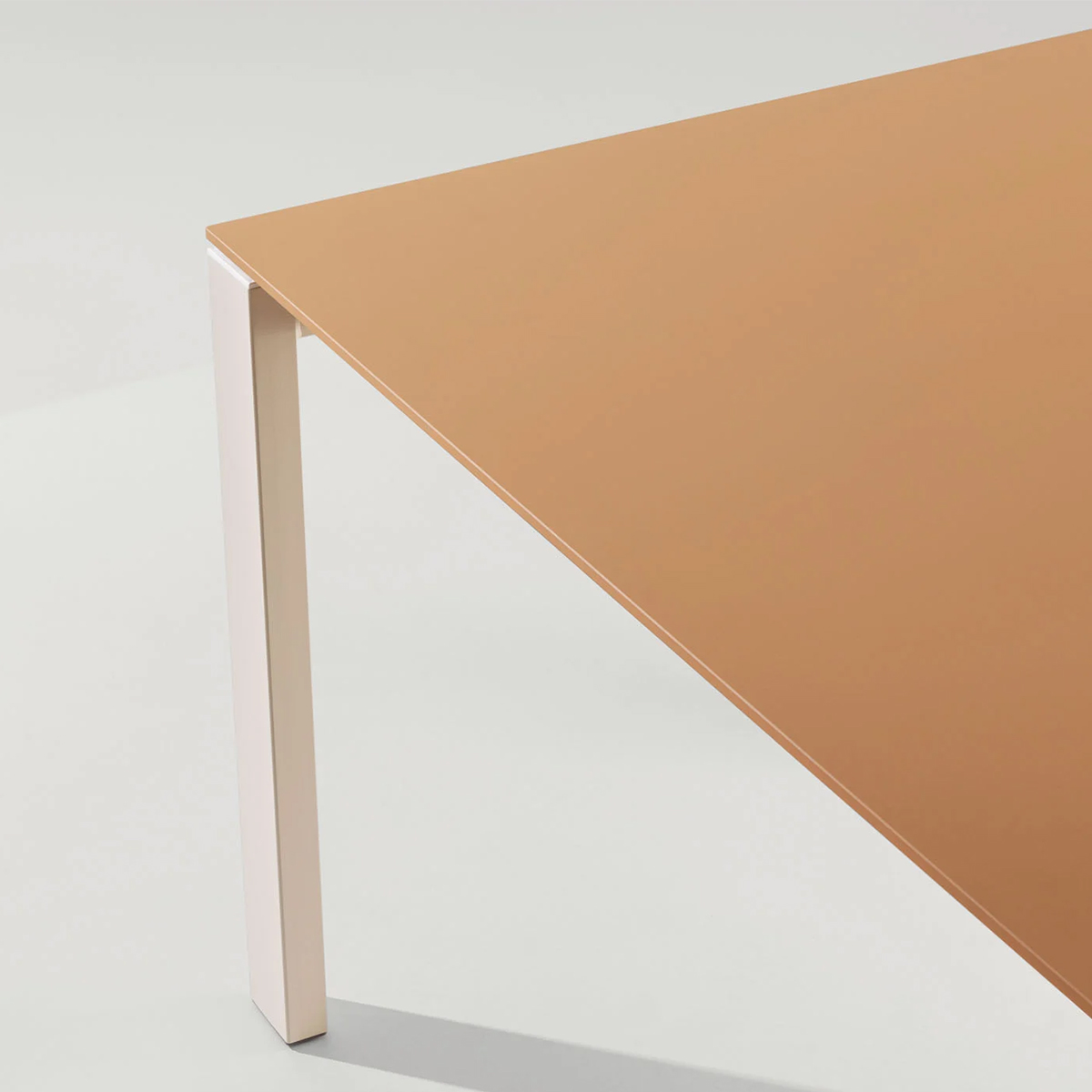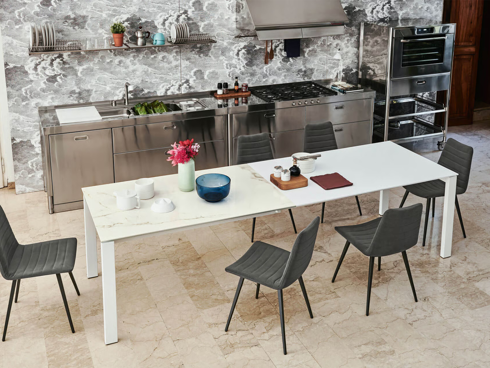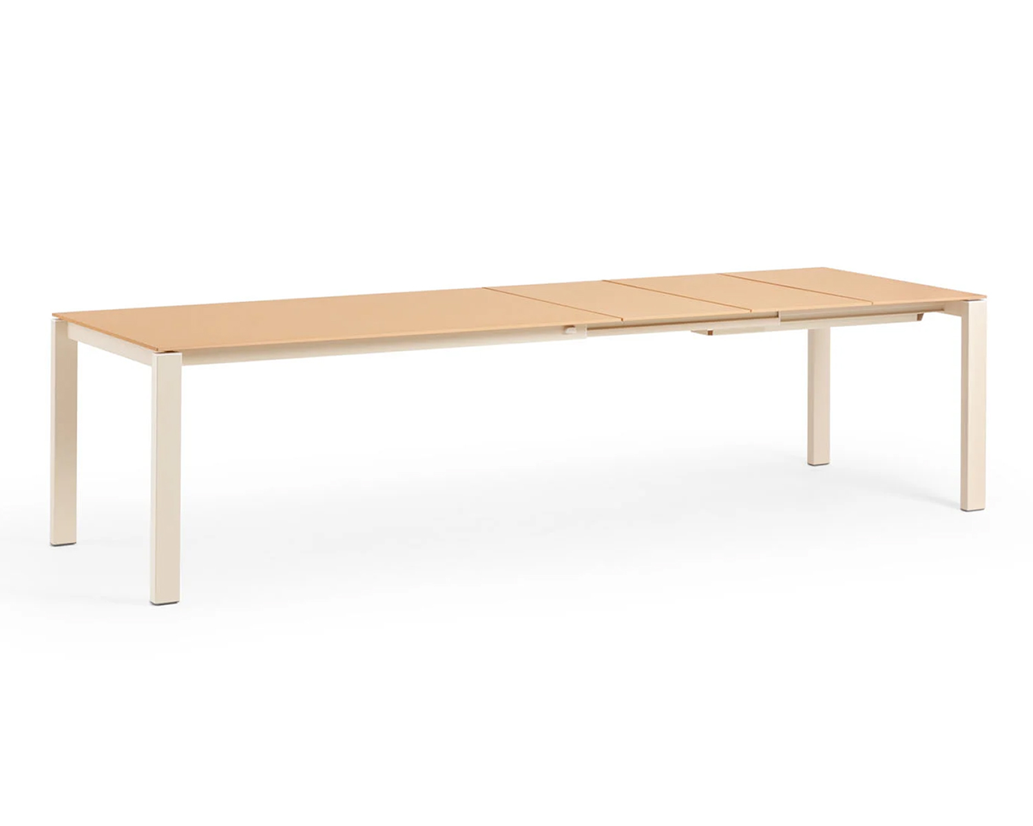 Badù extendable table with lacquered metal structure and top available in several materials and finishes.
