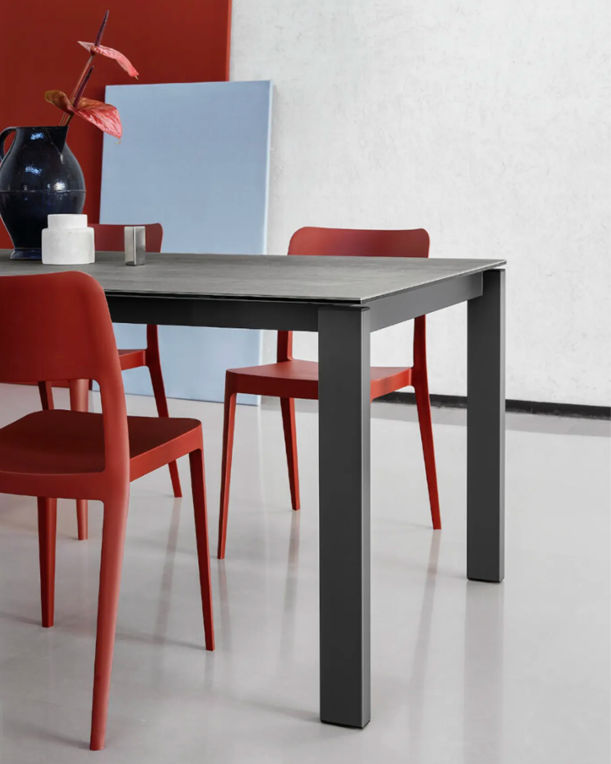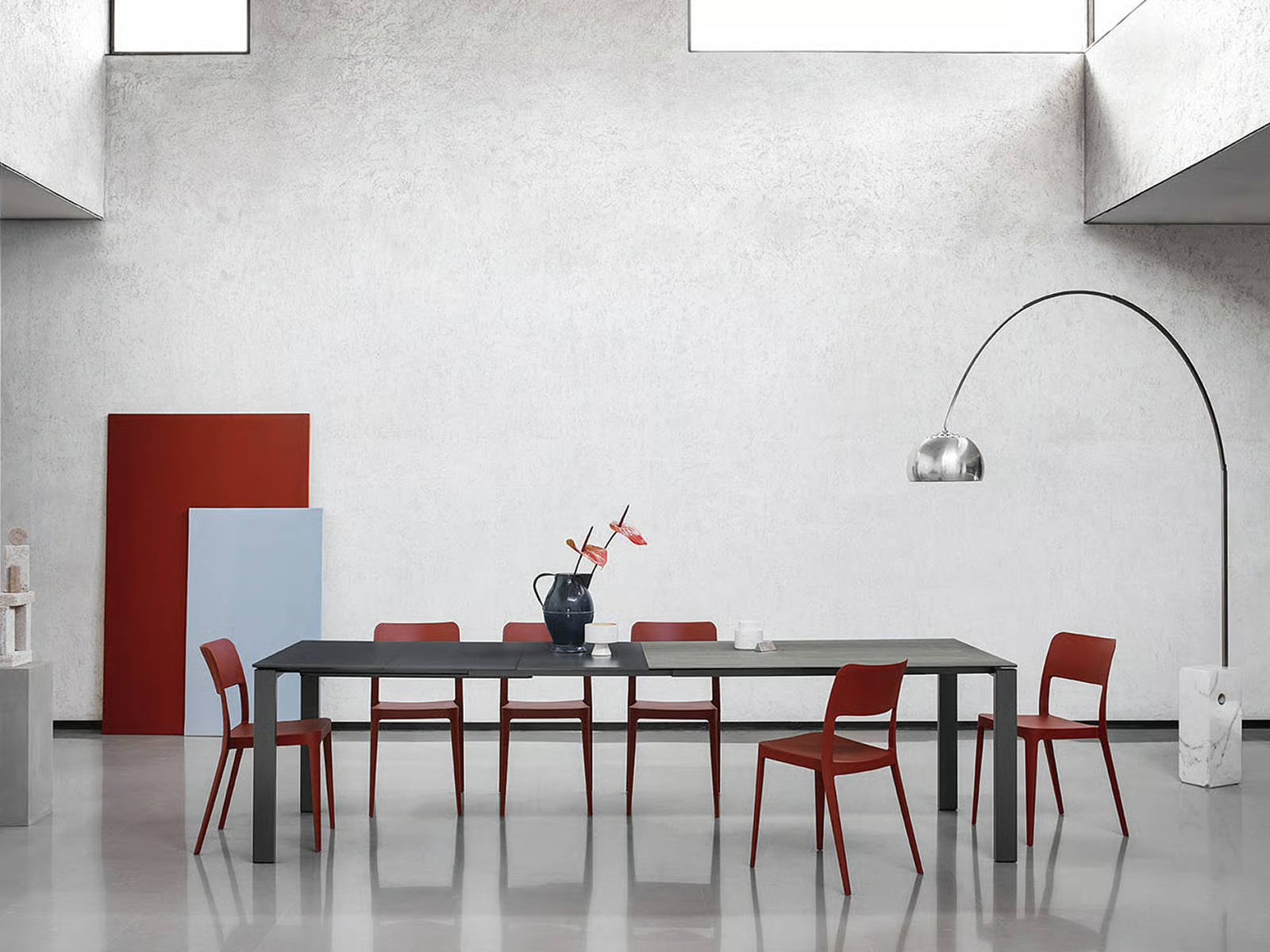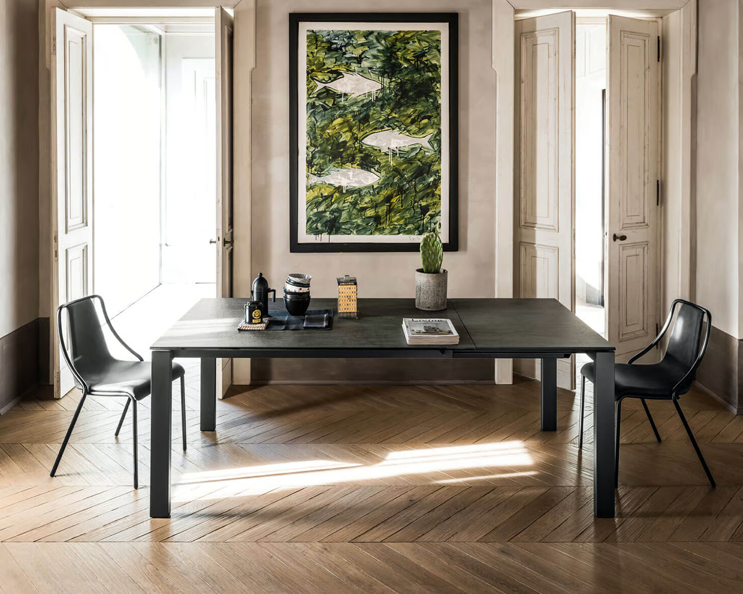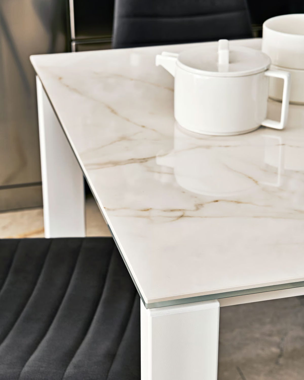 Badù extendable table with lacquered metal structure and top available in several materials and finishes.
