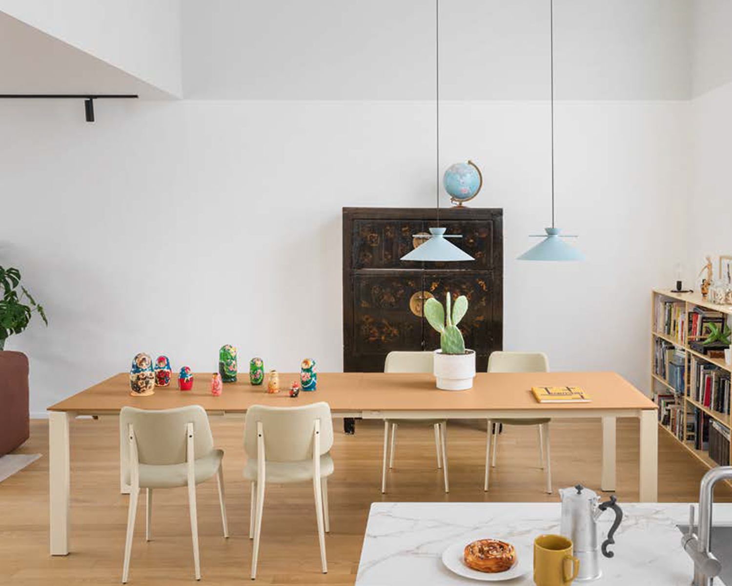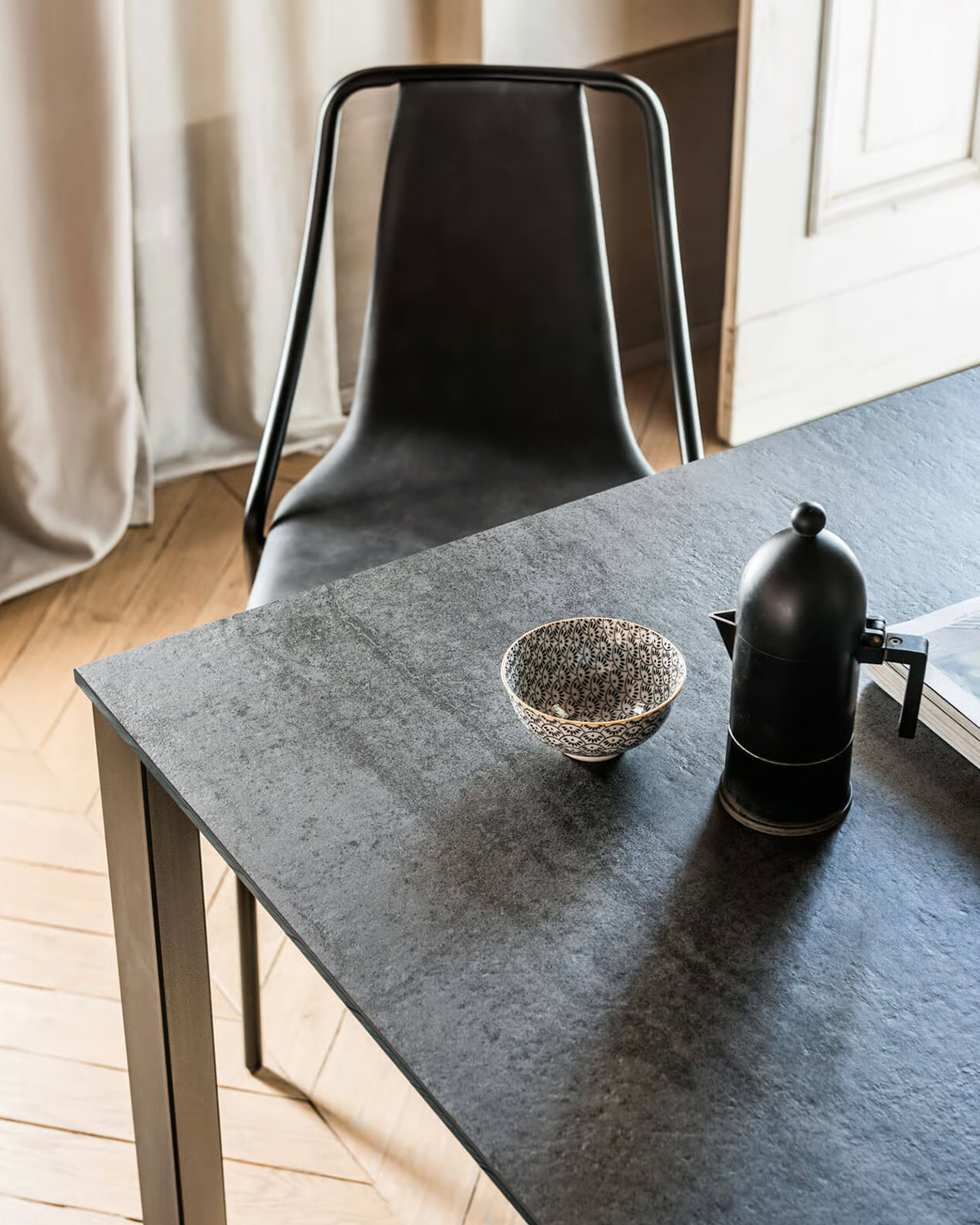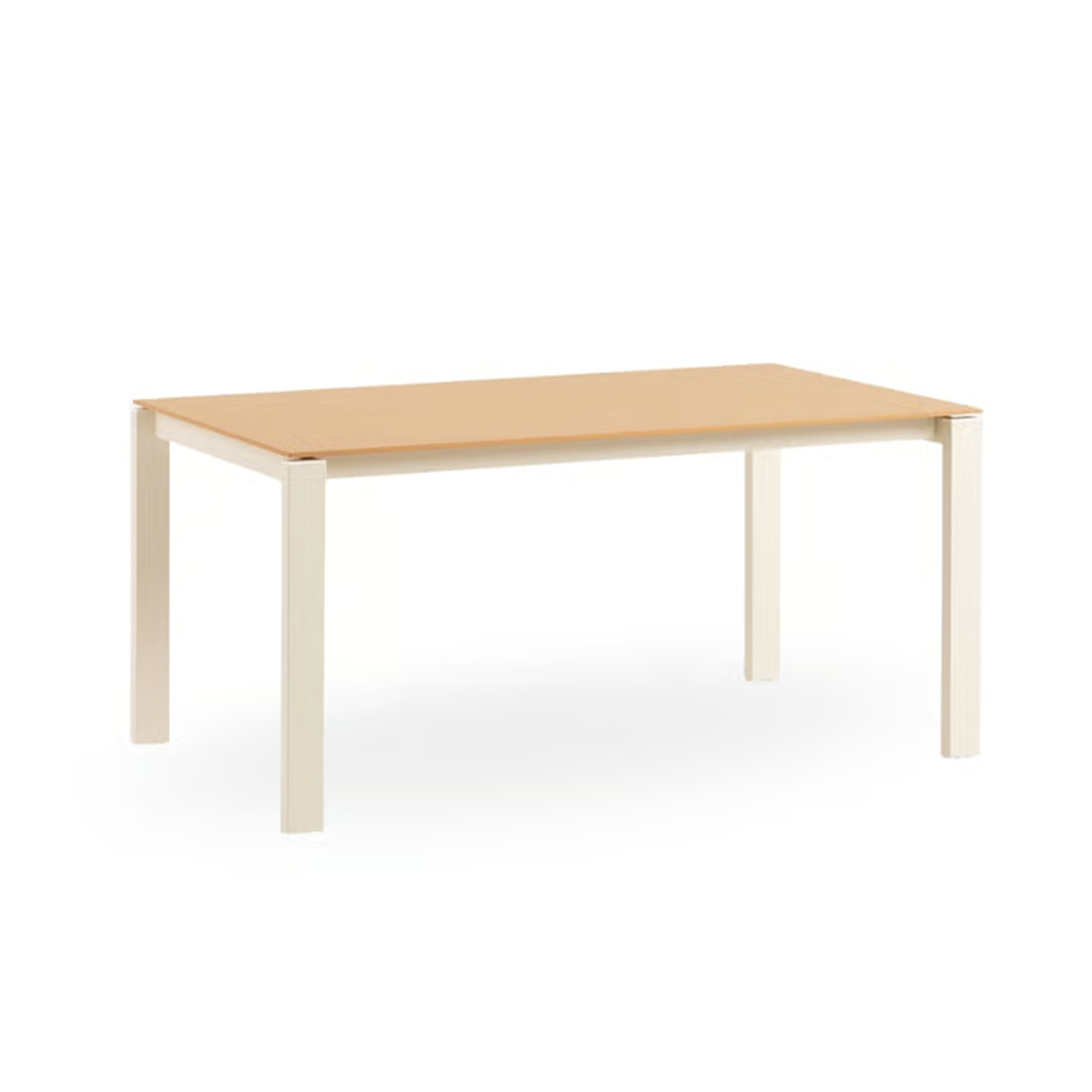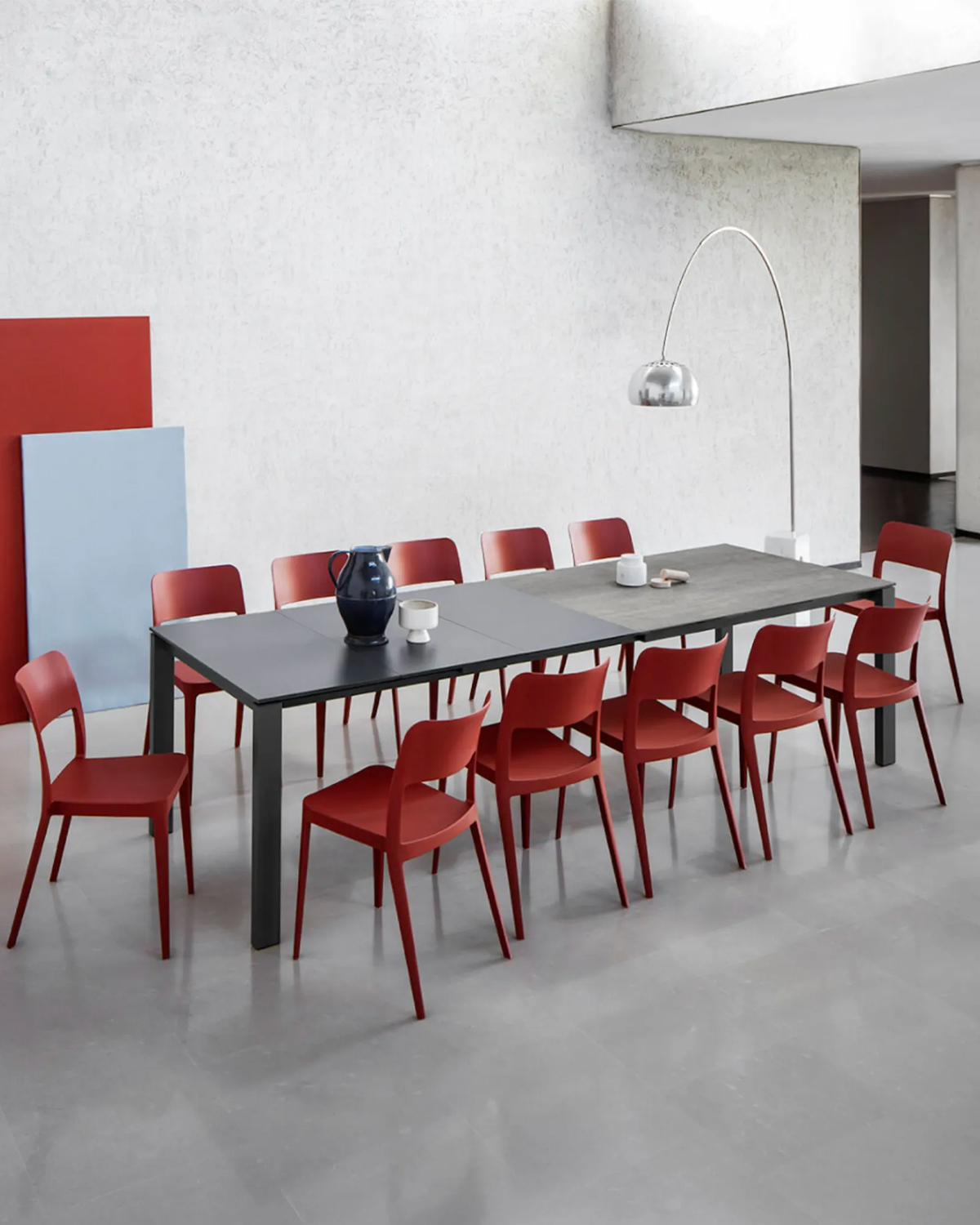 Badù extendable table with lacquered metal structure and top available in several materials and finishes.