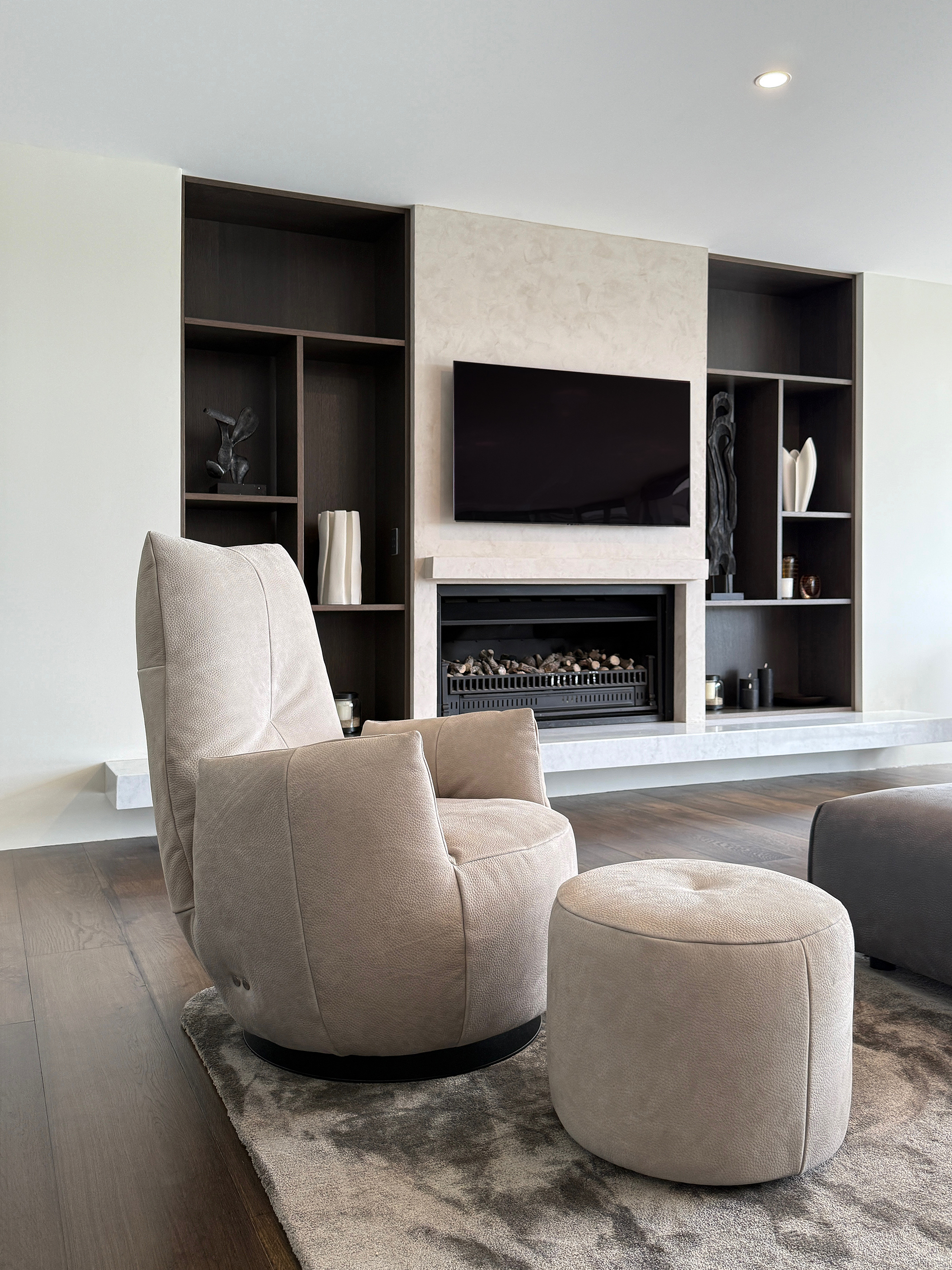 A 'Luxe' version of the Blobb rocking and swivel armchair with the added function of a motorized back and manually adjustable headrest for best sitting comfort and an outstanding experience! With a steel base plate finished in black powder-coat and seat upholstery available in a wide range of fabric and leather options from their collection.