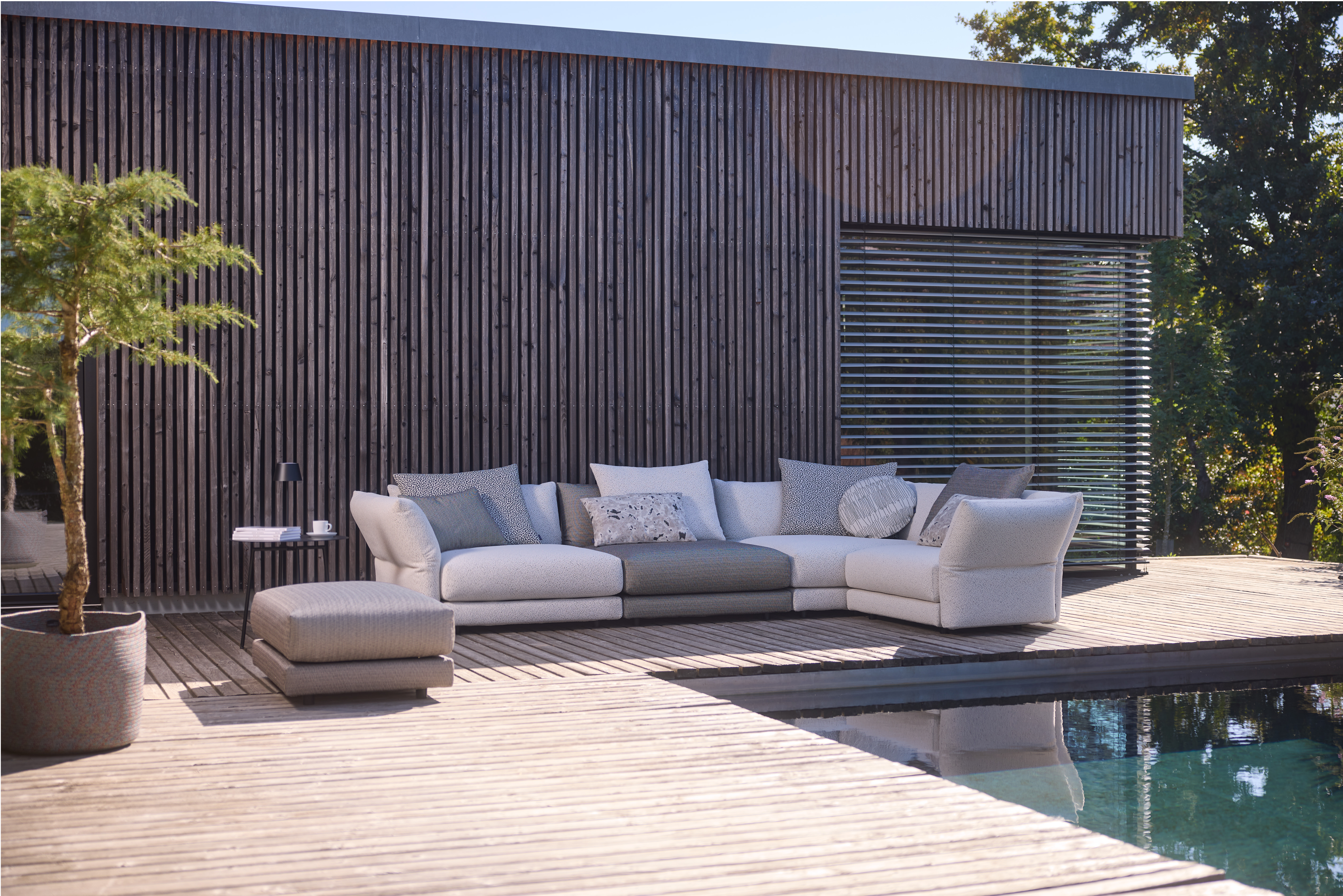Outdoor sofa with flexible back and arm elements and loose-fitting cushions, customisable in different configurations. Available in a range of outdoor textiles.