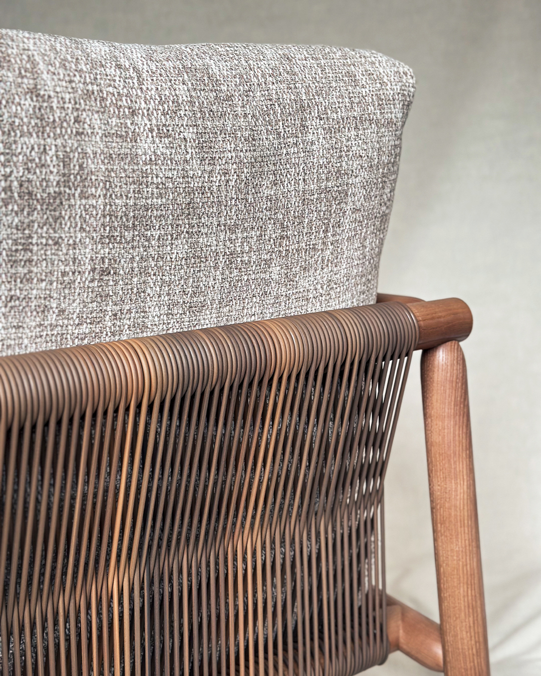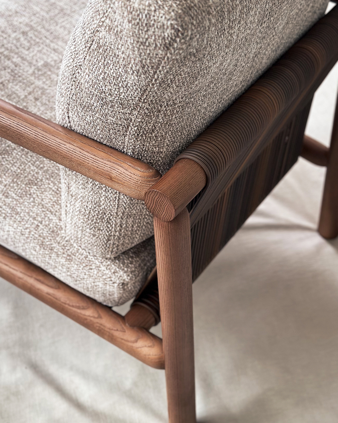 Armchair with a rounded ash wood frame, sandblasted with natural finish or stained with colors from collection. Available in a wide range of fabric or leather options.