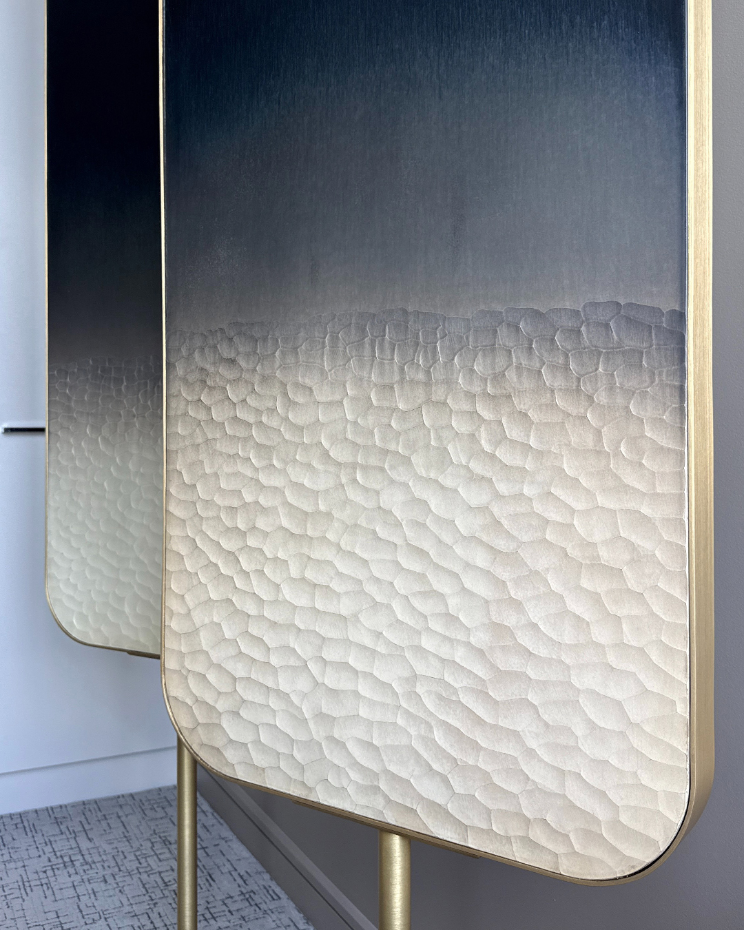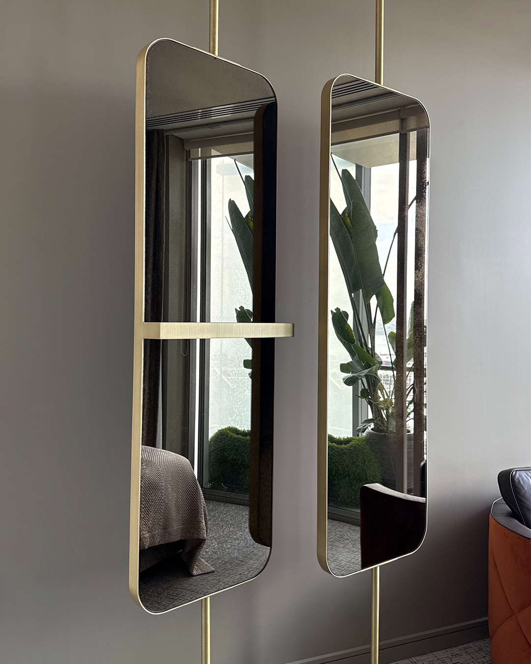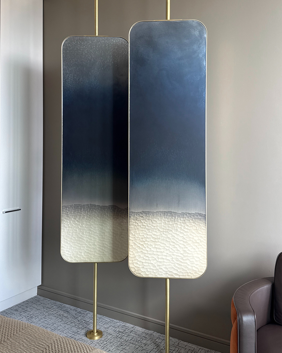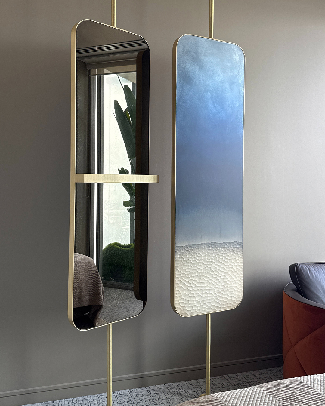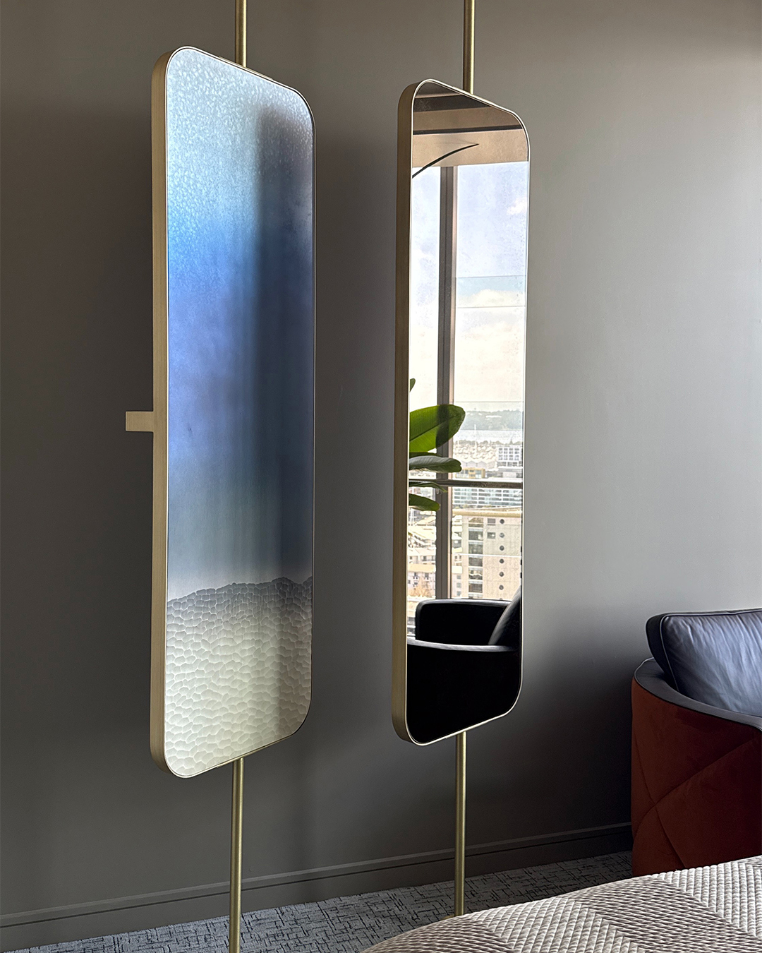 Screens in burnished brass structure on a swivel system. Interior plates made of extra-clear acid-etched glass, 6 mm thick, decorated with Lipari finishing.
