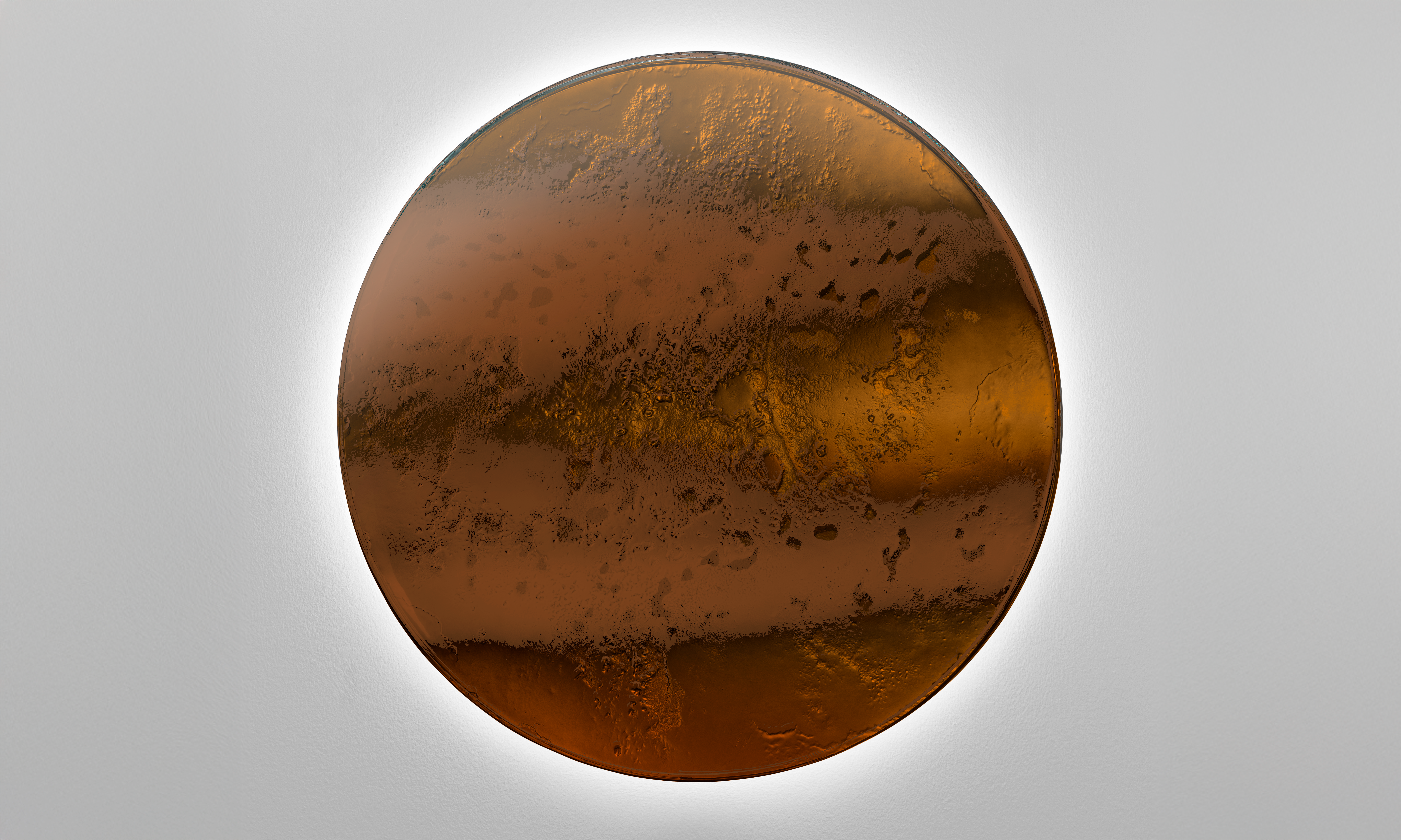 Wall decoration in baked glass in two layers with irregular edges. All decorated with ‘Forest’ finish and silvered with medium antique on the back. Matt black lacquered wooden frame. LED perimeter lighting.