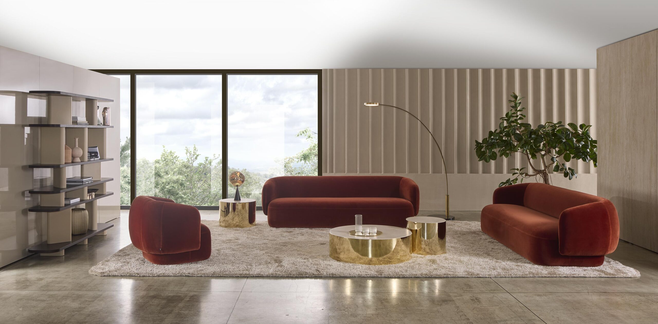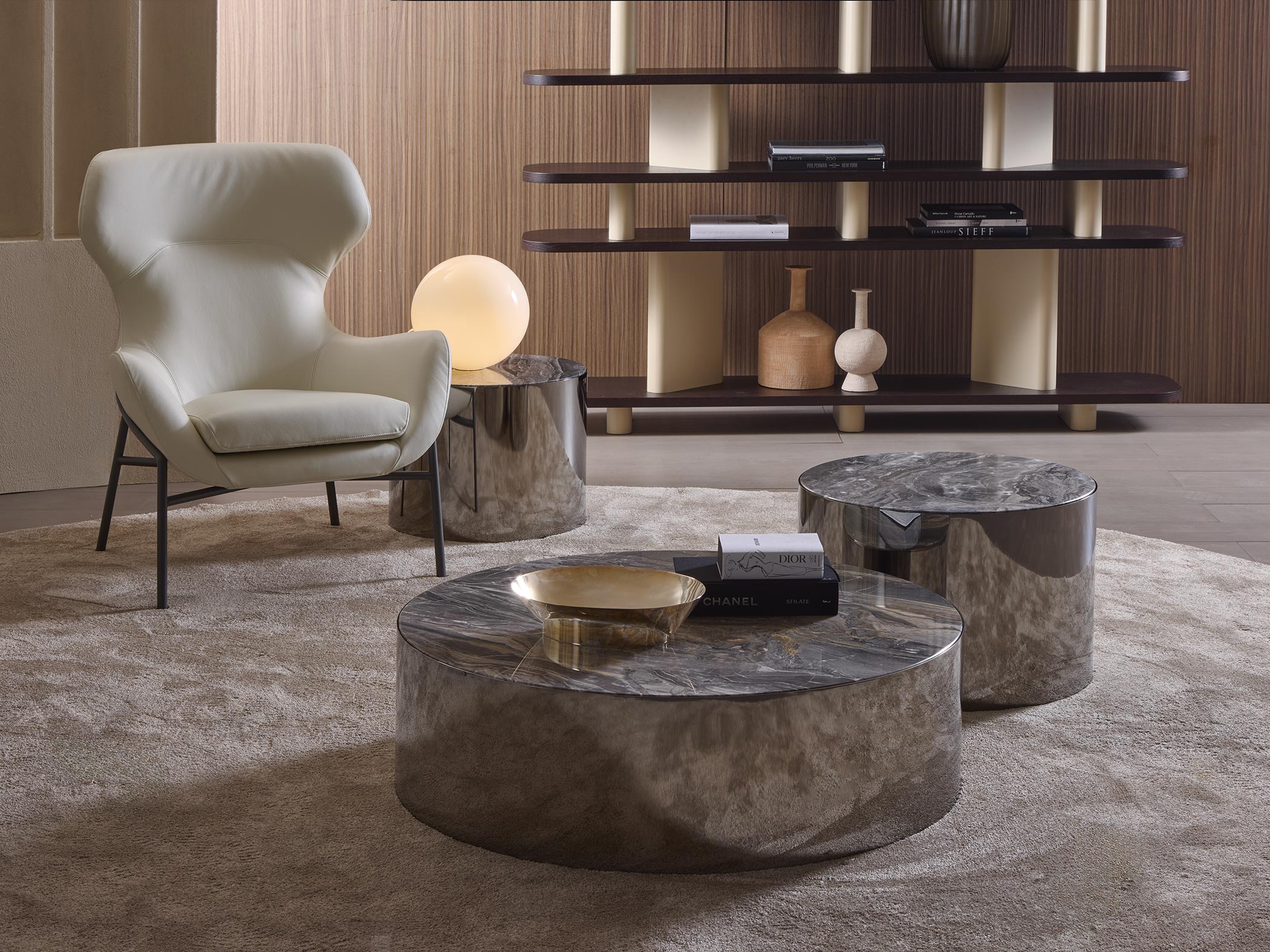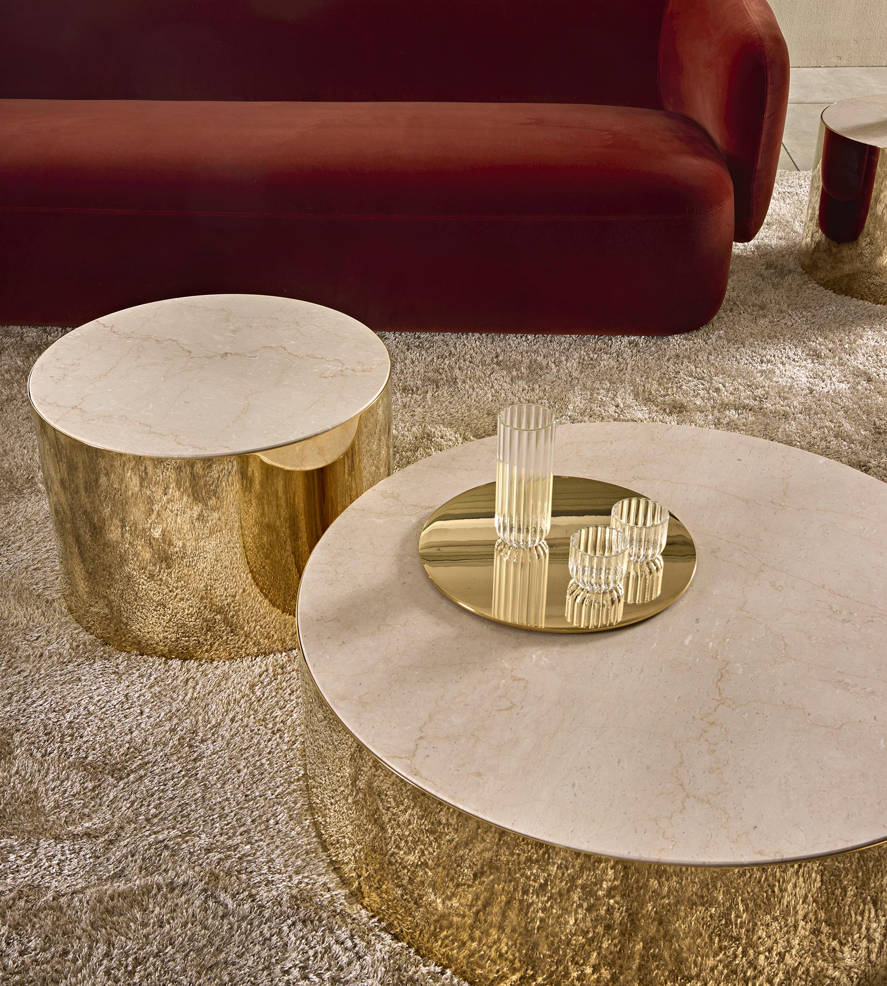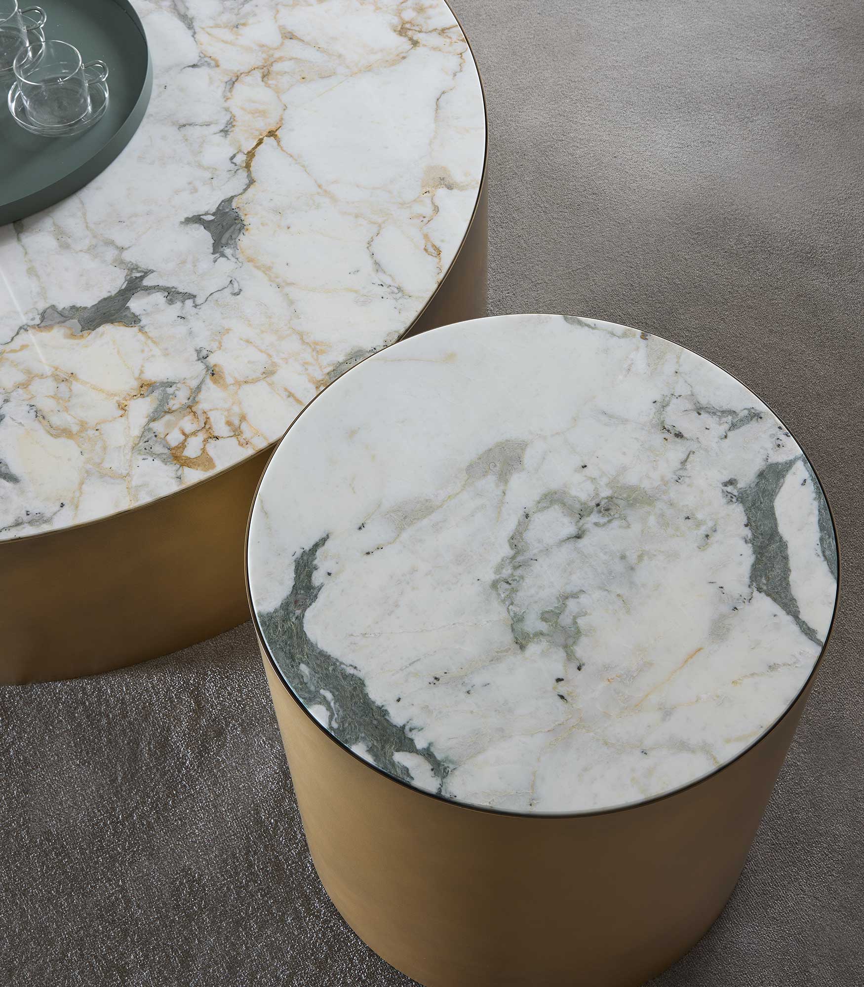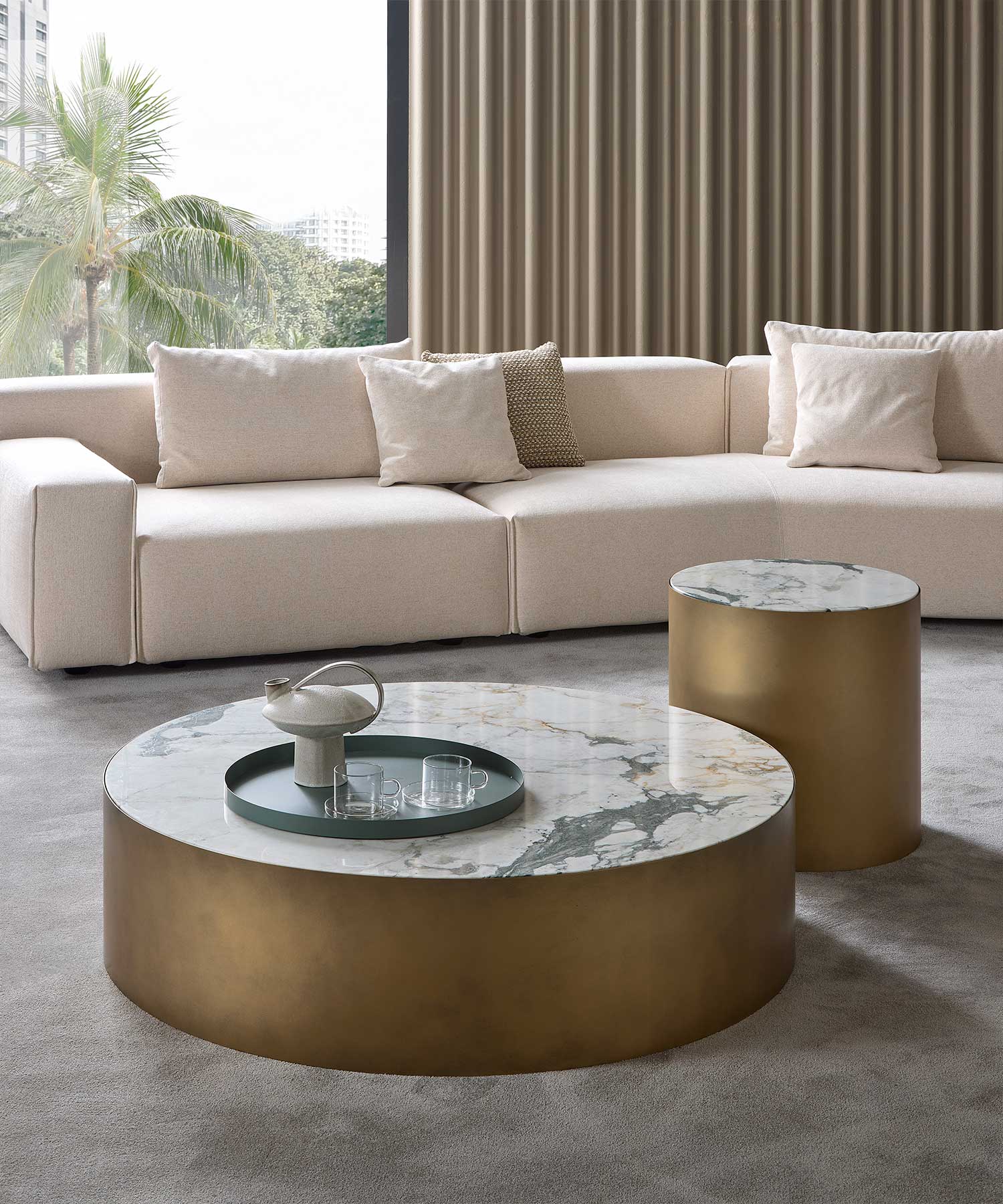 Collection of coffee and side tables available in circular, square or rectangular shapes. Metal base with a top available in marble or glass.