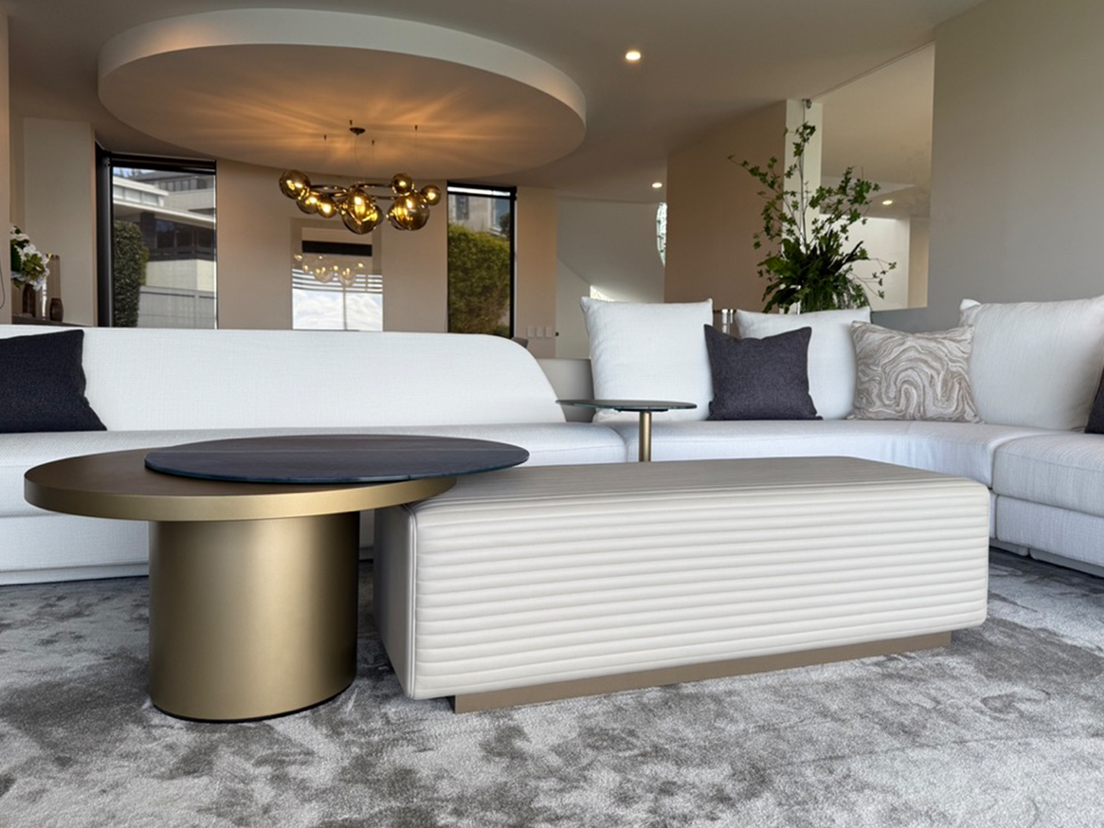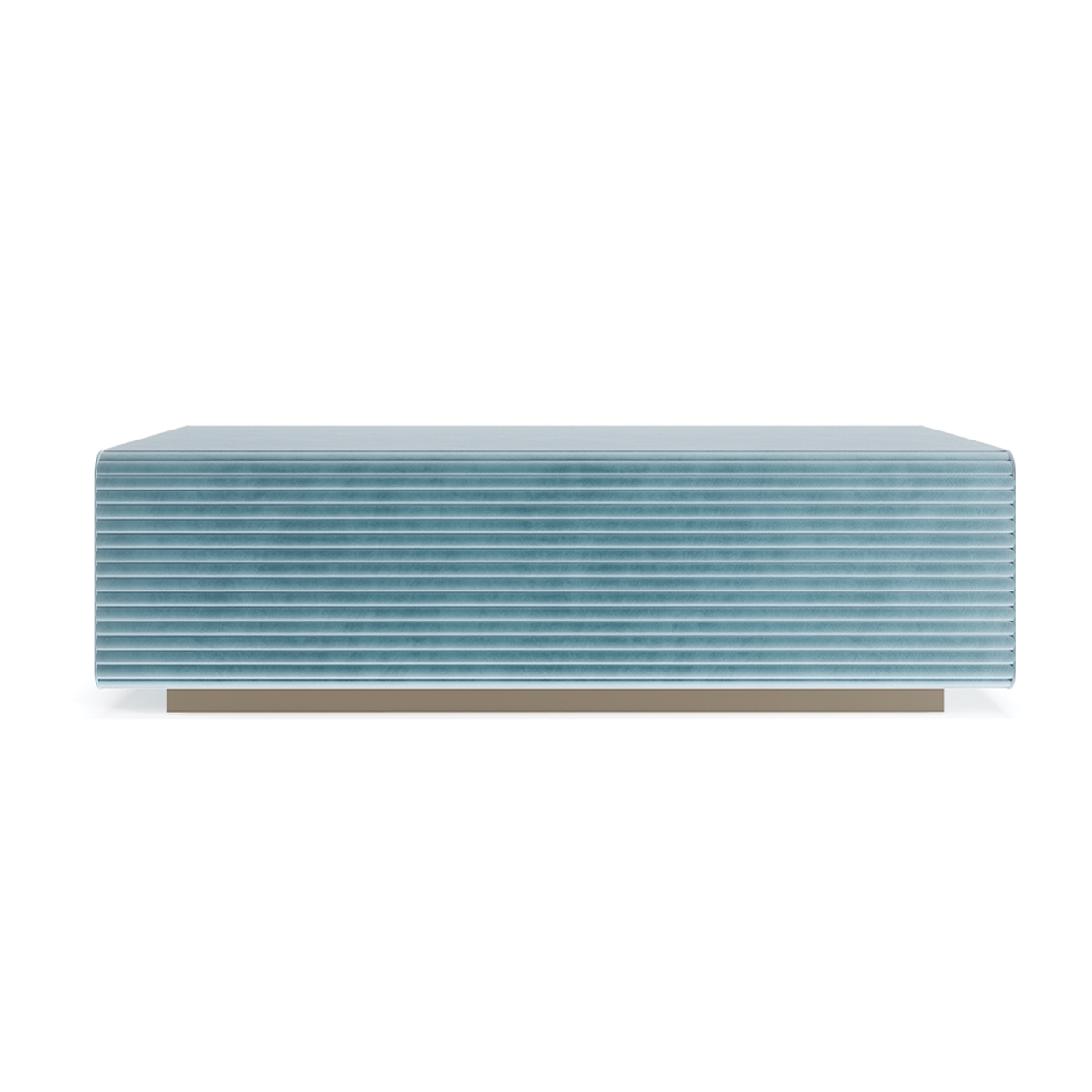 Padded bench / ottoman covered in leather or fabric with quilting. Plinth in Bronze (100M) finish.