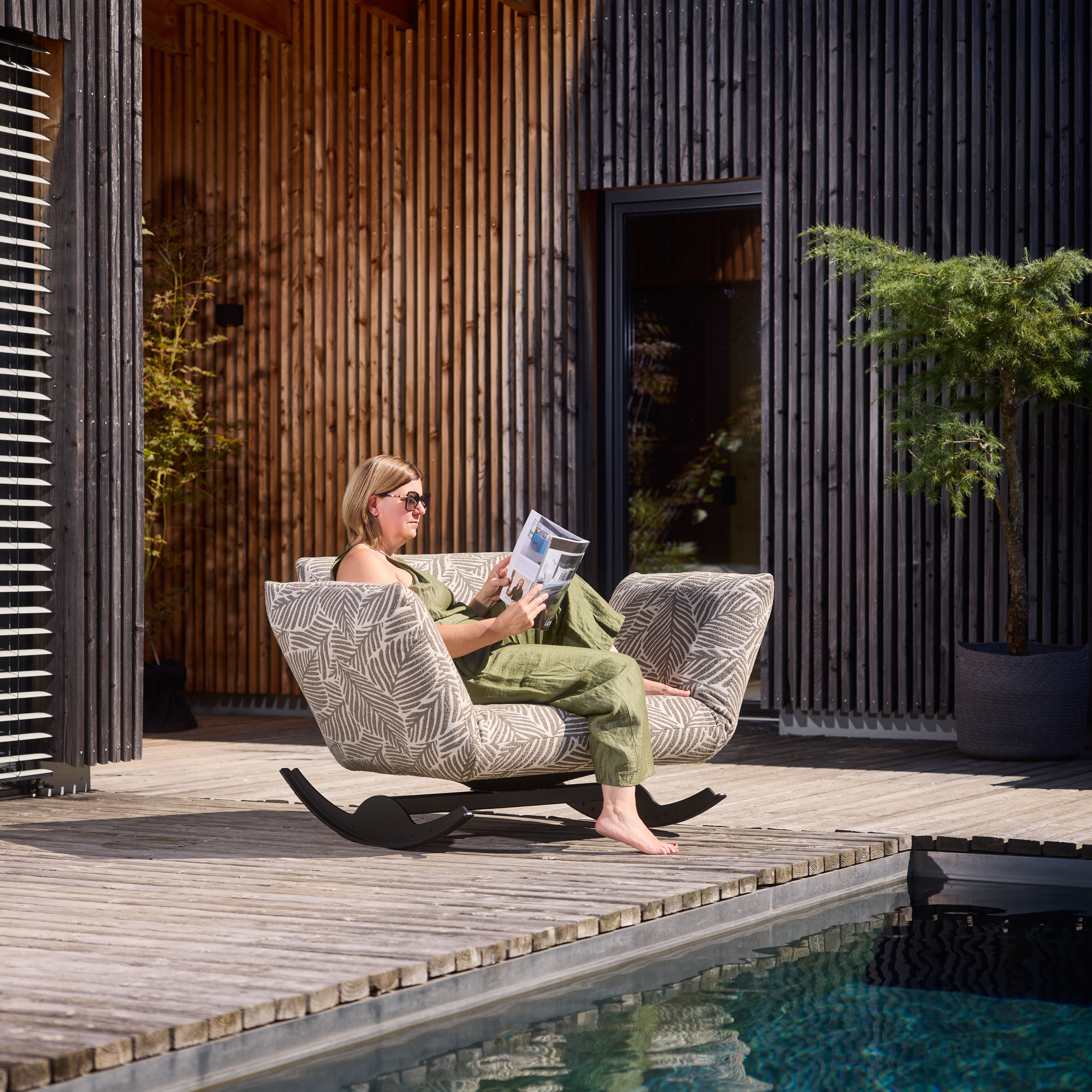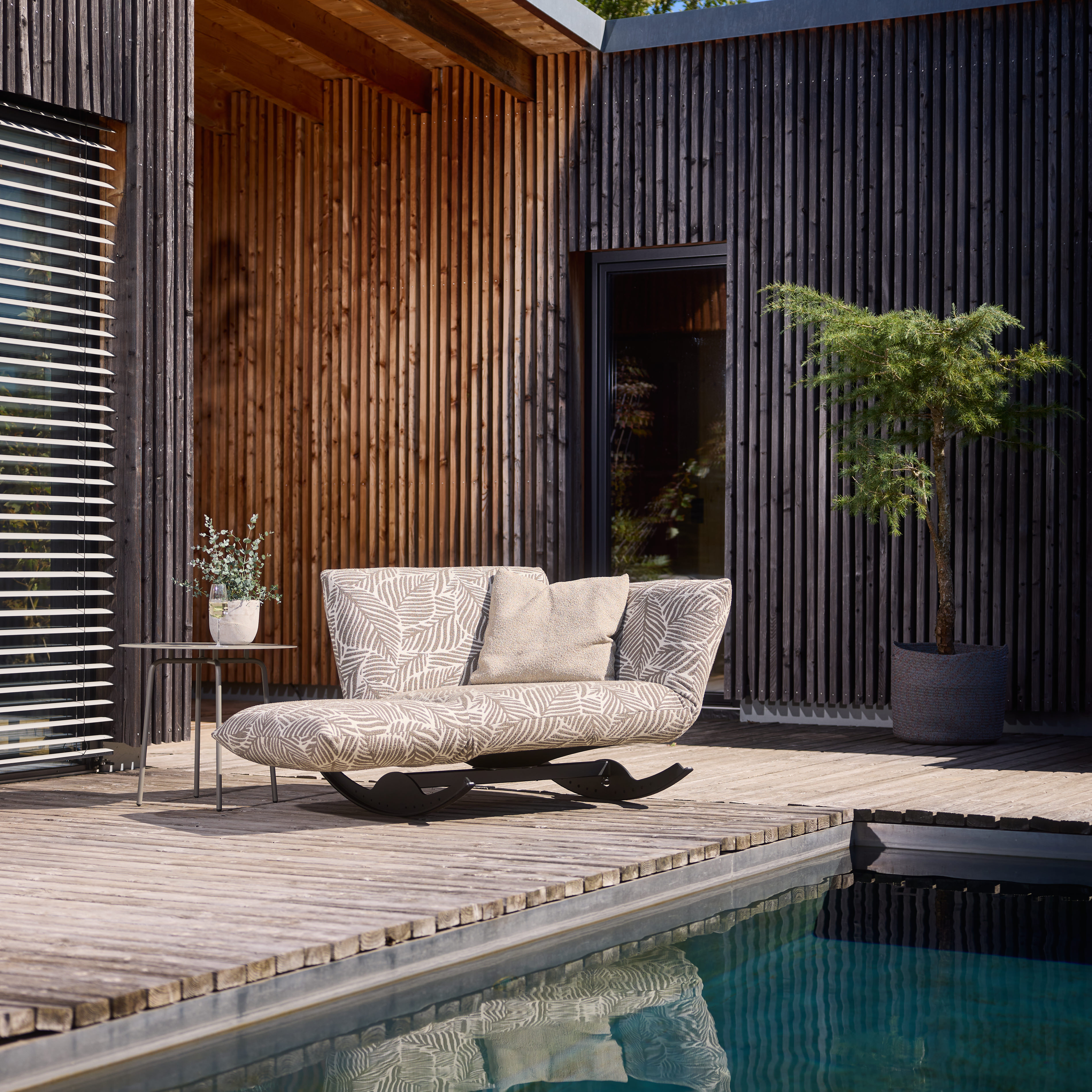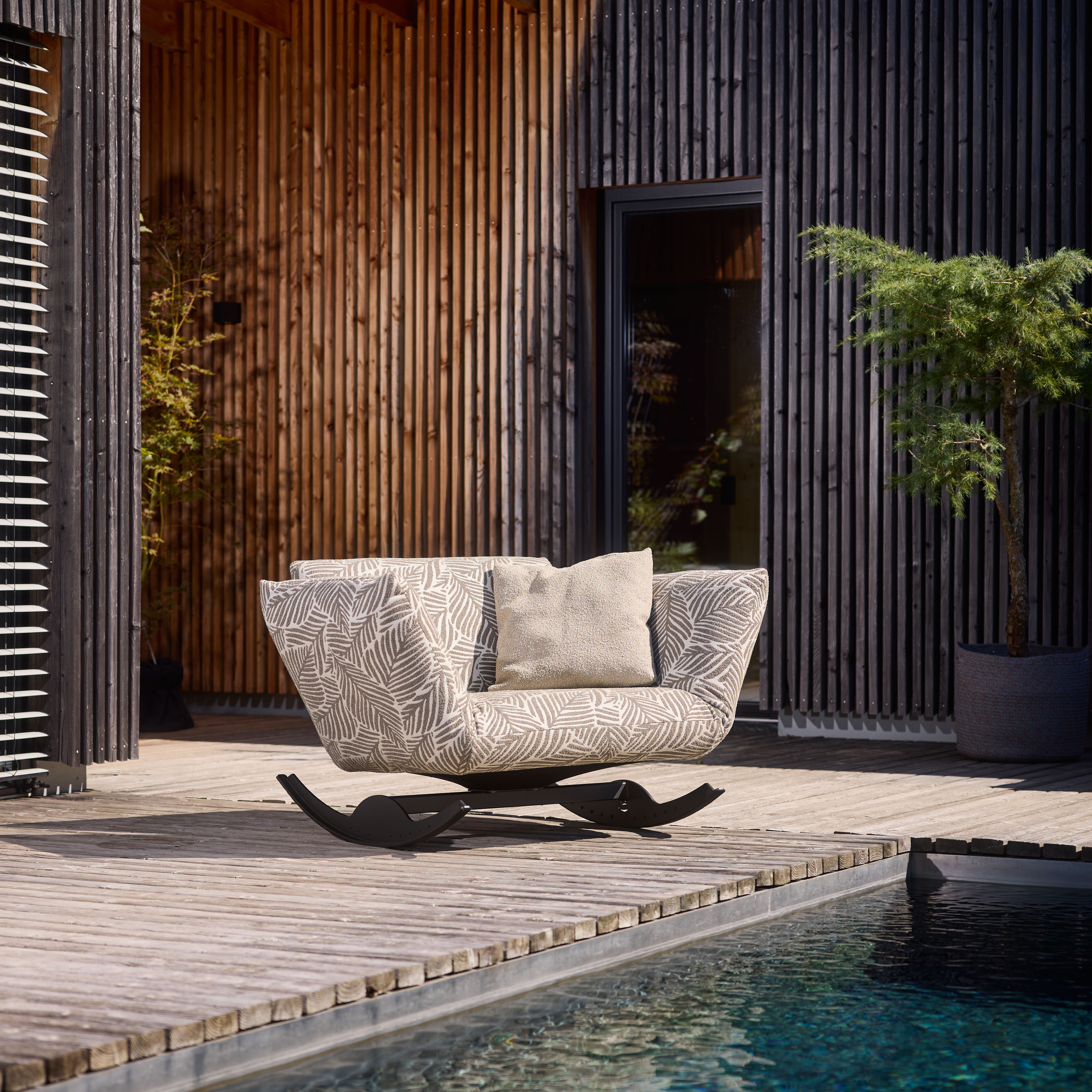 Outdoor loveseat with rocking function and adjustable armrests and back cushions.