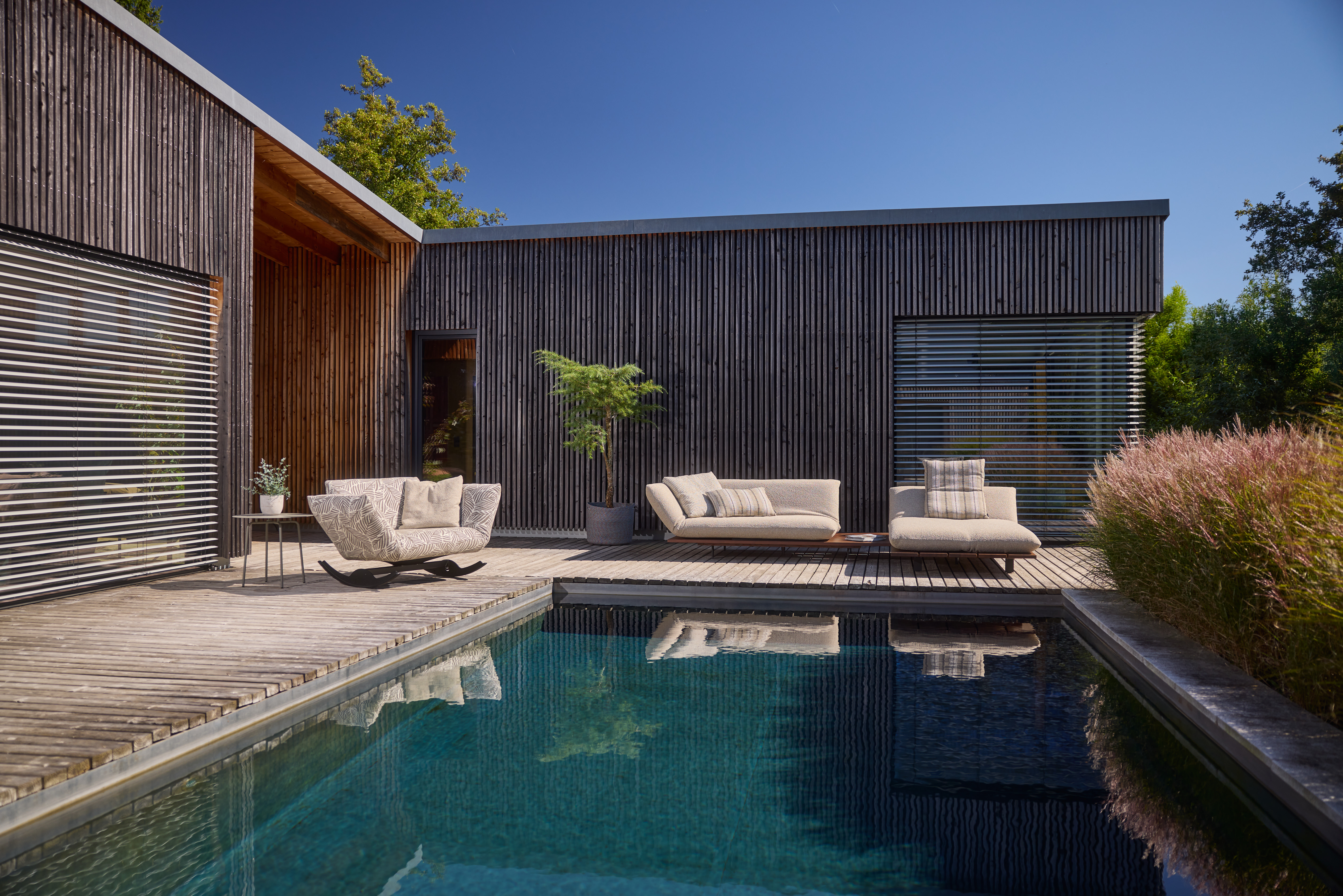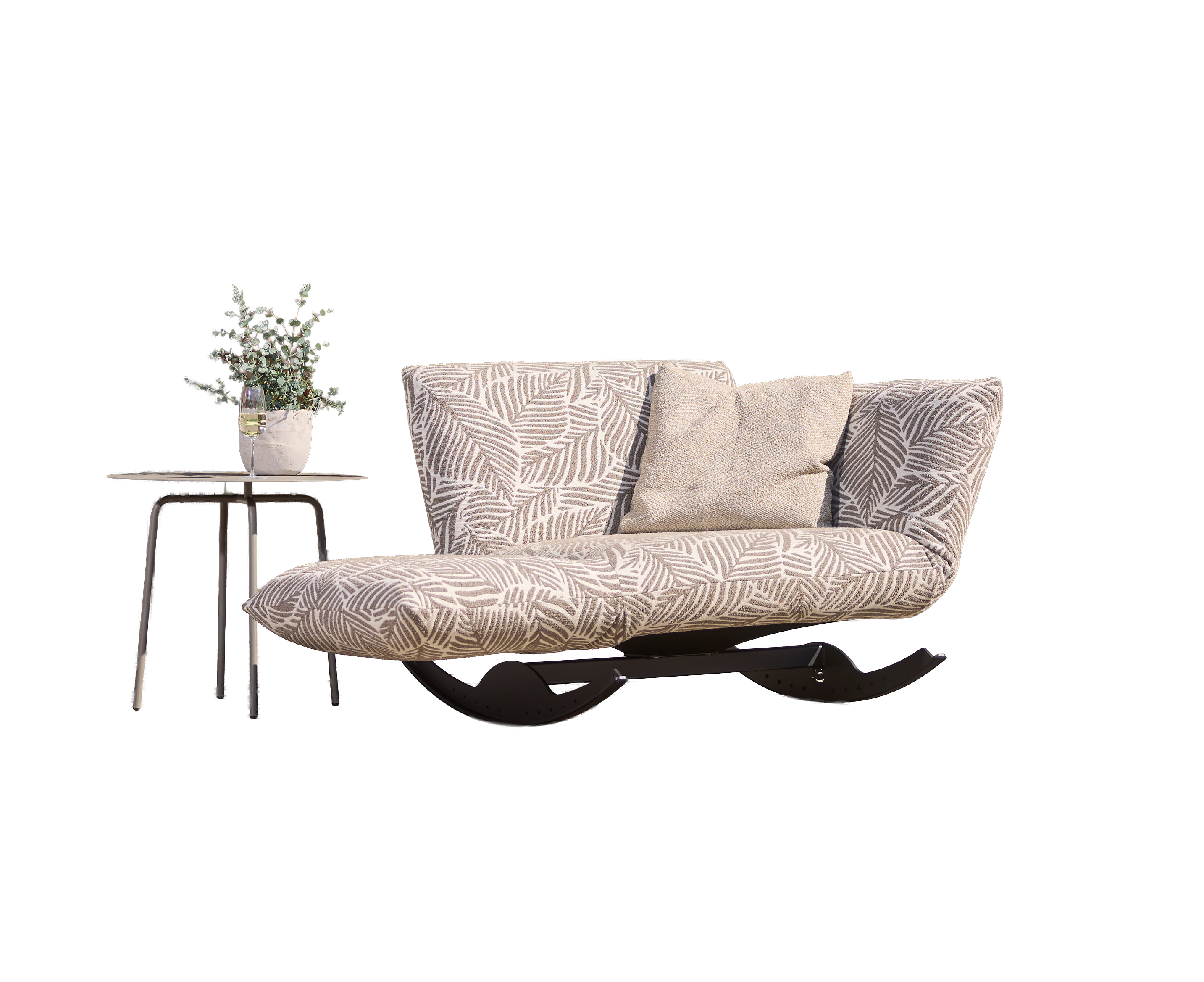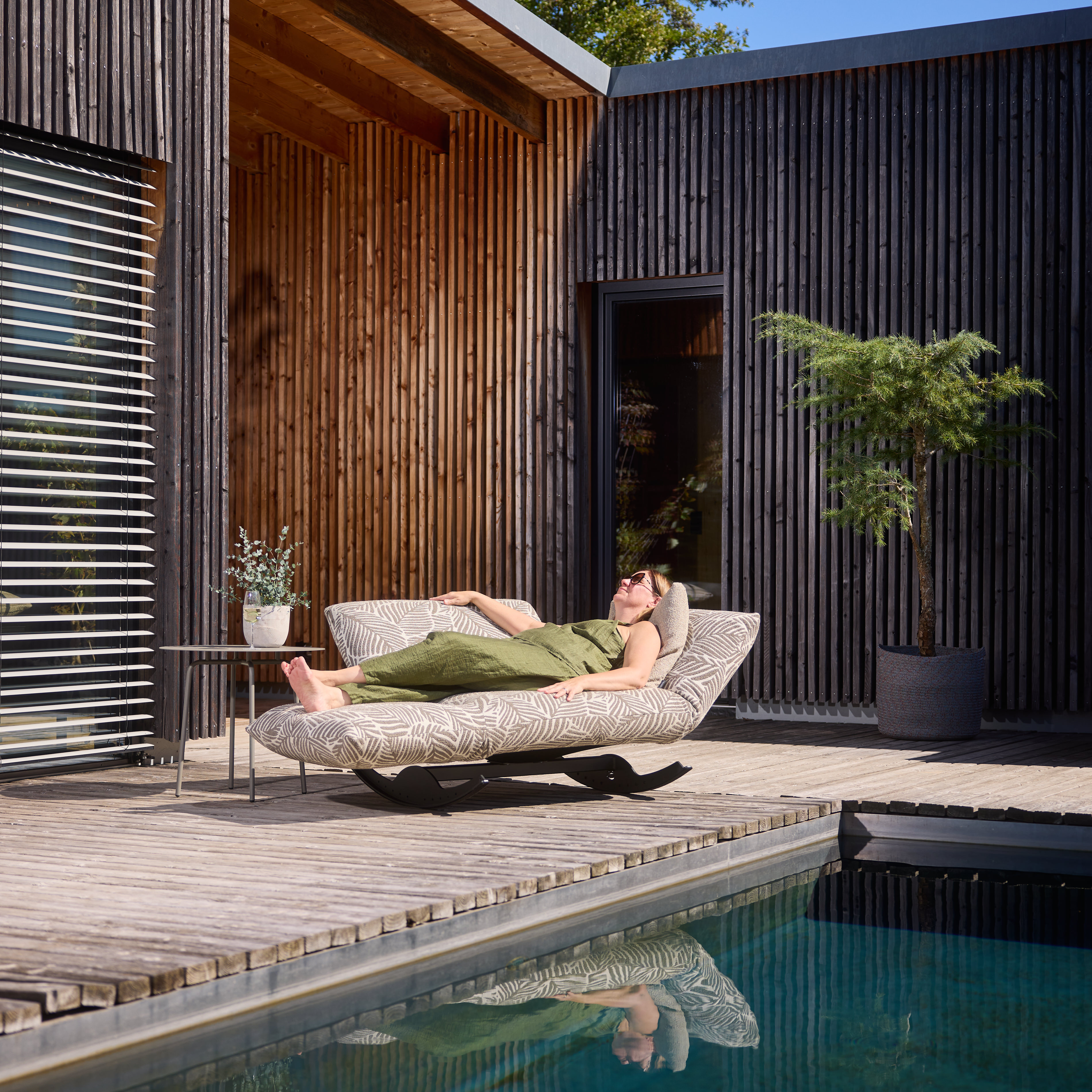 Outdoor loveseat with rocking function and adjustable armrests and back cushions.