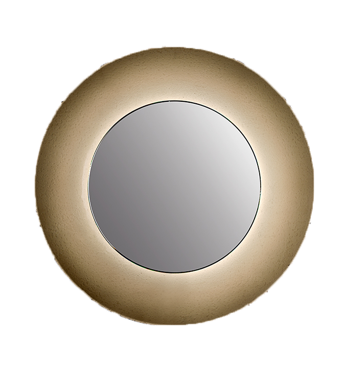 Extra-clear glass mirror and curved frame in Acqua glass available in various colors. LED lighting between mirror and frame.