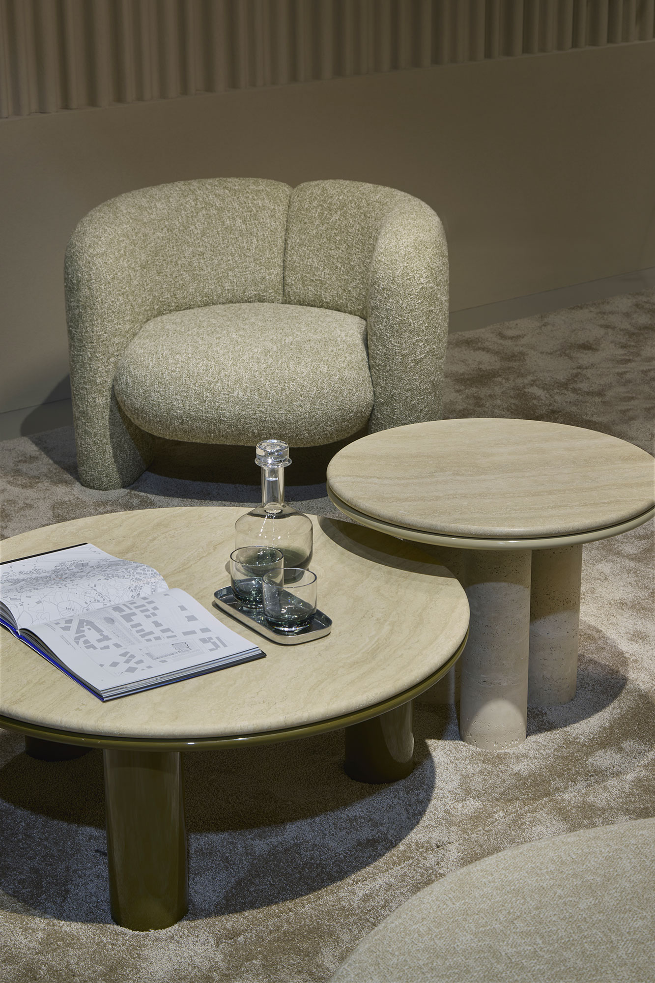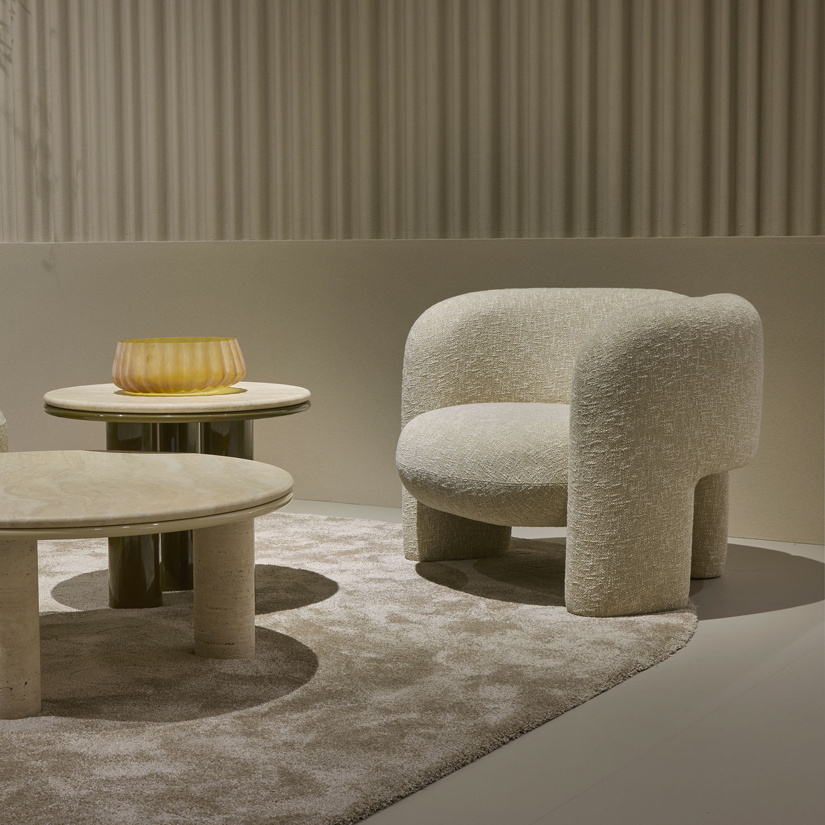 Curved armchair defined by subtle references to retro design. Available in a range of fabric or leather from Giulio Marelli's collection, alternatively you can have your own fabric sent to the factory to be upholstered.