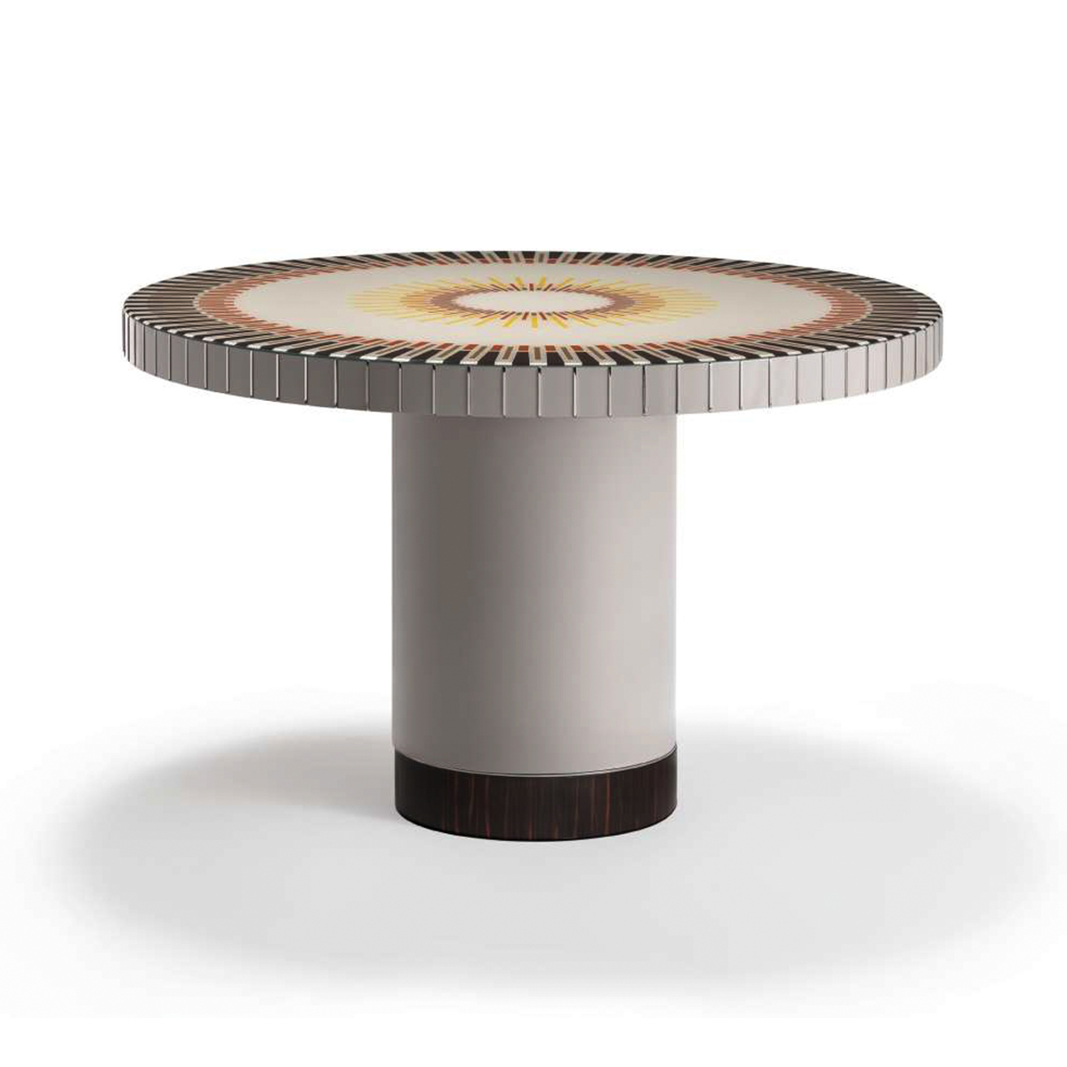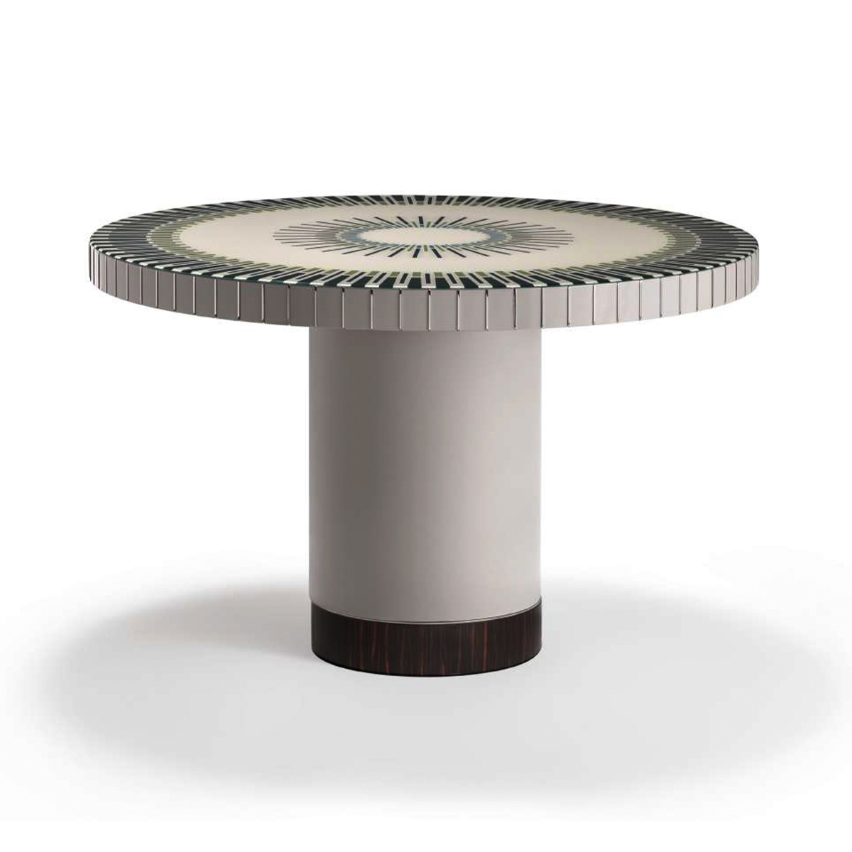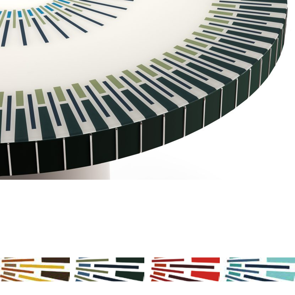 Edge painted in the same color, with polished steel inserts. Base in Platinum finish with polished steel insert and bottom painted in the same color.