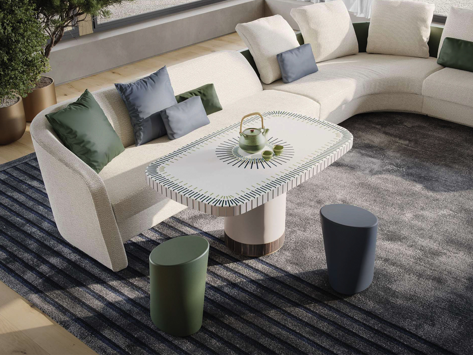 Lounge table with Platinum painted wooden top and digital glass top in 4color variations - .Ancient Gold,Wild Fern, Vivid Orange, Blue haze.