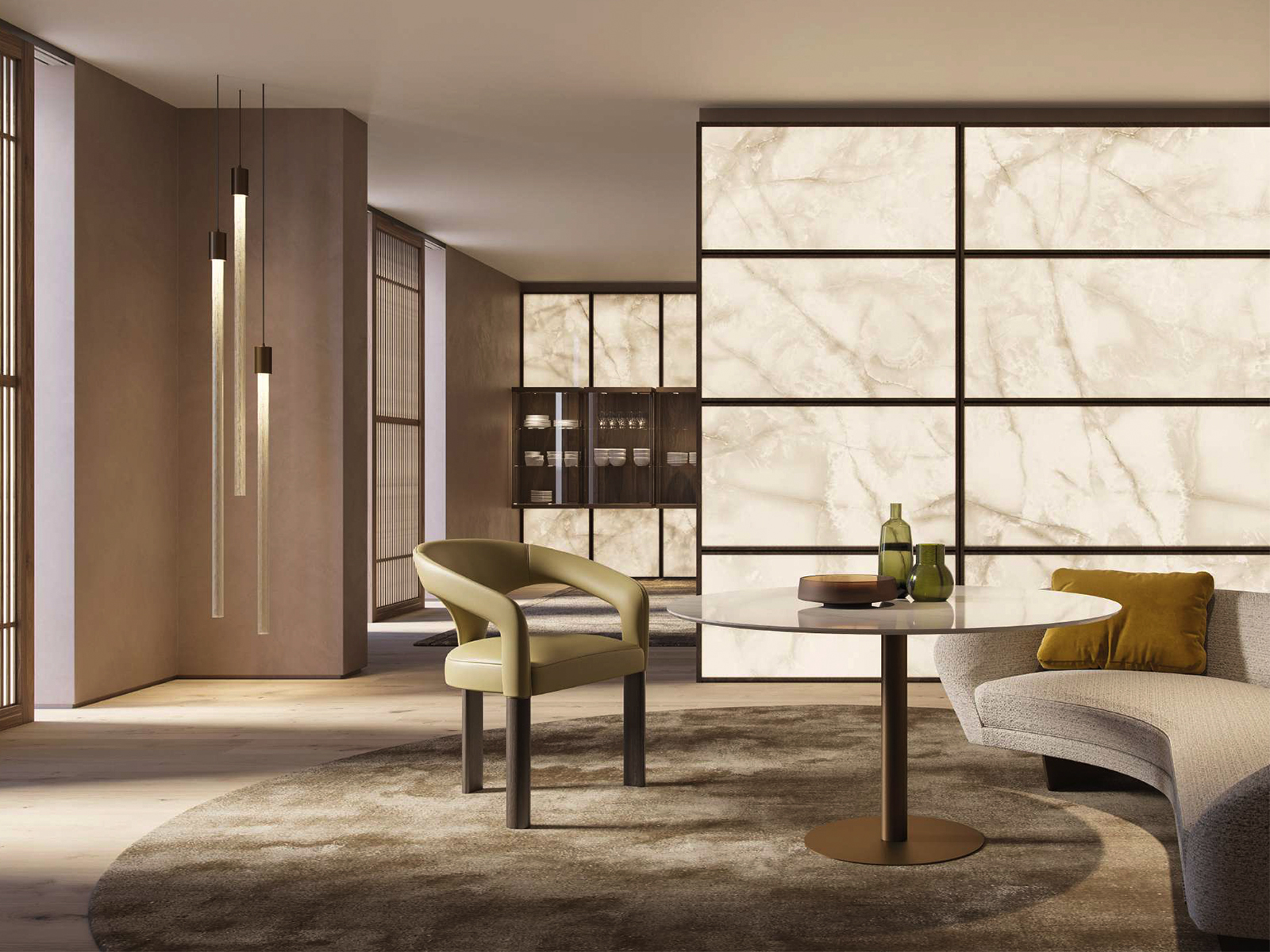 Lounge table with tops in marble glass or bevel wood. Bases available in bronze-finished metal or in satin-finished brass, dark brass, or titanium.