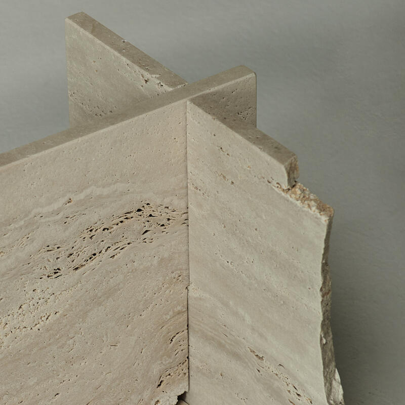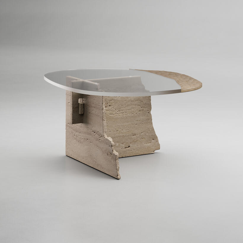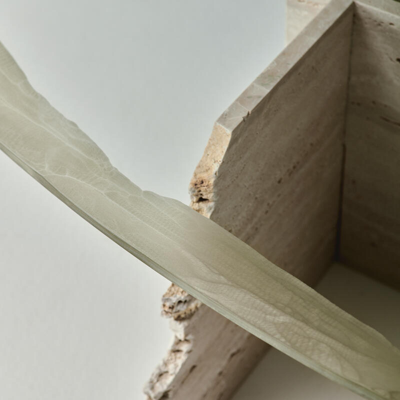 Hand carved travertine marble structure with an extra clear glass top decorated with Miage finish.