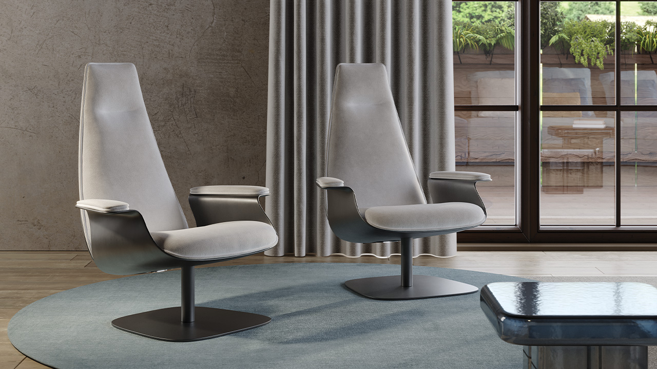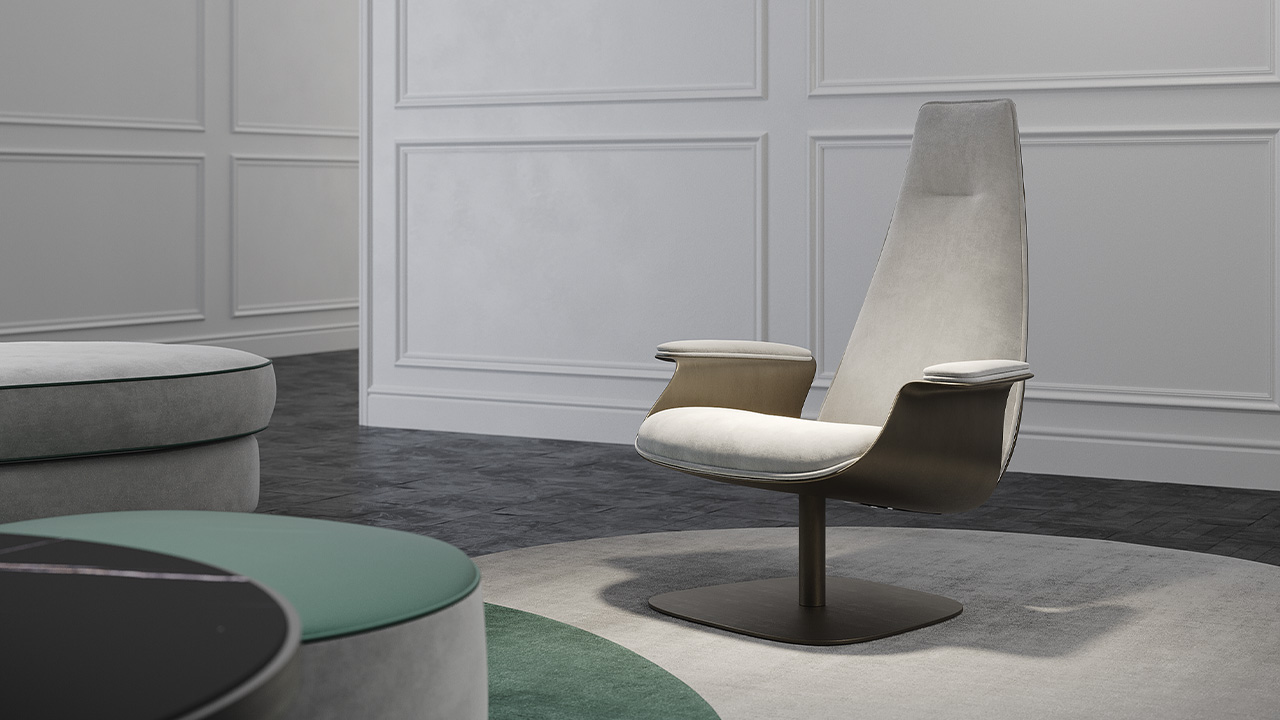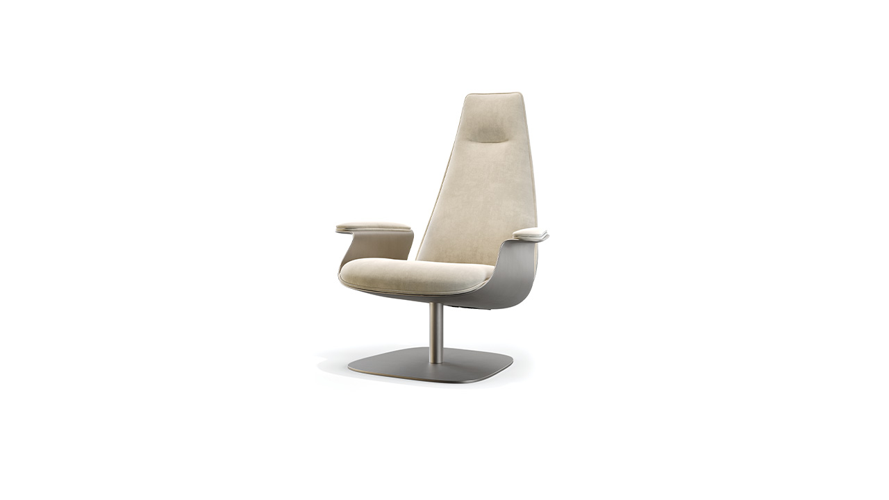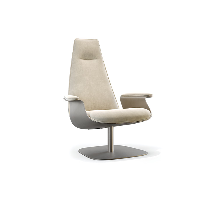 High back armchair with shell in bronze, brass, dark brass or titanium finish and matching round swivel base. Upholstery in leather or in fabric.