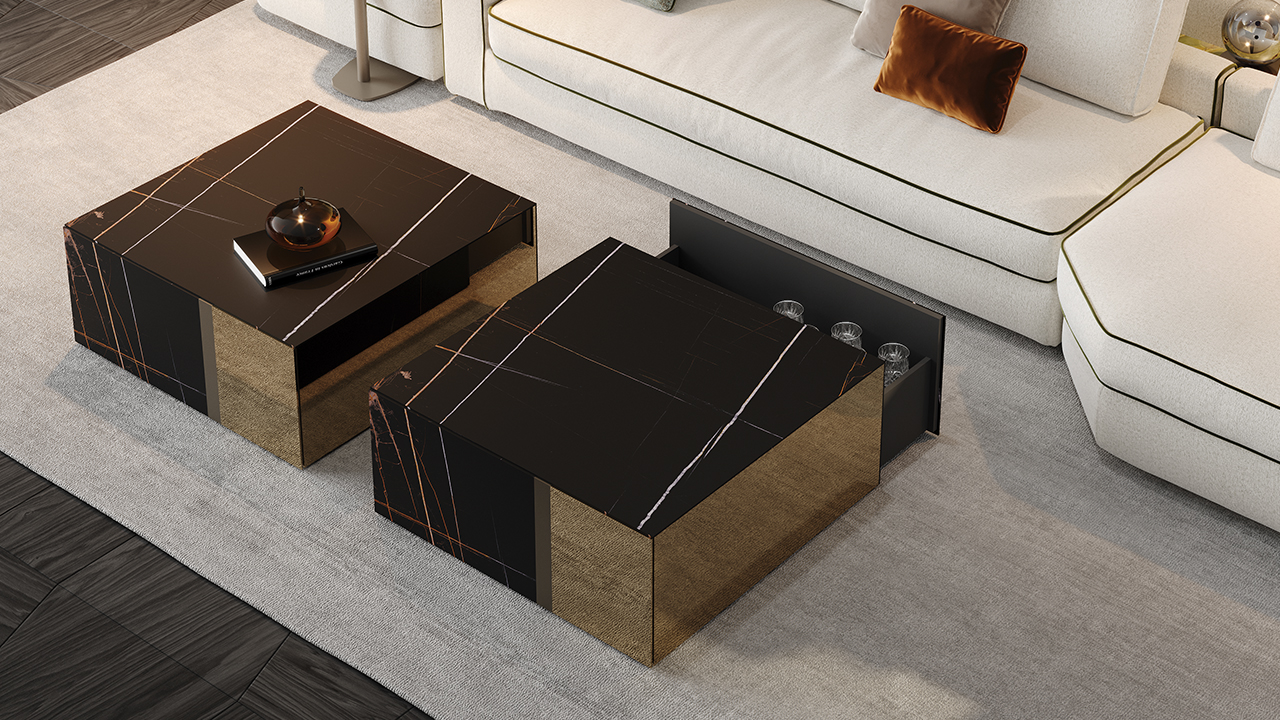 Coffee table with drawer externally covered in MarmoReflex/ LegnoReflex glass with inlays in bBronze finish and in bronze mirror.