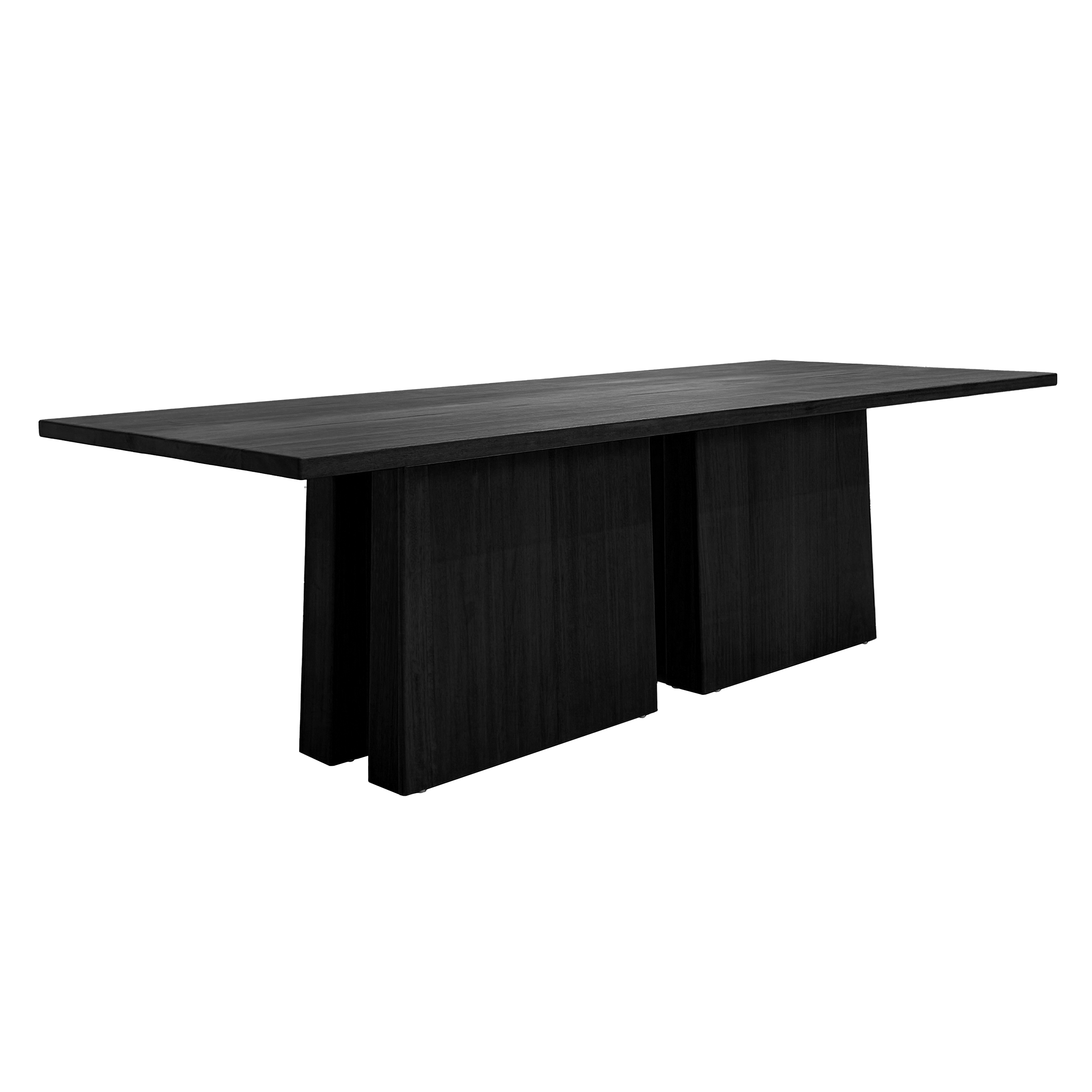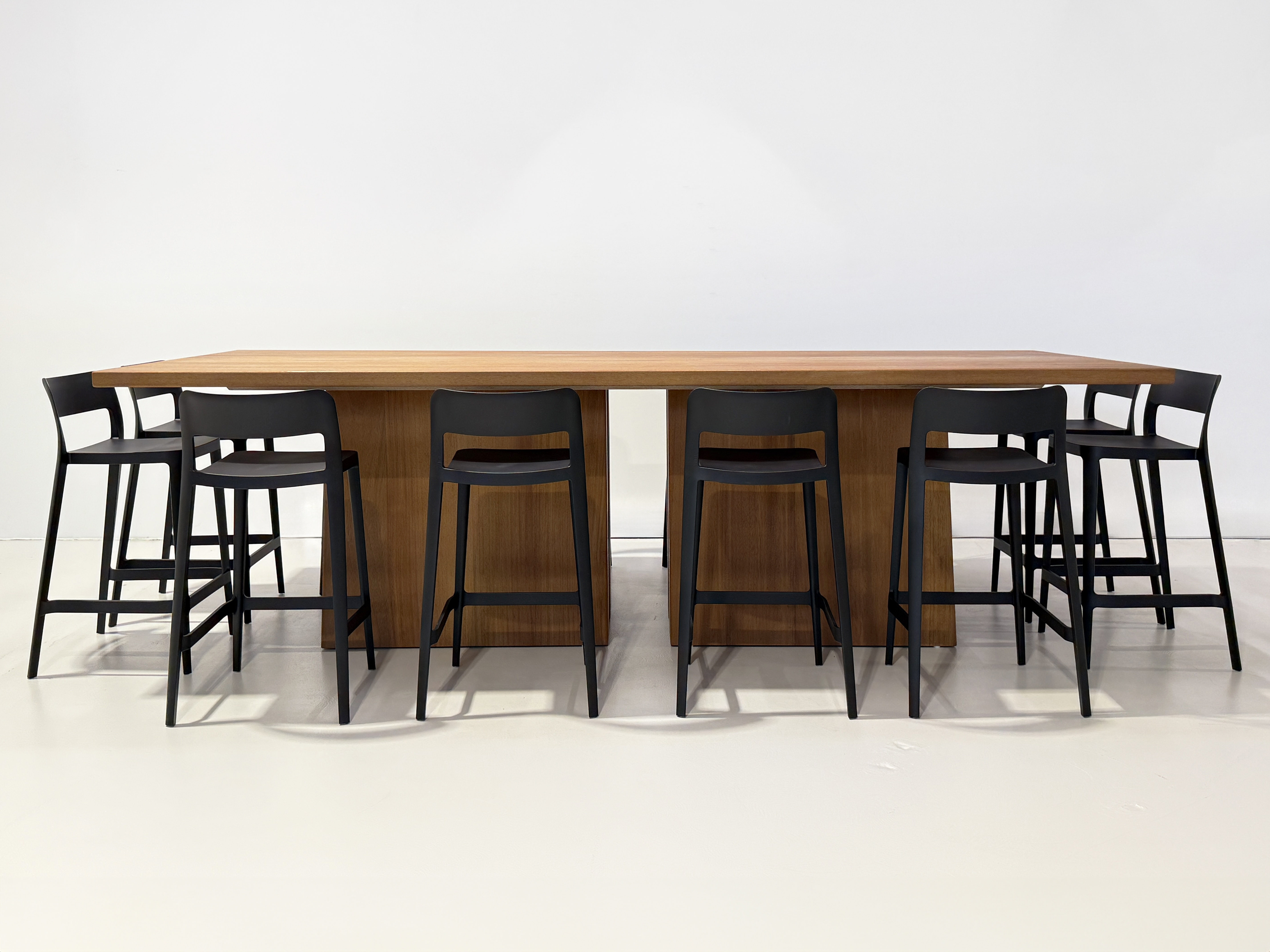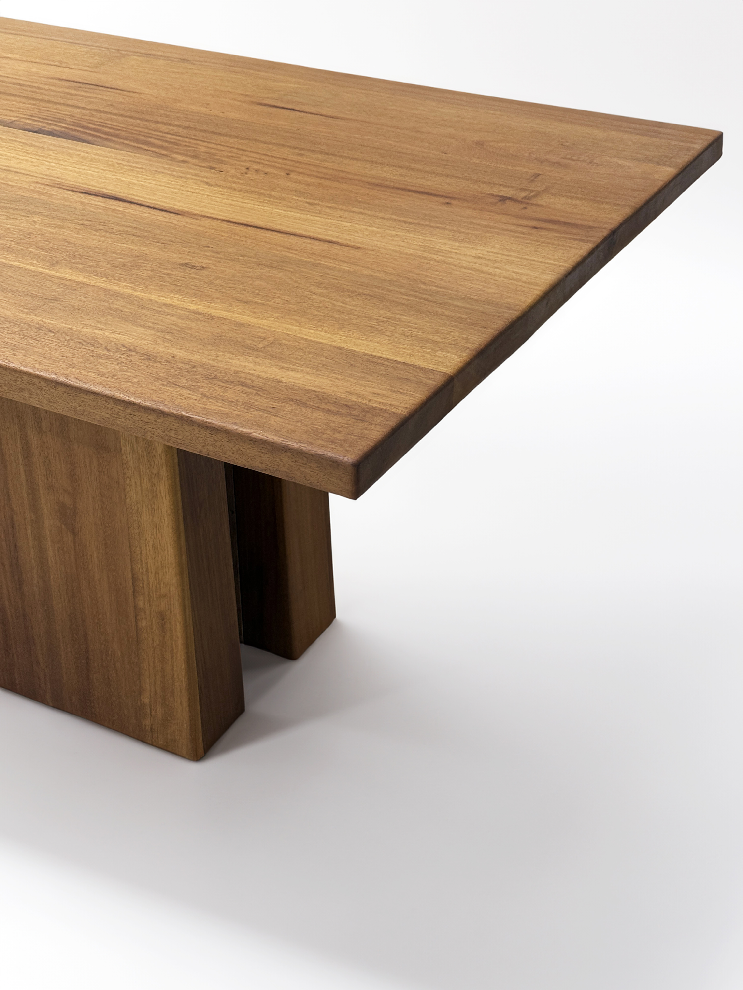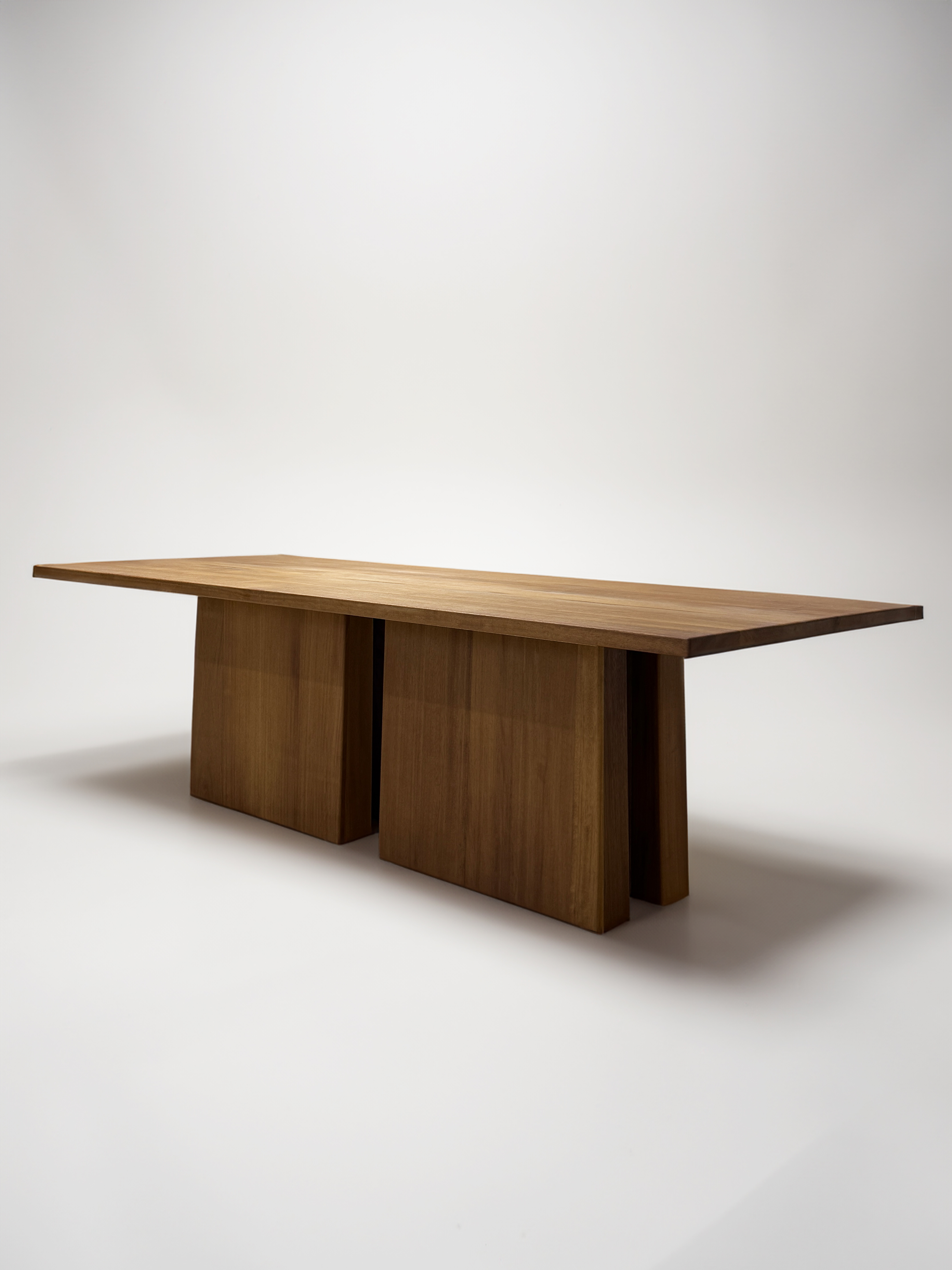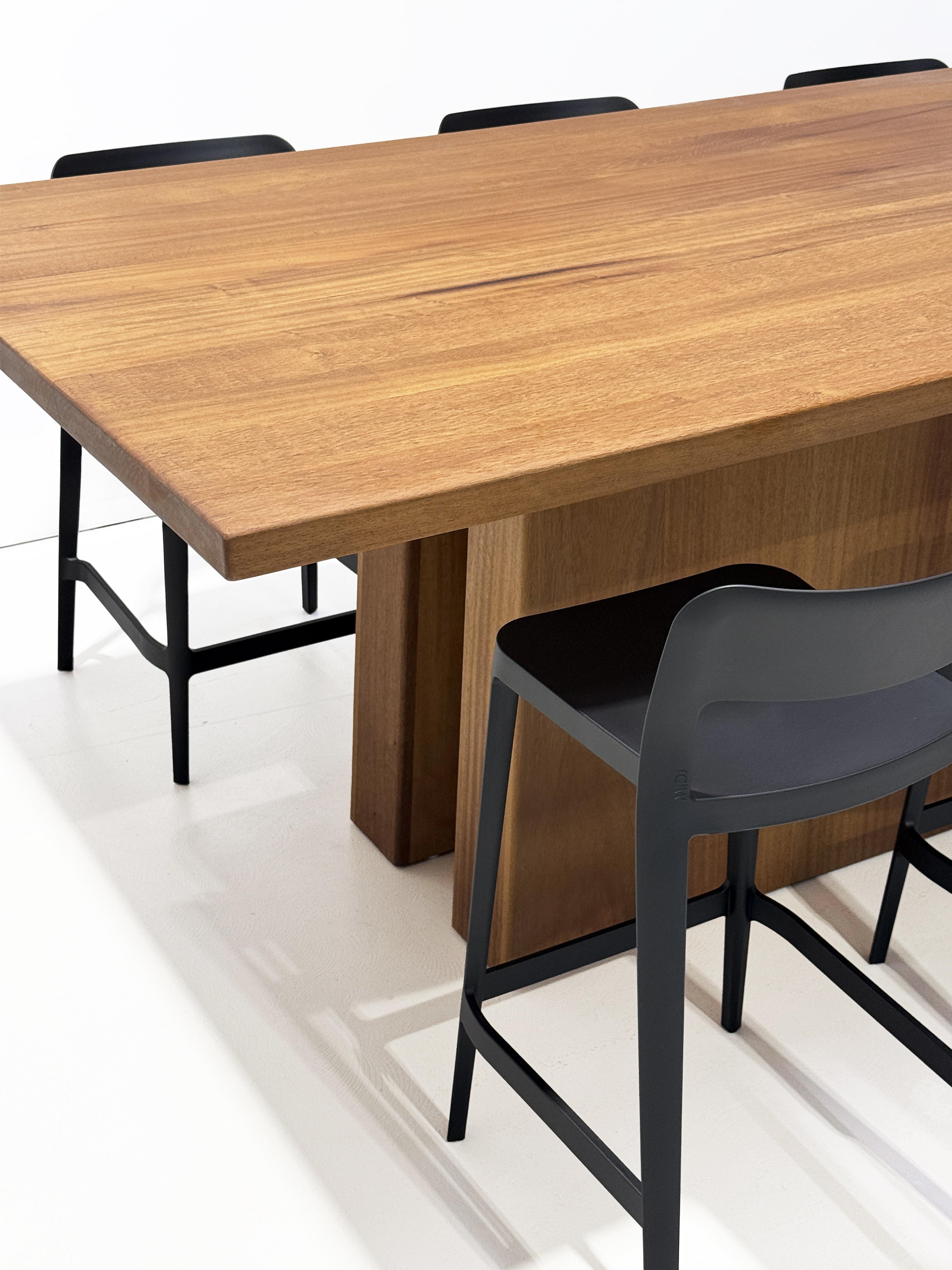 A sculptural timber bar dining table. Defined by an architectural base and generous proportions, it offers a refined centerpiece for dining.