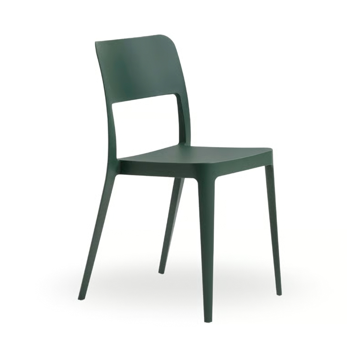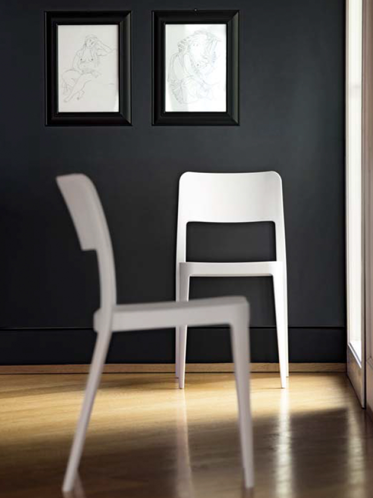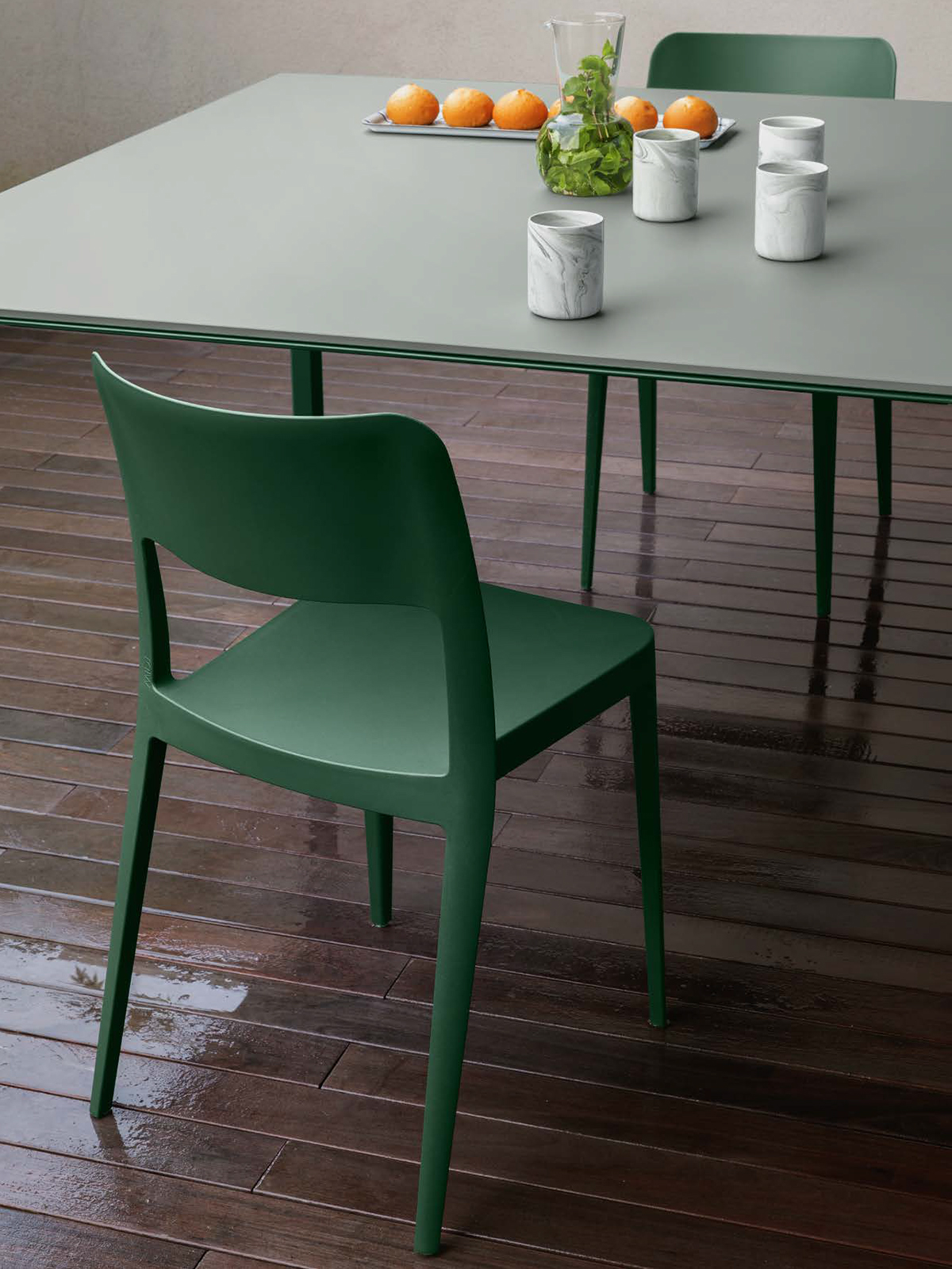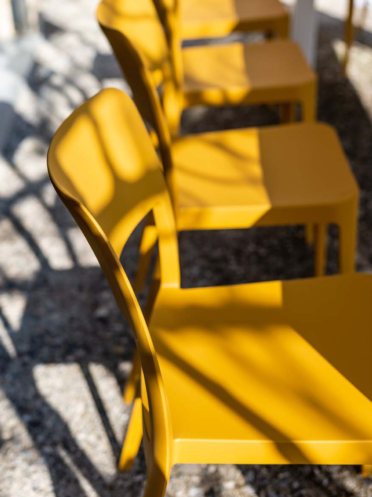 Stackable chair with four leg frame, made in polypropylene and available in 10 different colours. Suitable for indoor or outdoor use.