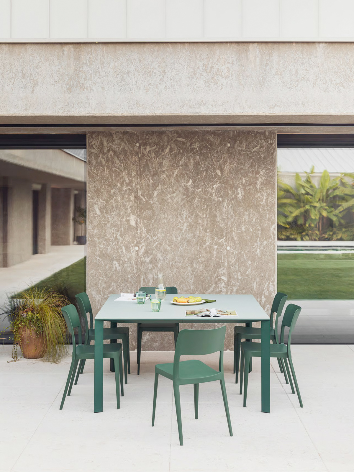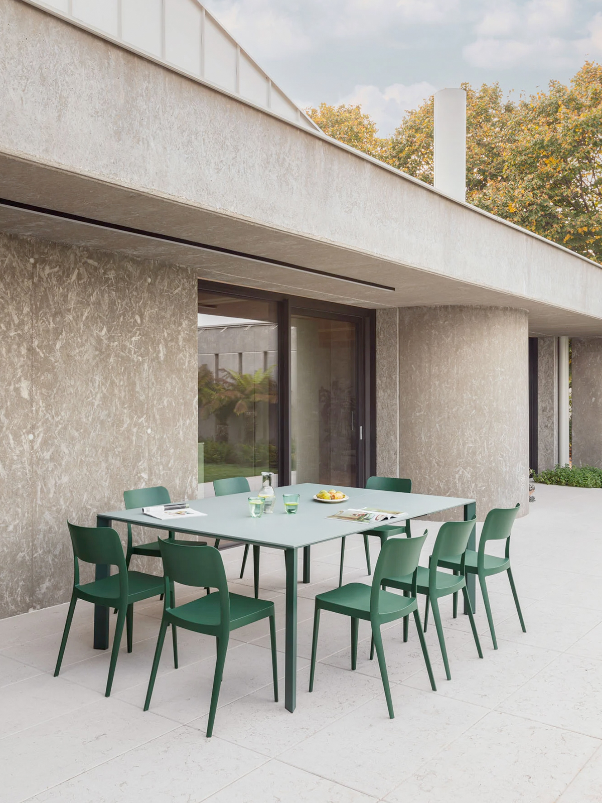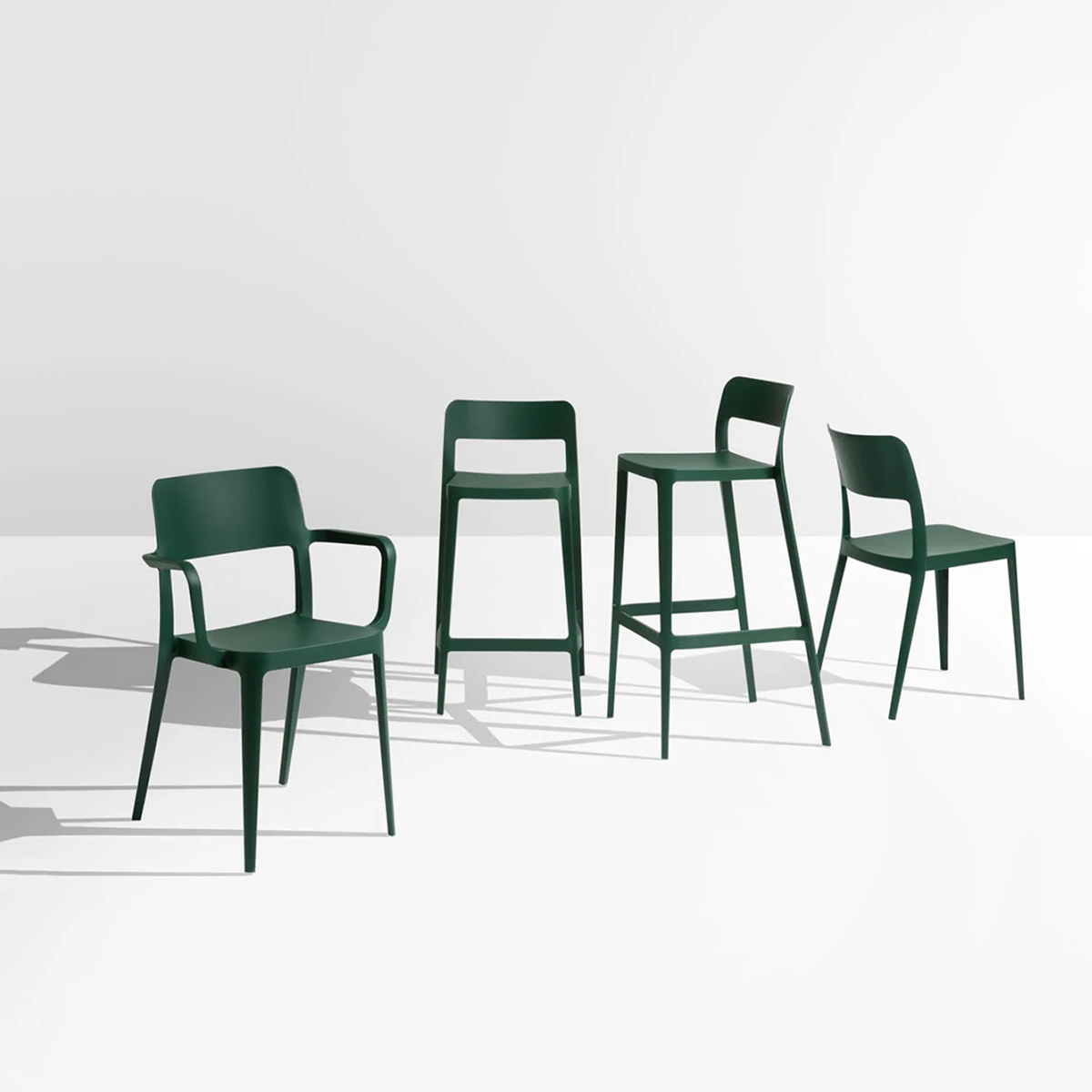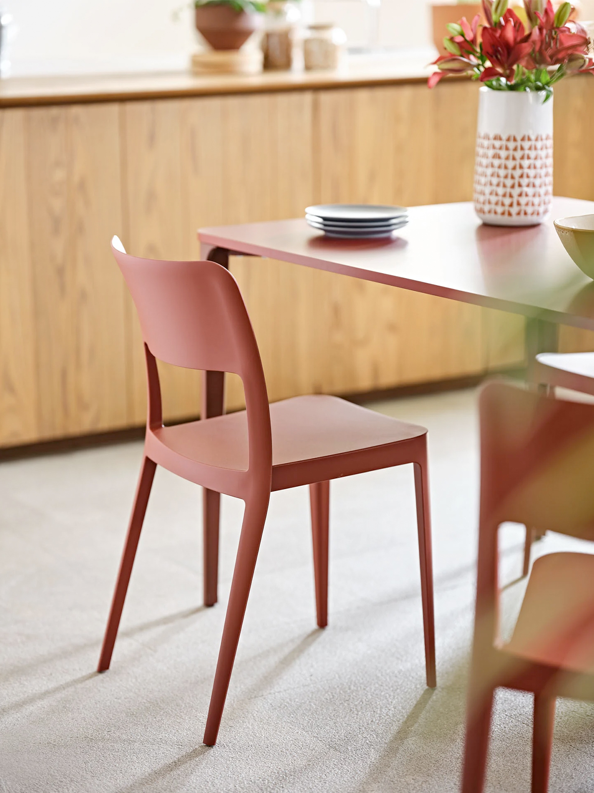 Stackable chair with four leg frame, made in polypropylene and available in 10 different colours. Suitable for indoor or outdoor use.