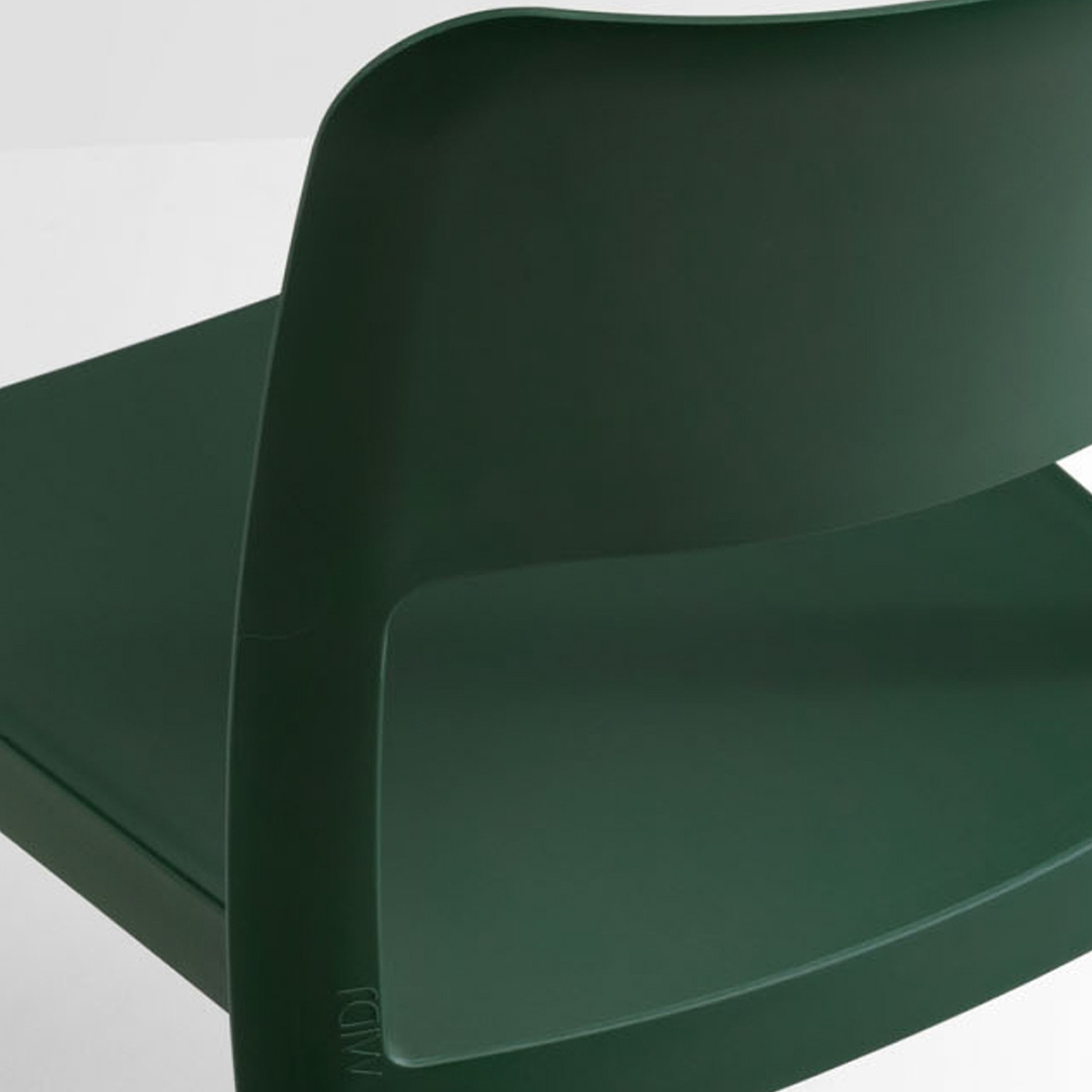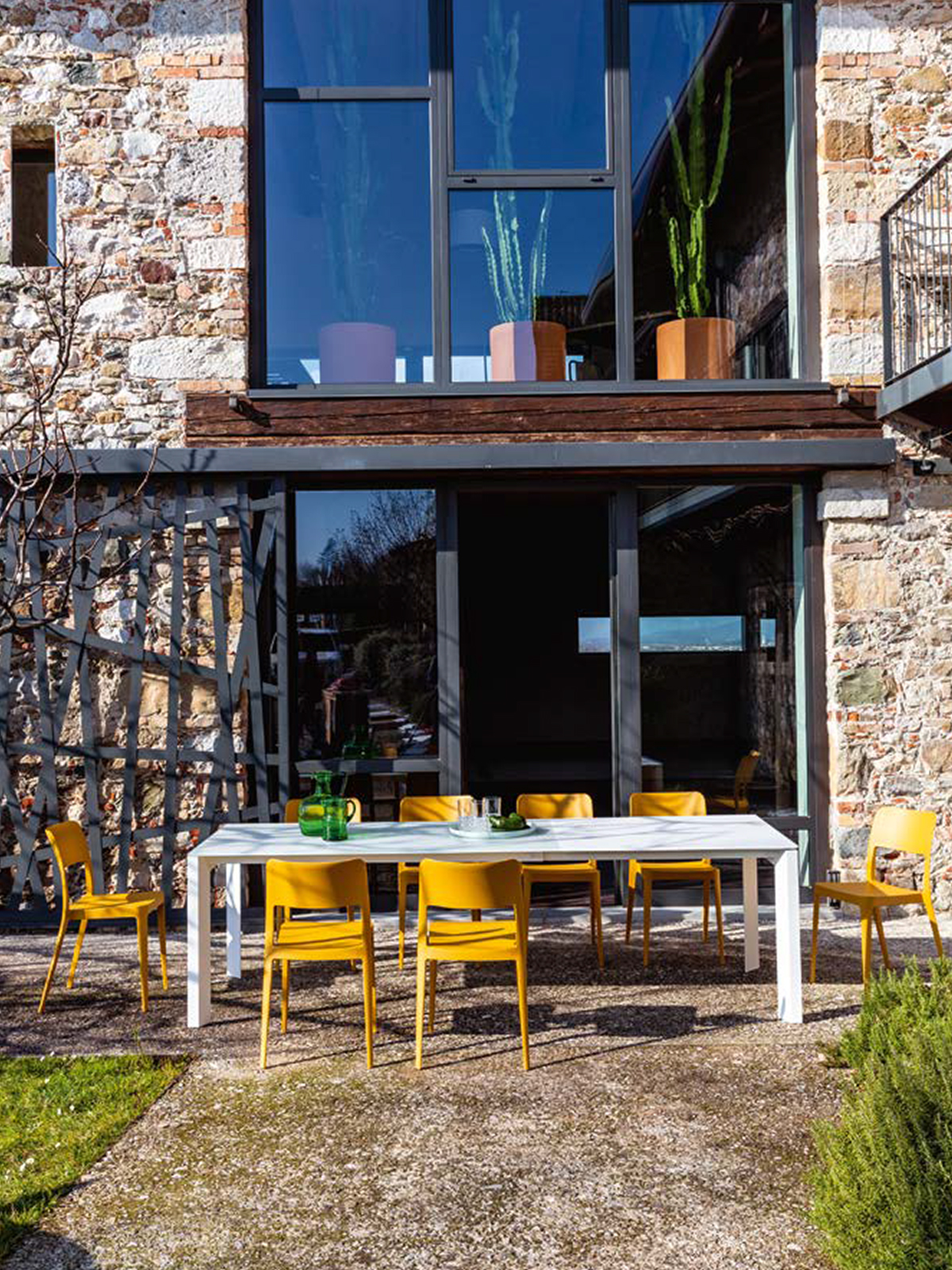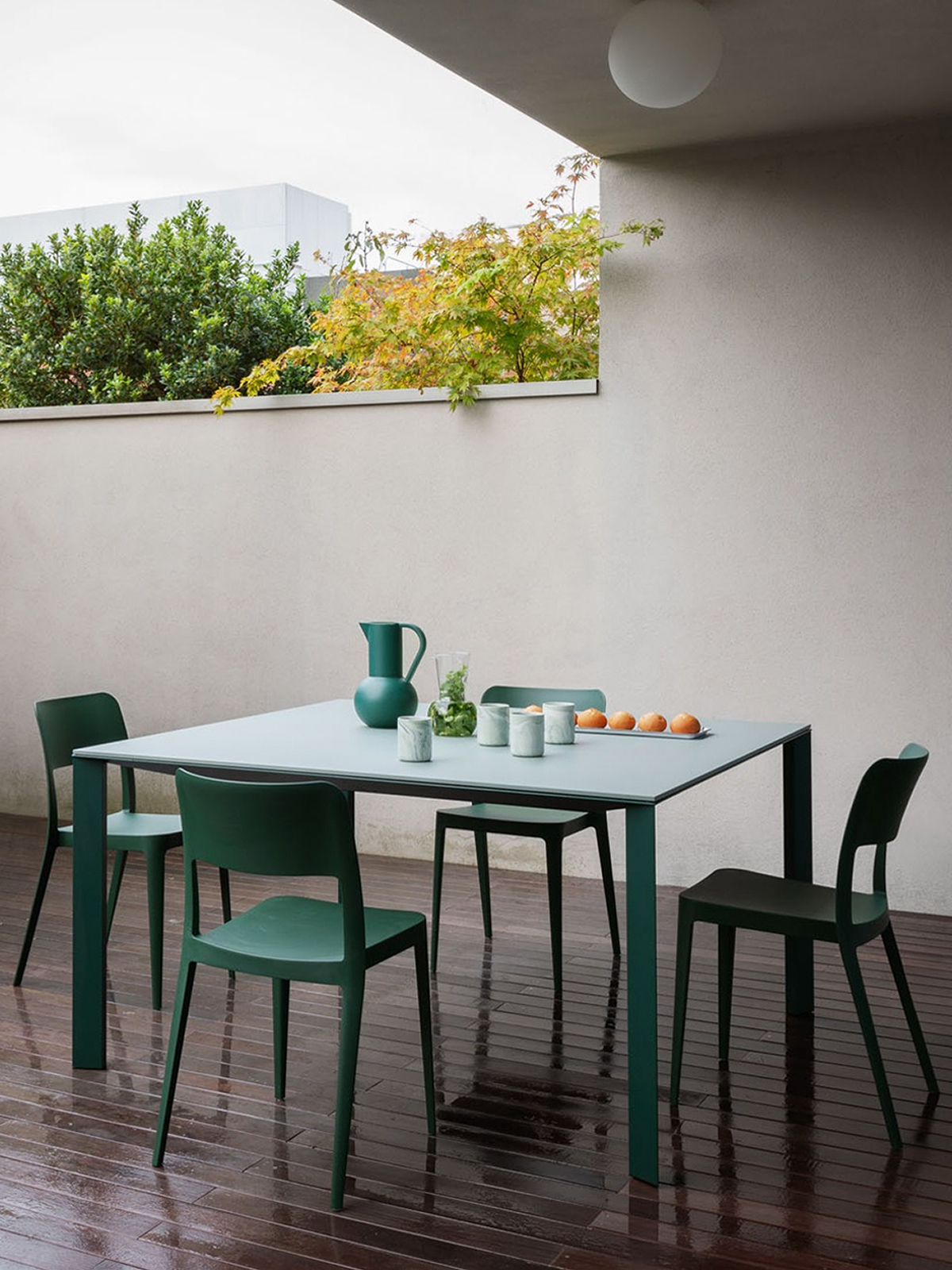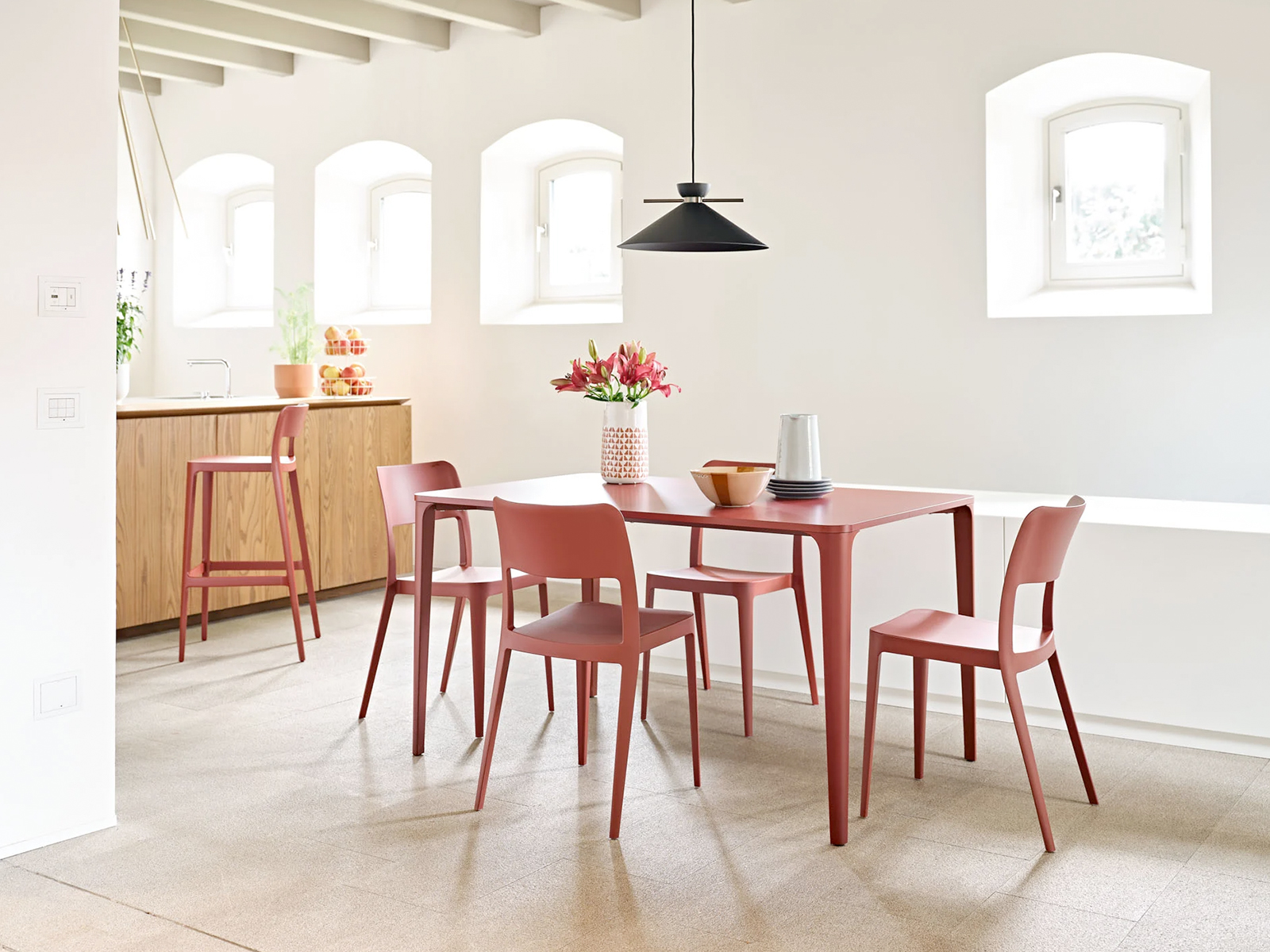 Stackable chair with four leg frame, made in polypropylene and available in 10 different colours. Suitable for indoor or outdoor use.