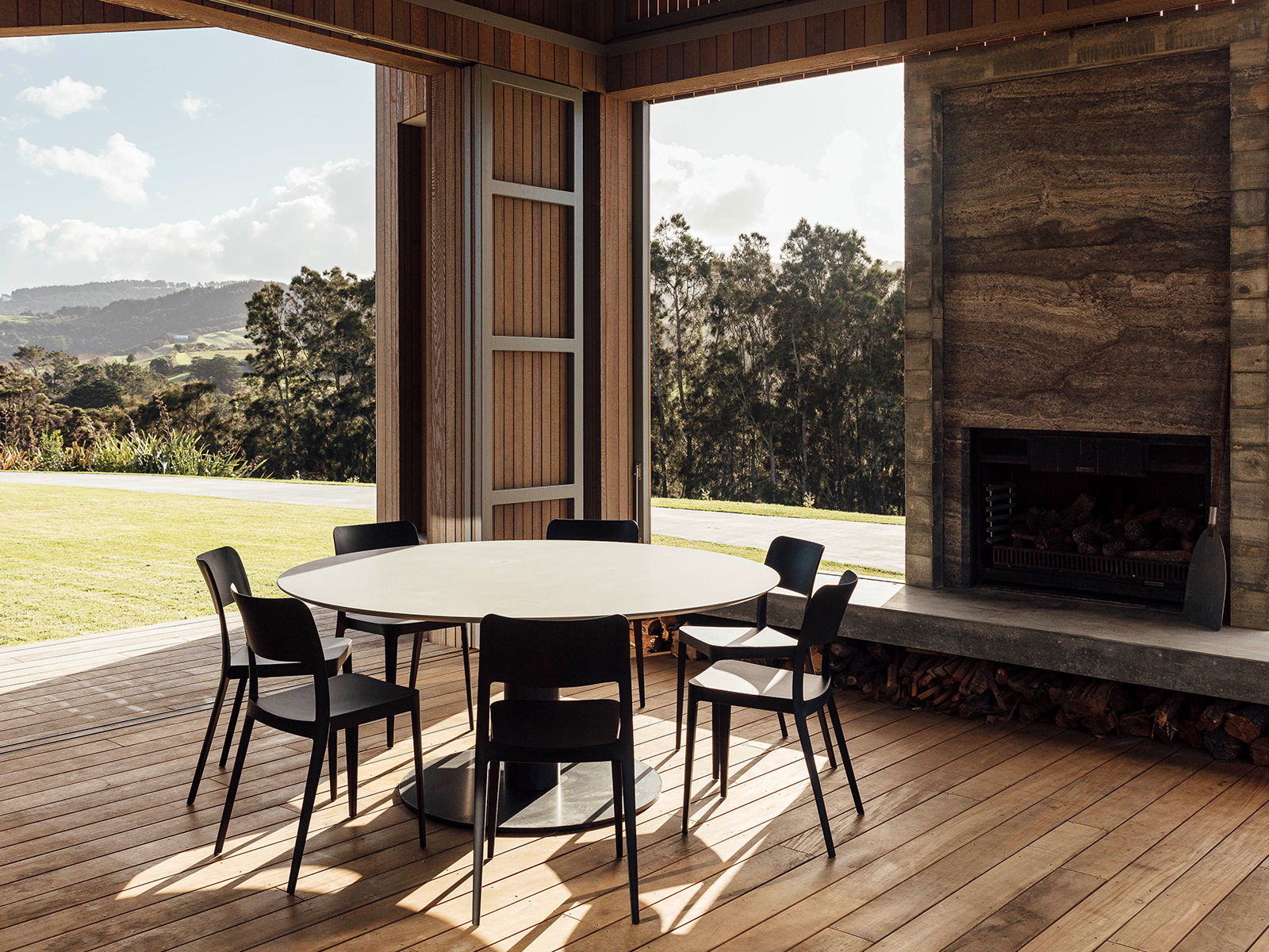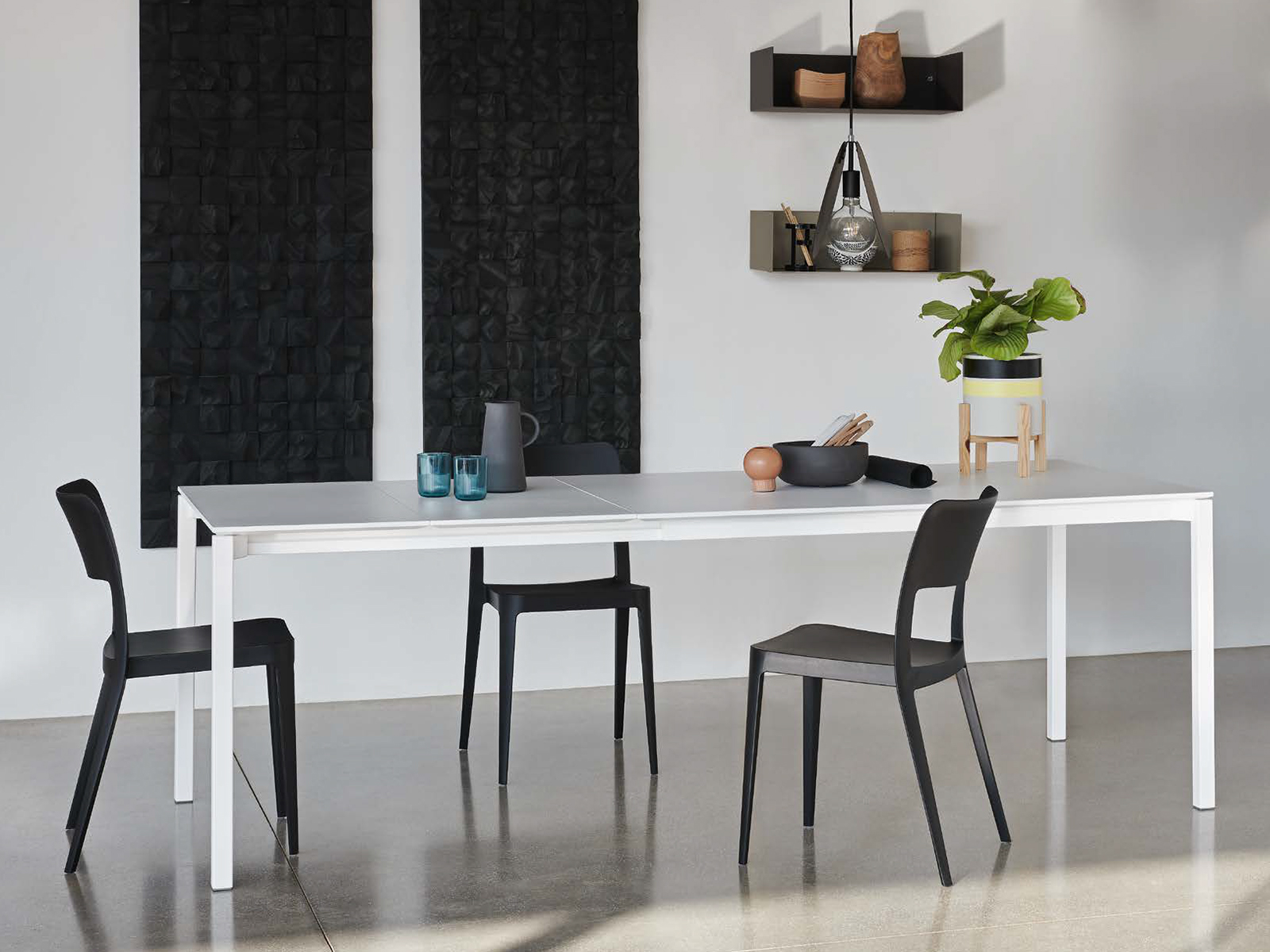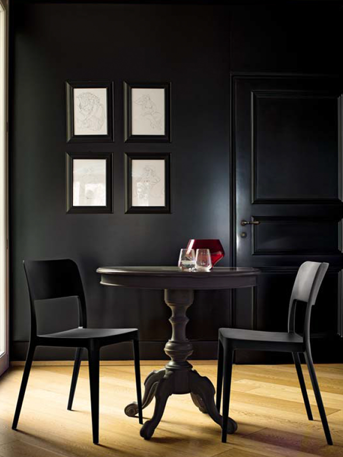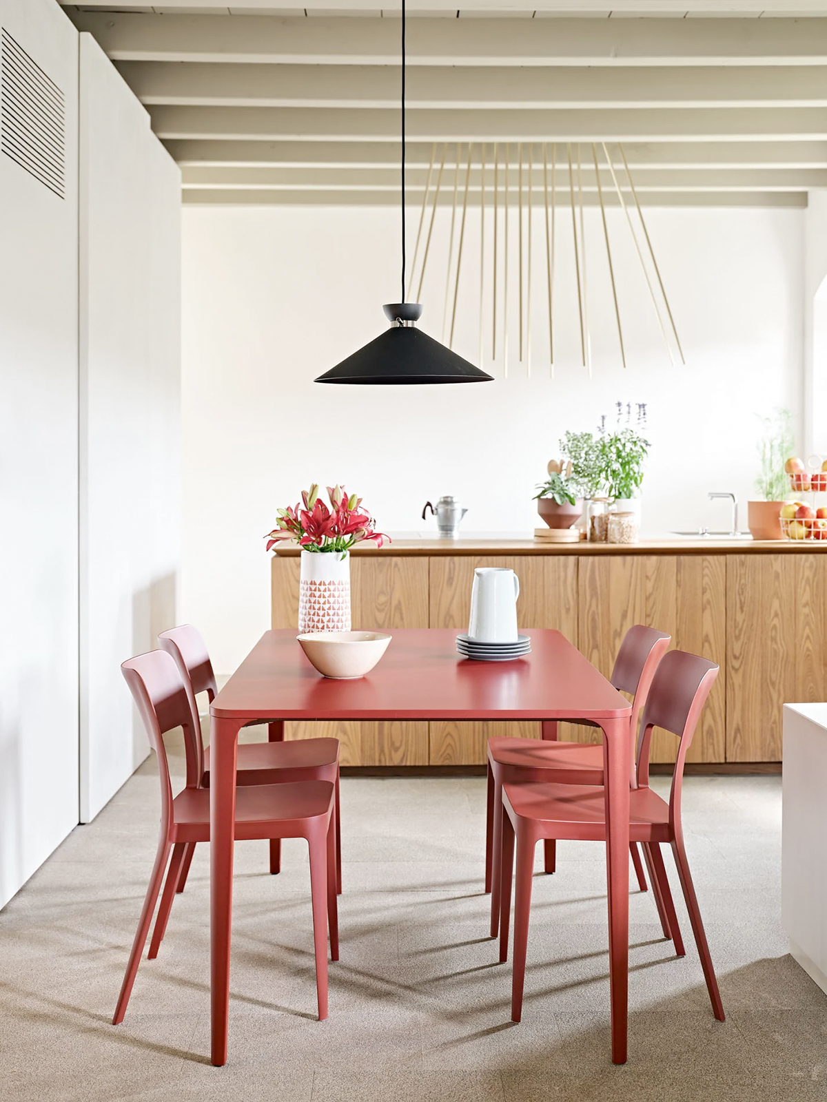 Stackable chair with four leg frame, made in polypropylene and available in 10 different colours. Suitable for indoor or outdoor use.