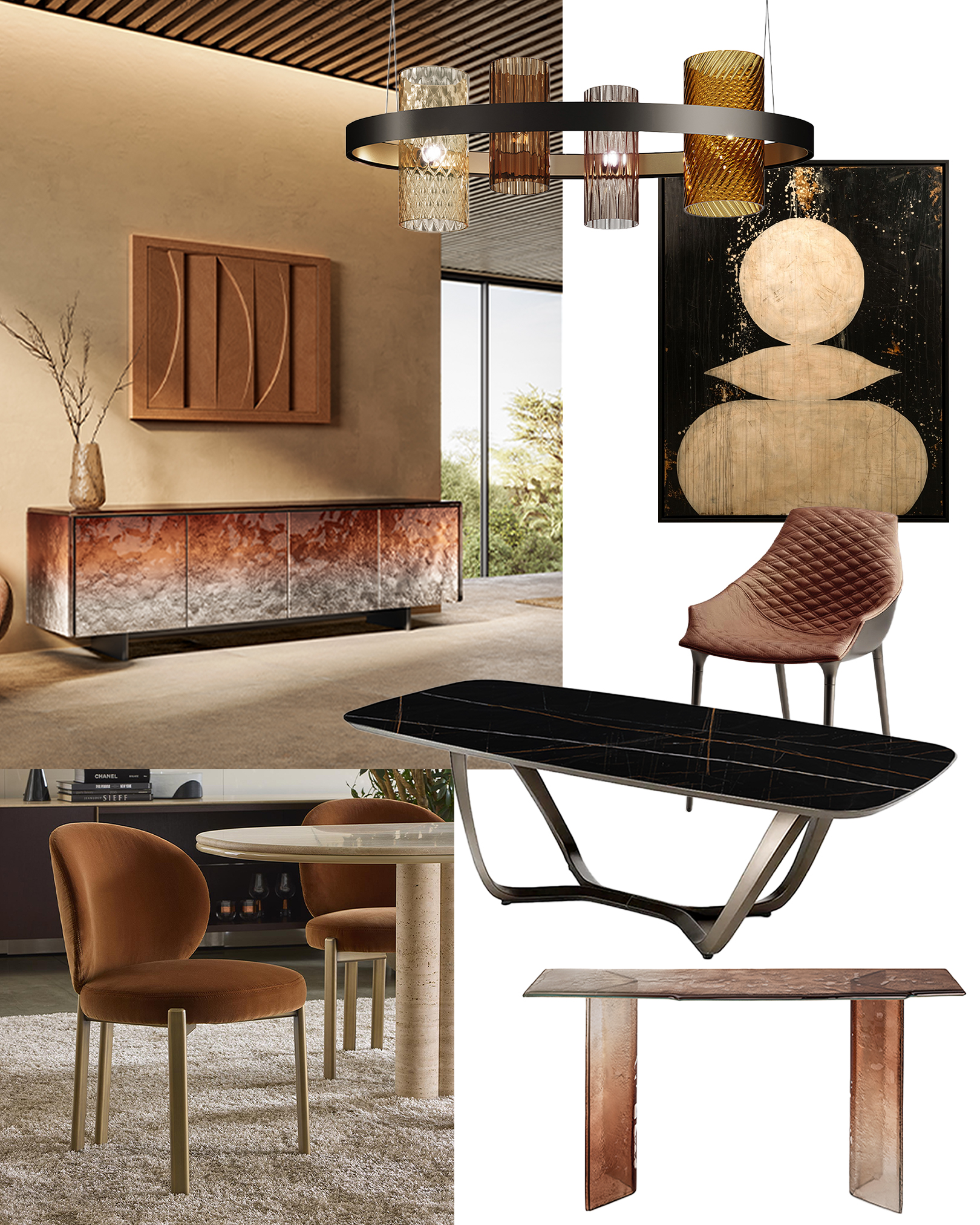 Celebrate the harmony of warm metallics and plush textures. Copper lighting, pink-champagne tone, and bronze leathers and velvets come together to create interiors that glow with timeless sophistication and modern allure. |
